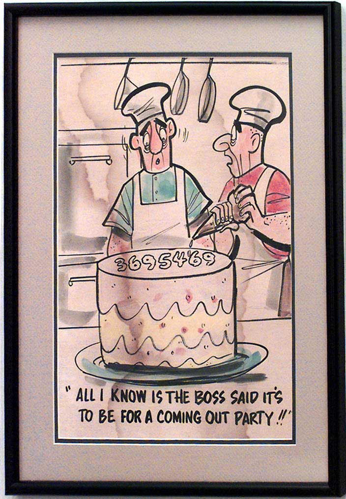 American Mid-Century (unsigned) black framed caricature watercolor of 2 chefs decorating cake with phone # ("All I know is the boss said it's to be for a coming out party")