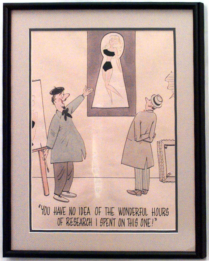 American Mid-Century (unsigned) black framed caricature watercolor of artist pointing to painting ("You have no idea of the wonderful hours of research I spent on this one!").