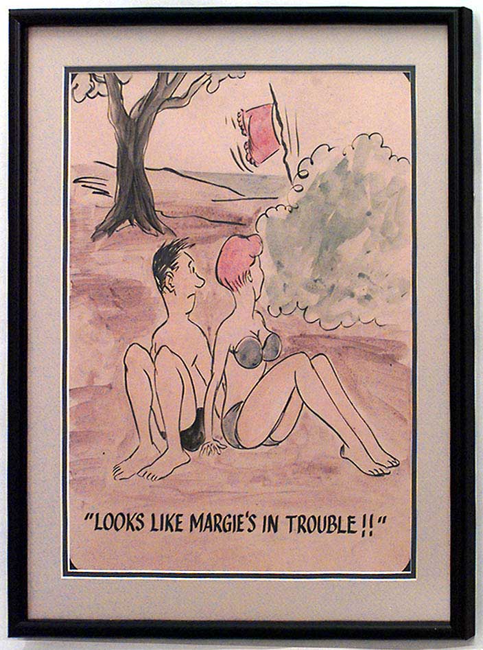 American Mid-Century (unsigned) black framed caricature watercolor of couple on beach ("Looks like Margie's in trouble!").