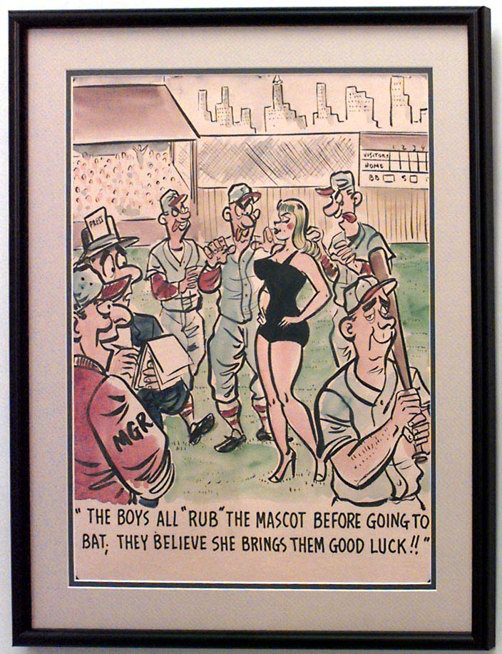 American Mid-Century (unsigned) black-framed caricature watercolor of baseball team with girl ("The boys all rub the mascot before going to bat; they believe she brings good luck!")