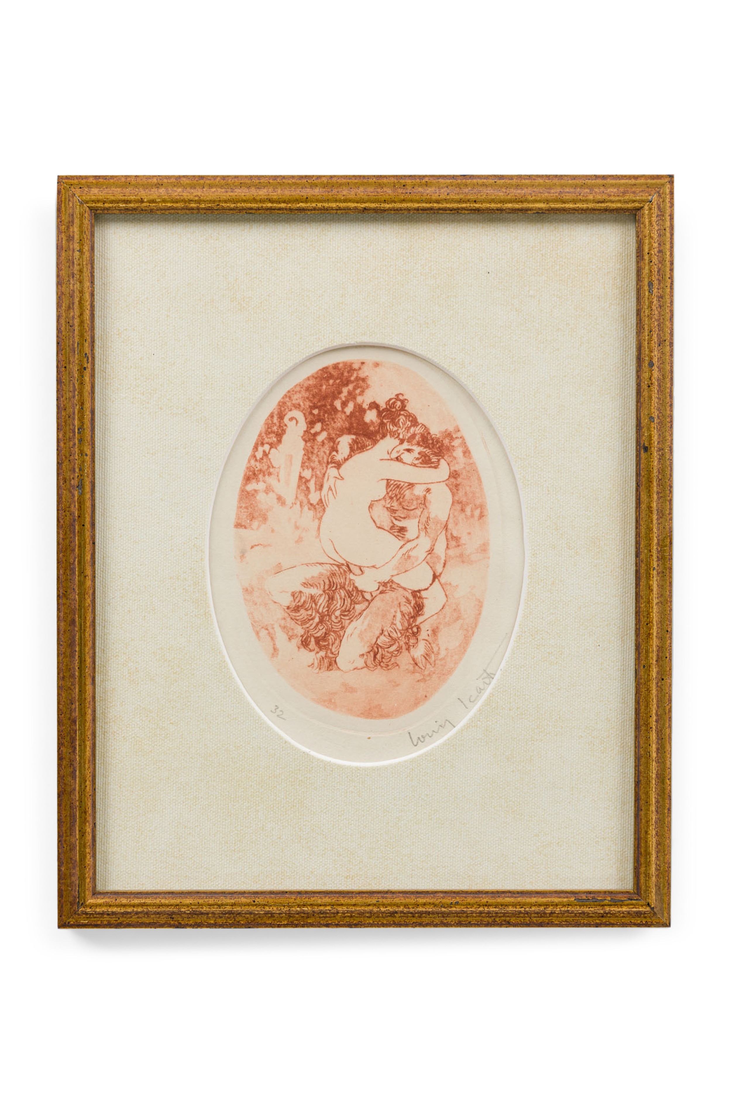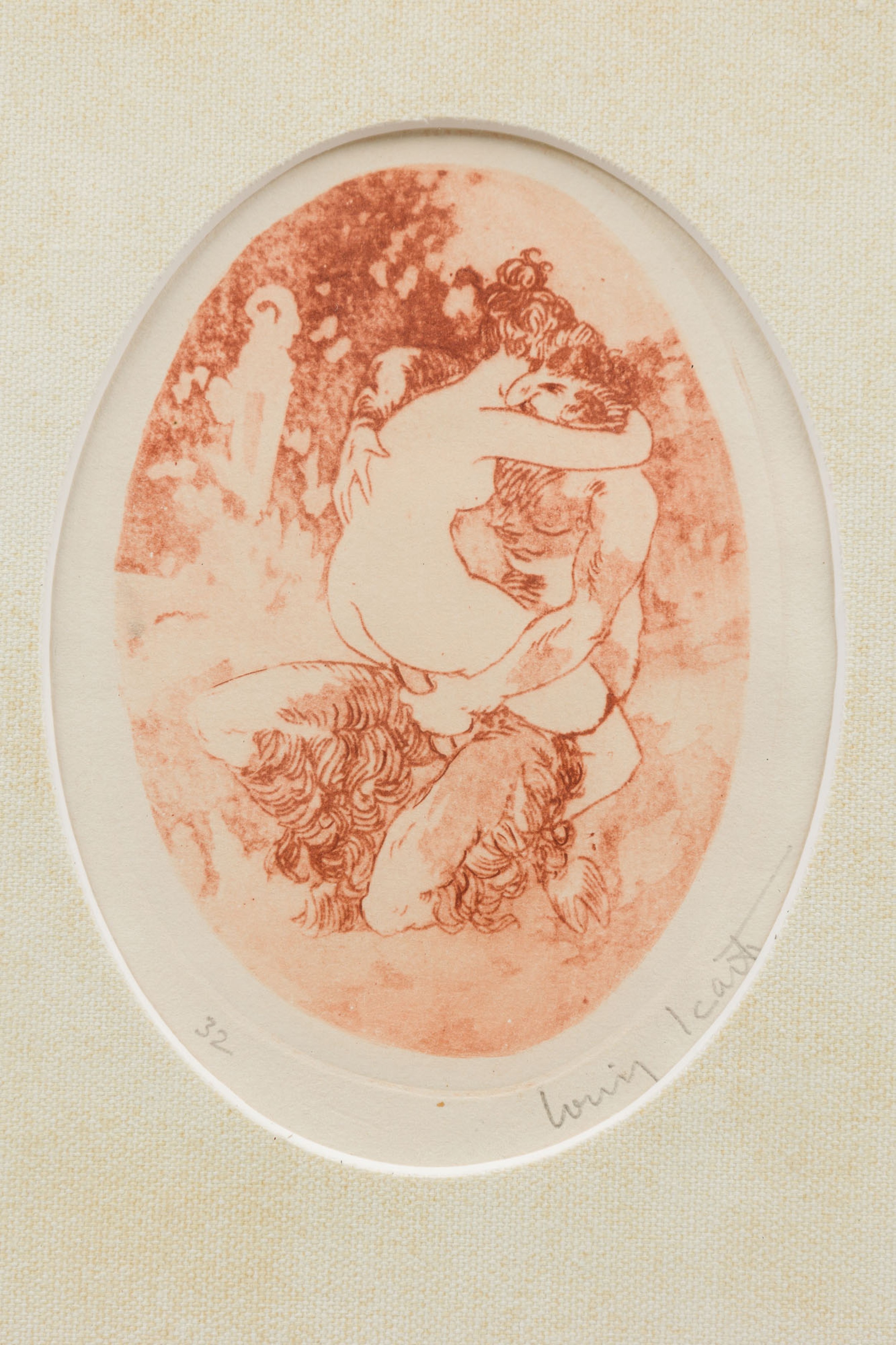 French Art Deco gilt framed lithograph with scene of satyr and lady. (signed: LOUIS ICART) (Reference: ICART by S. Michael Schnessel, pg 136).
