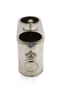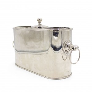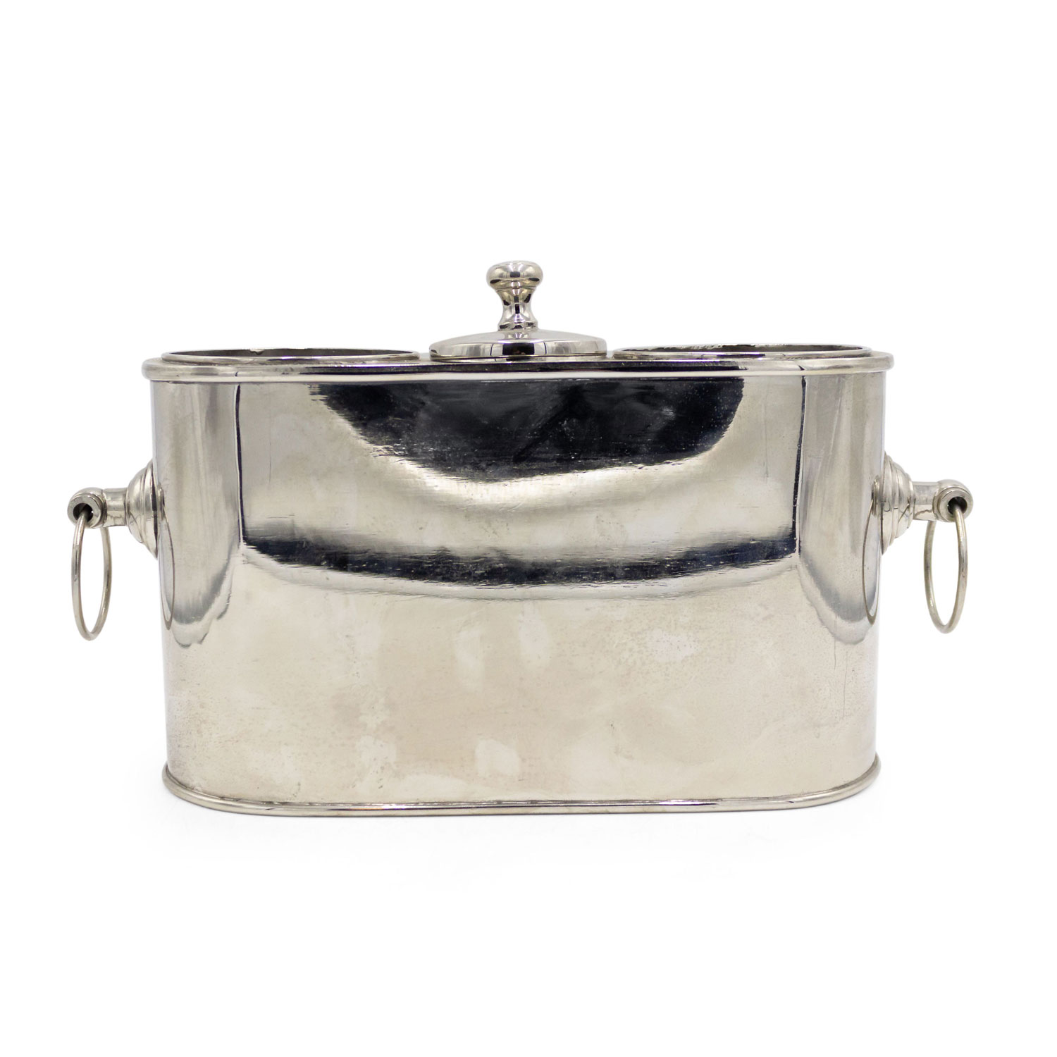 PAIR of English Art Moderne style nickel-plate oval wine coolers with a pair of wells centering an opening with a cover flanked by side ring handles. (PRICED AS PAIR).
