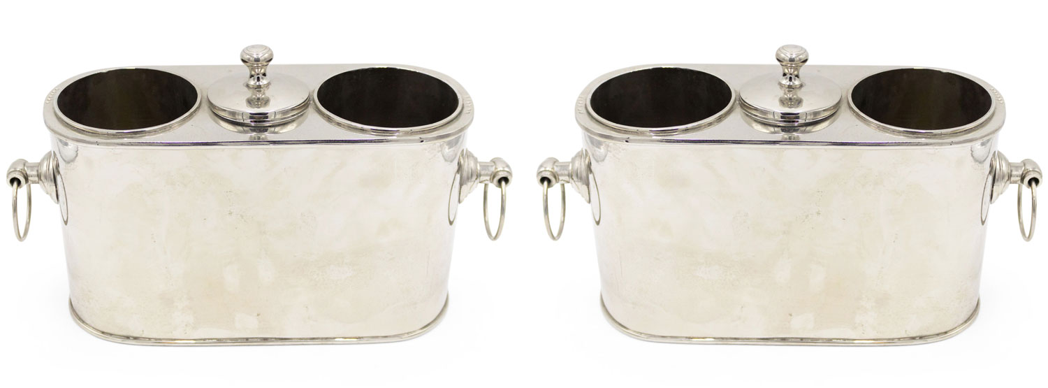 PAIR of English Art Moderne style nickel-plate oval wine coolers with a pair of wells centering an opening with a cover flanked by side ring handles. (PRICED AS PAIR)