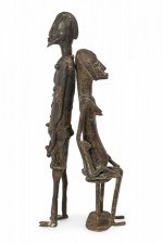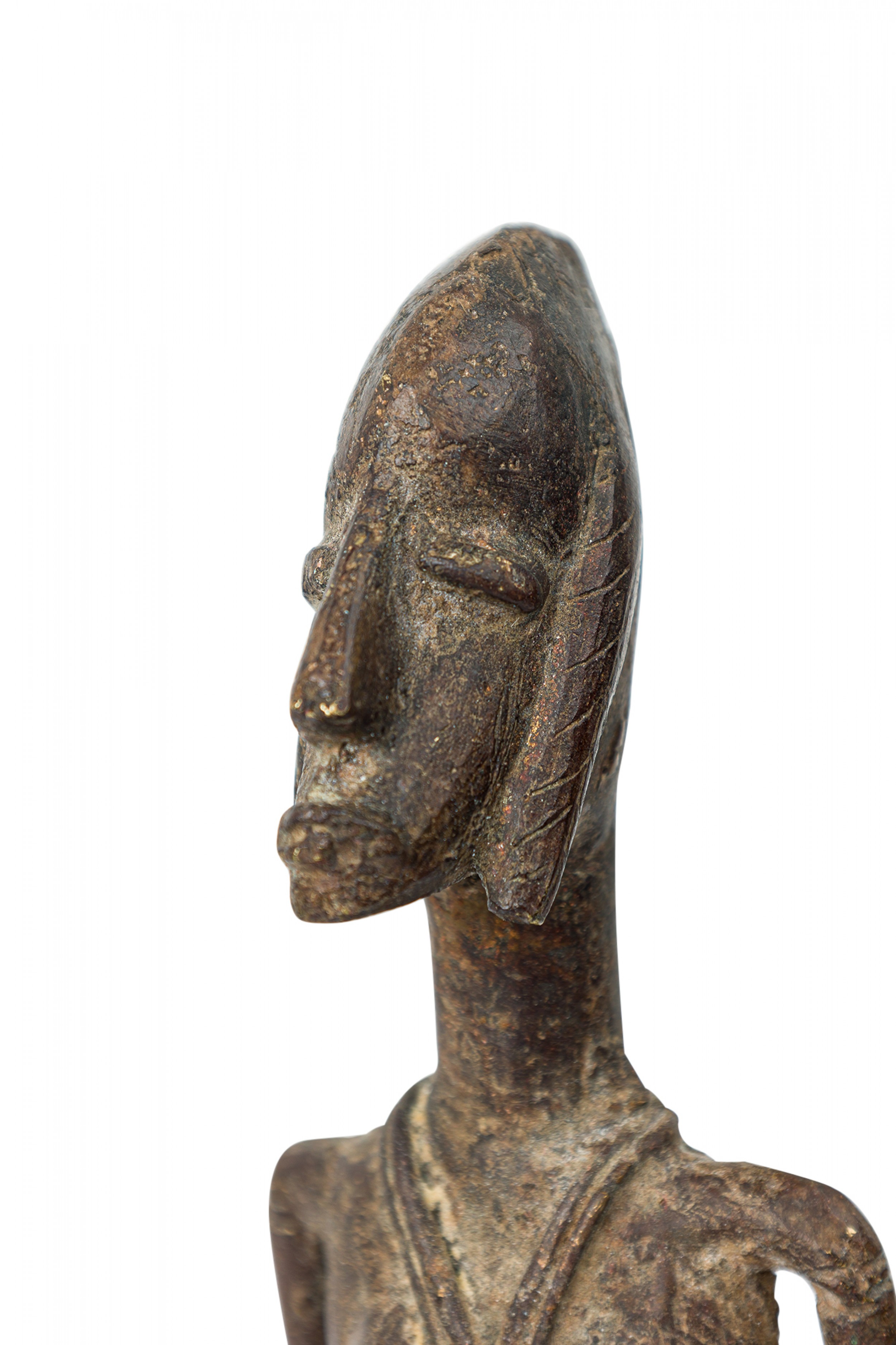 PAIR of African Mali 20th Century bronze Dogon male and female stylized ancestor figures using the lost wax process.They both share identical hair styles, alluding to the mythic pairing of the primordial Nommos, their ancestors. The female is seated with 2 children at her side. (PRICED AS PAIR)