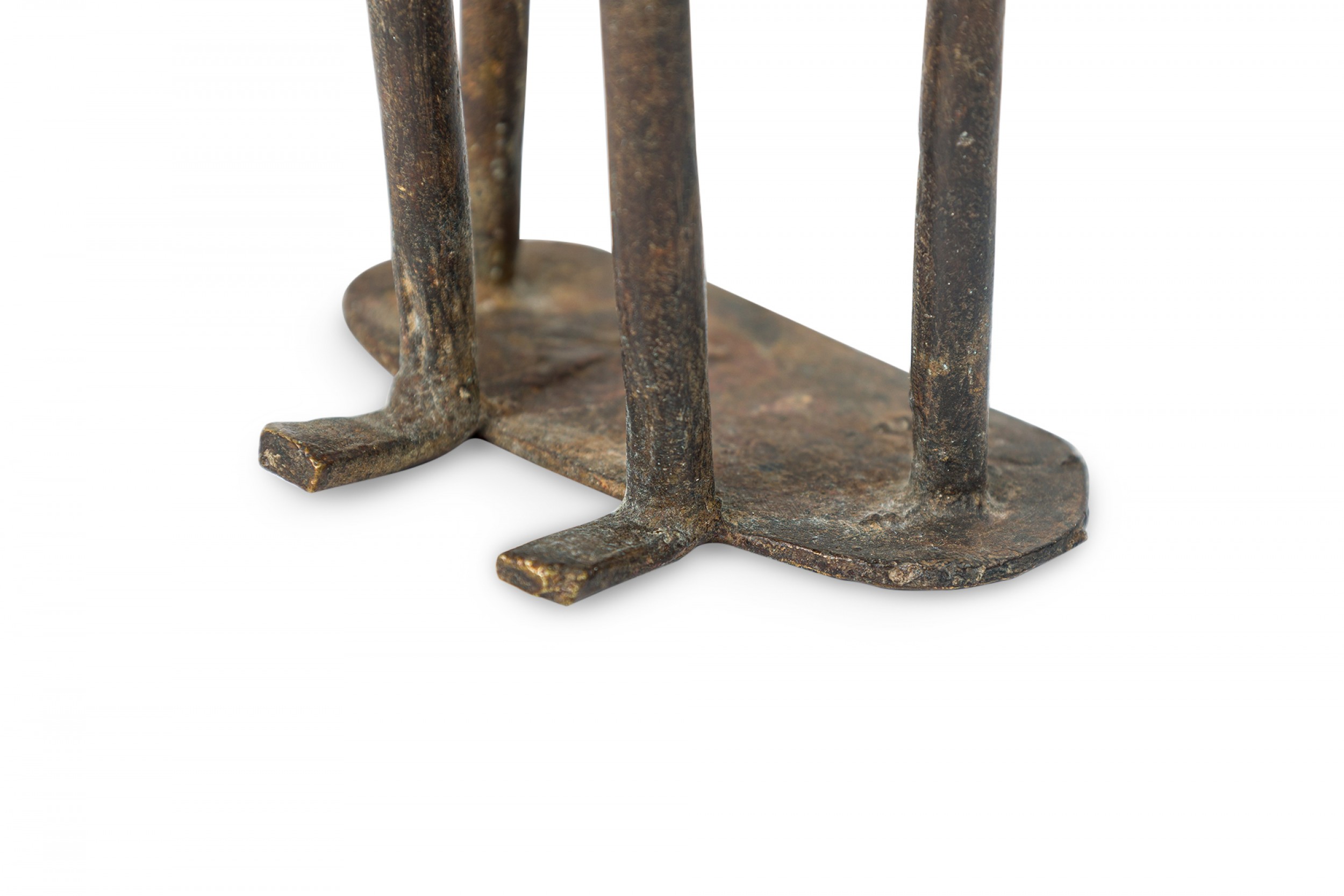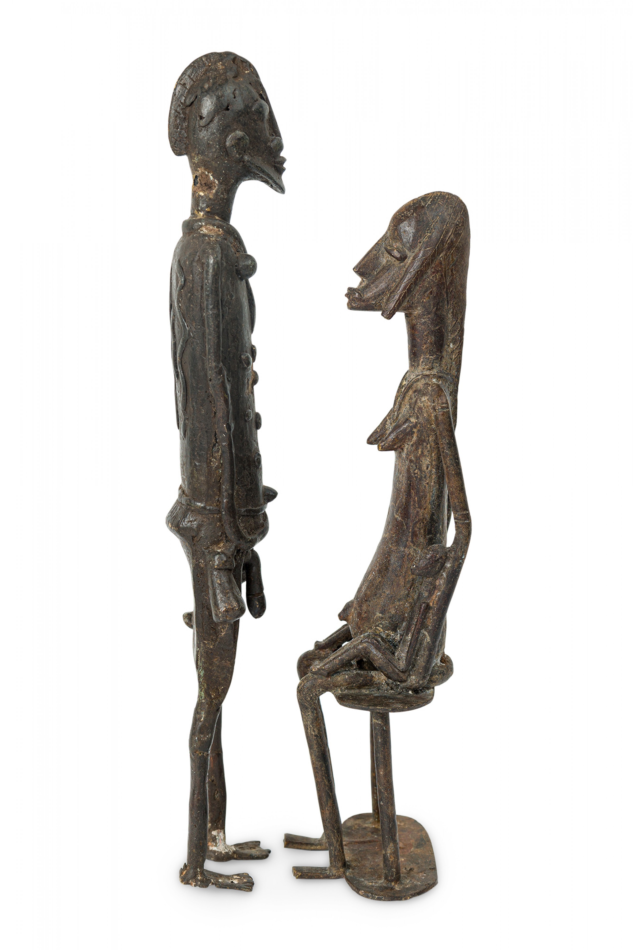 PAIR of African Mali 20th Century bronze Dogon male and female stylized ancestor figures using the lost wax process.They both share identical hair styles, alluding to the mythic pairing of the primordial Nommos, their ancestors. The female is seated with 2 children at her side. (PRICED AS PAIR).