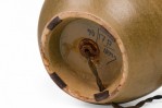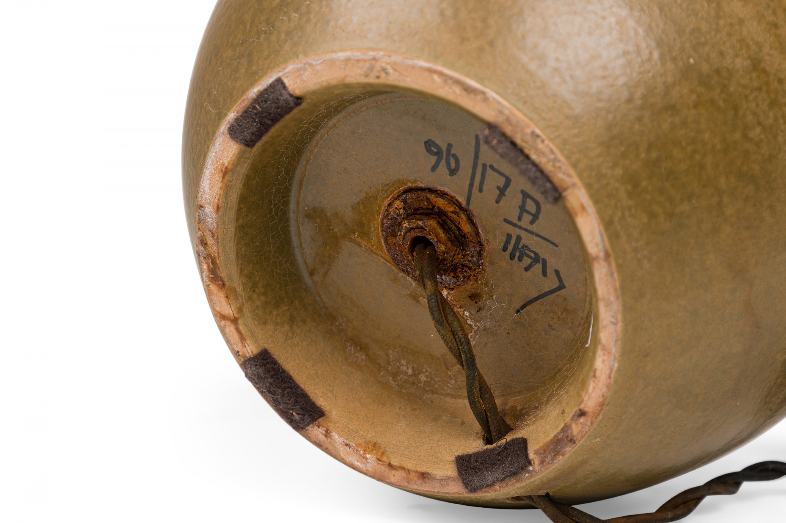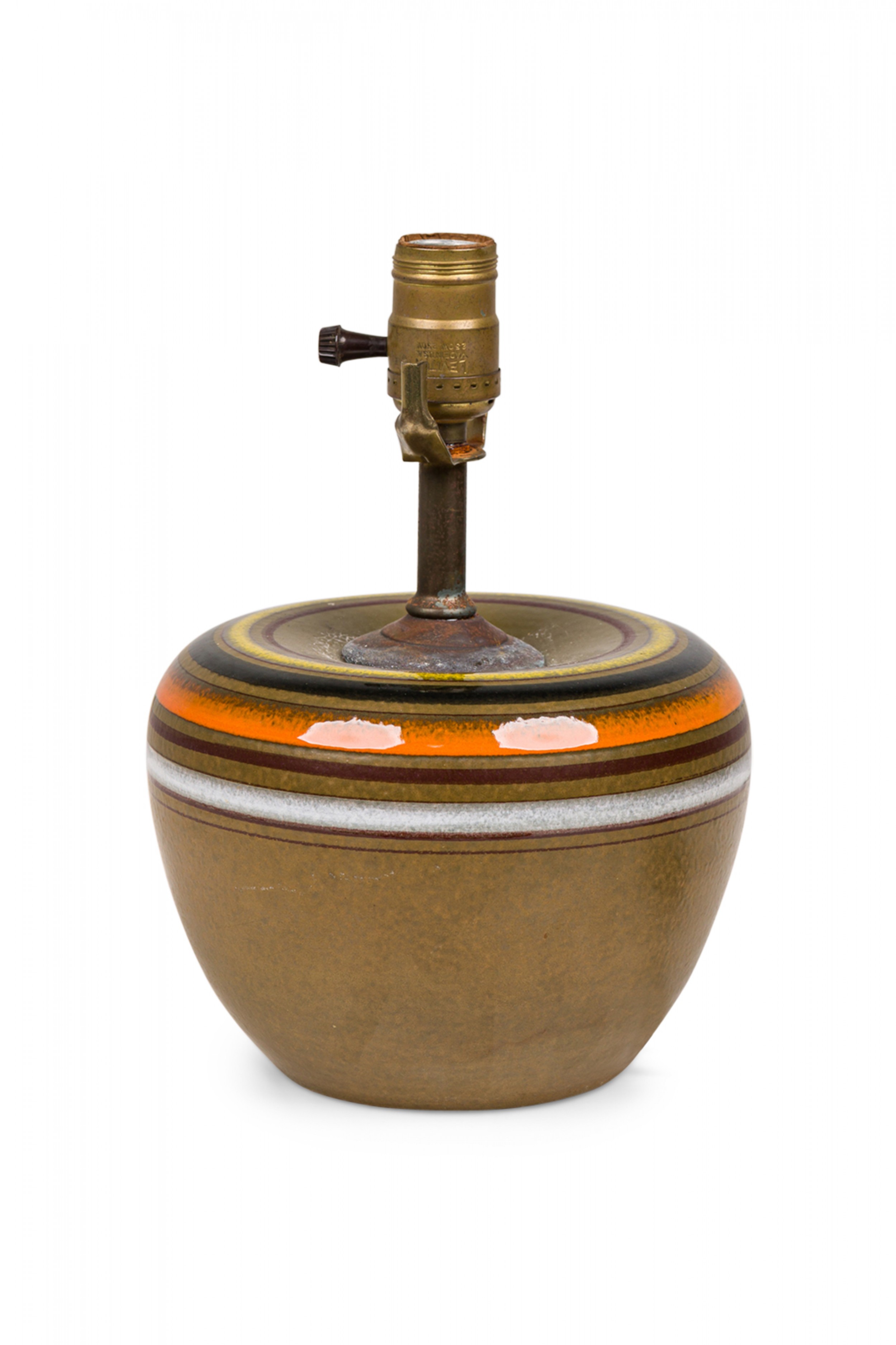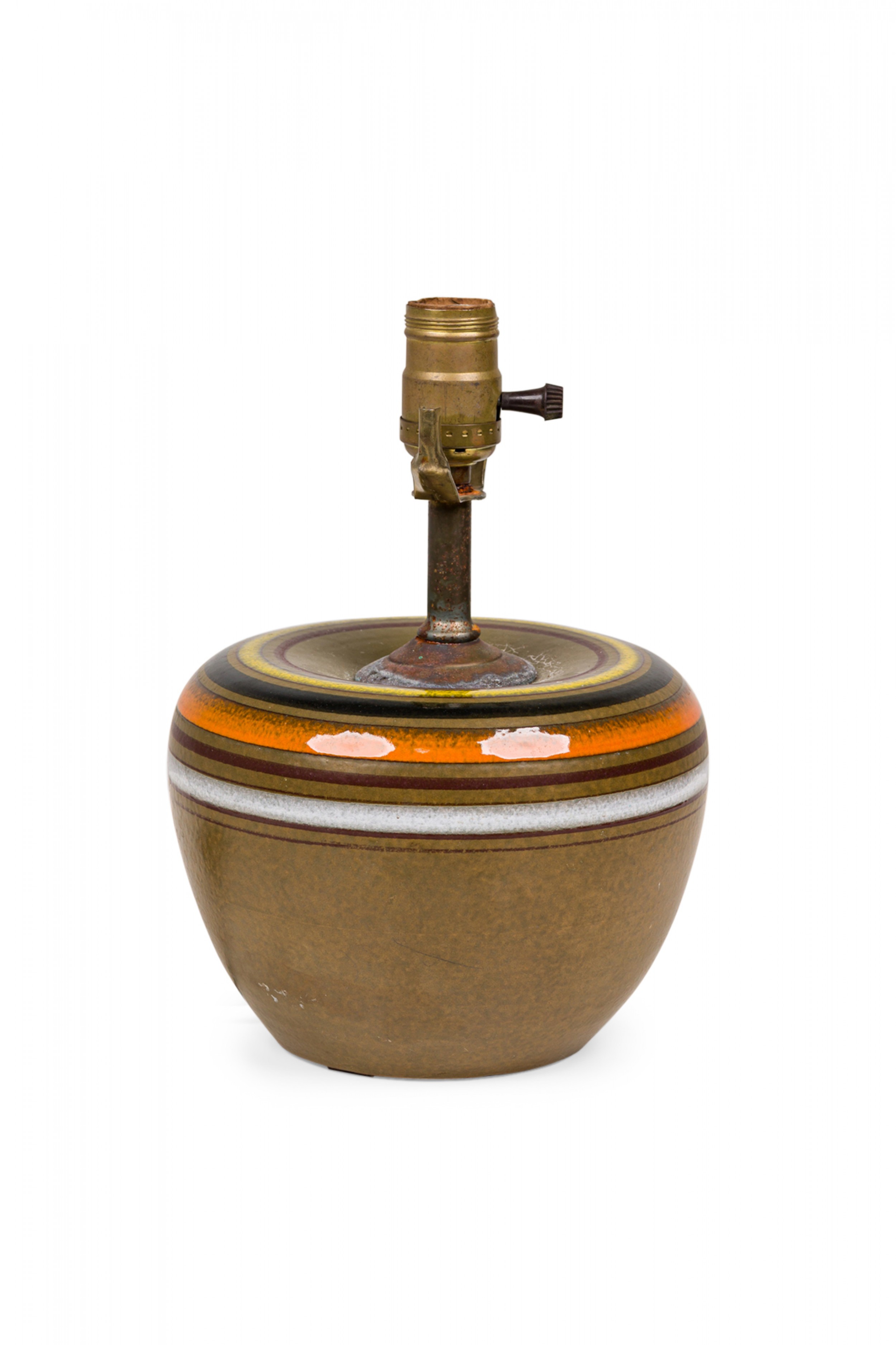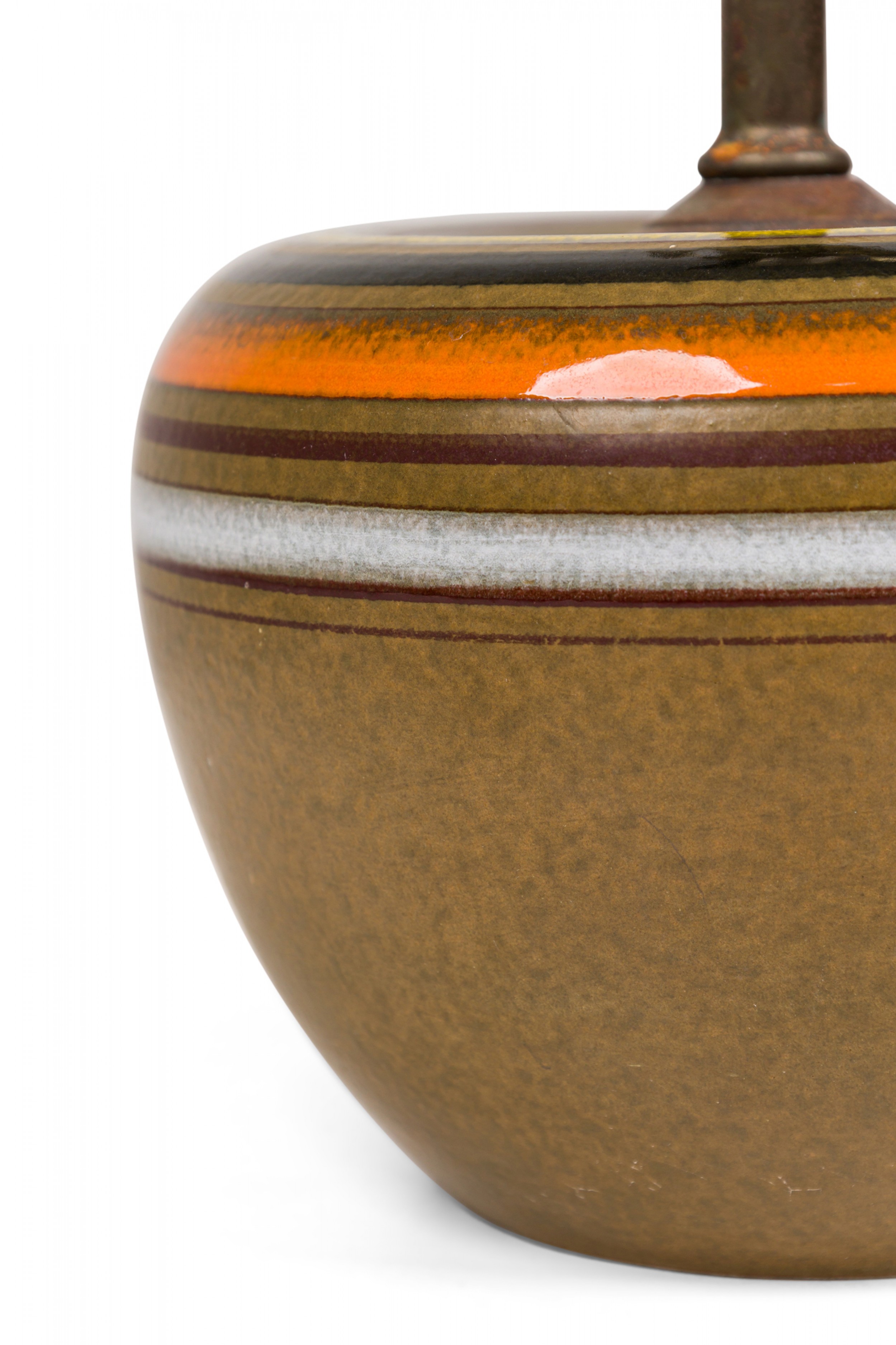 PAIR of Mid-Century Italian ceramic table lamps from Bitossi’s "Fascie Colorate" line (or Colored Stripes) in tapered ovoid form featuring an incurved top with brass stem and two functioning light sockets with an on / off switch, the shoulder encircled by glossy yellow, black, orange and white glazed stripes over a matte olive green glaze. (ALDO LONDI FOR BITOSSI AND ROSENTHAL-NETTER) (PRICED AS PAIR)
