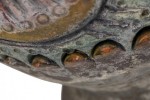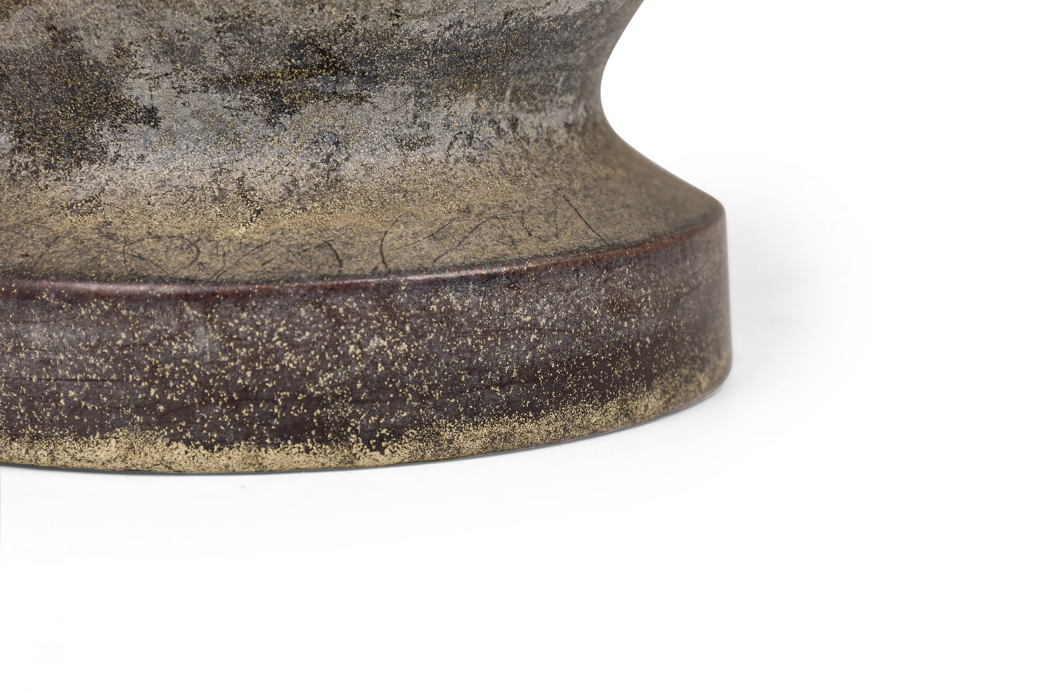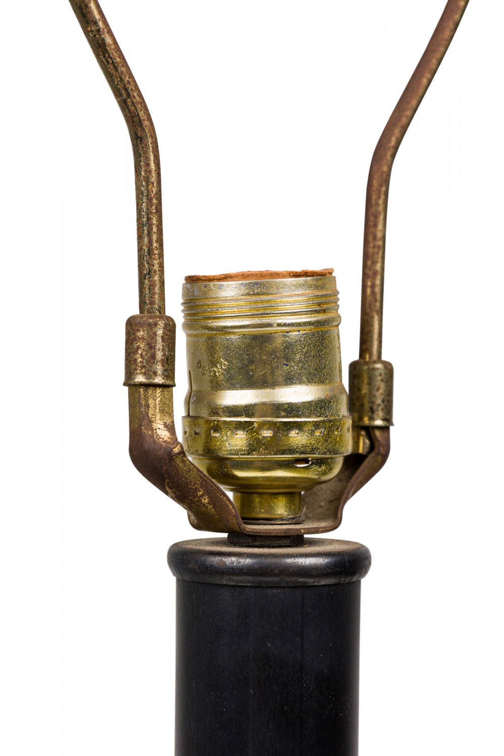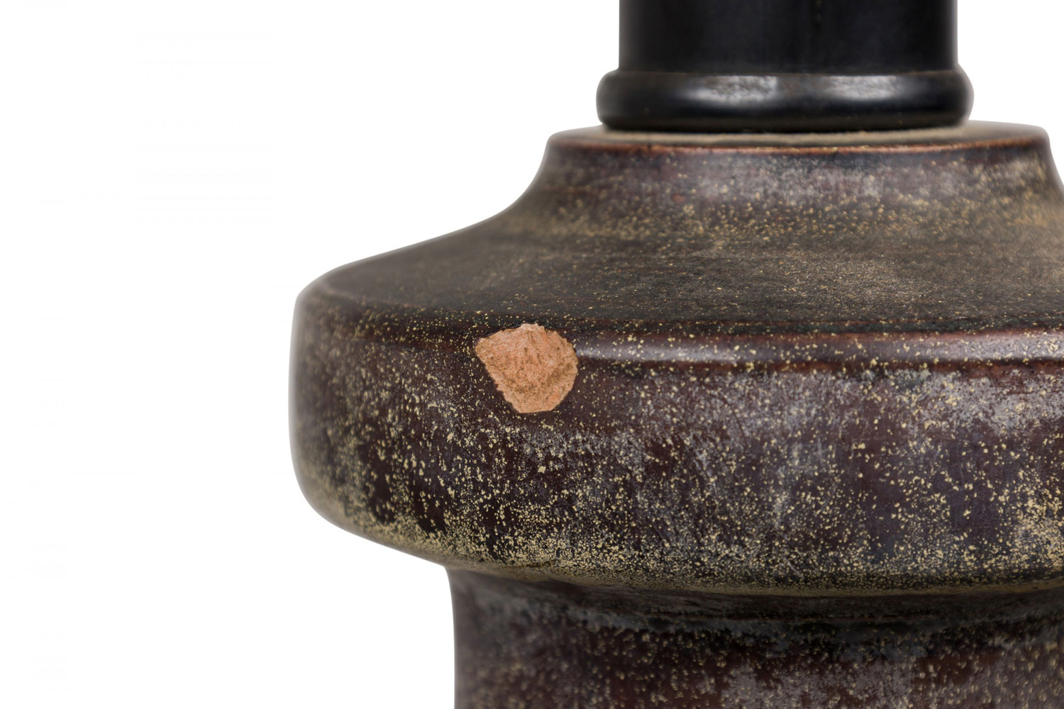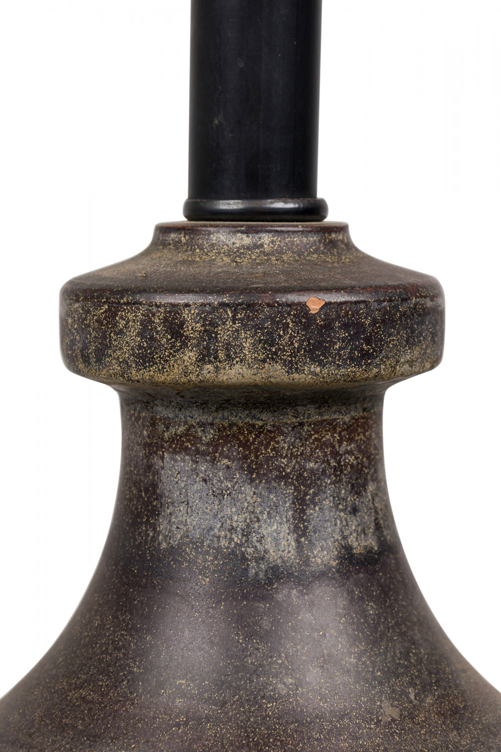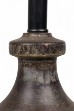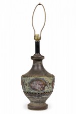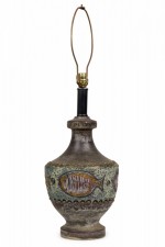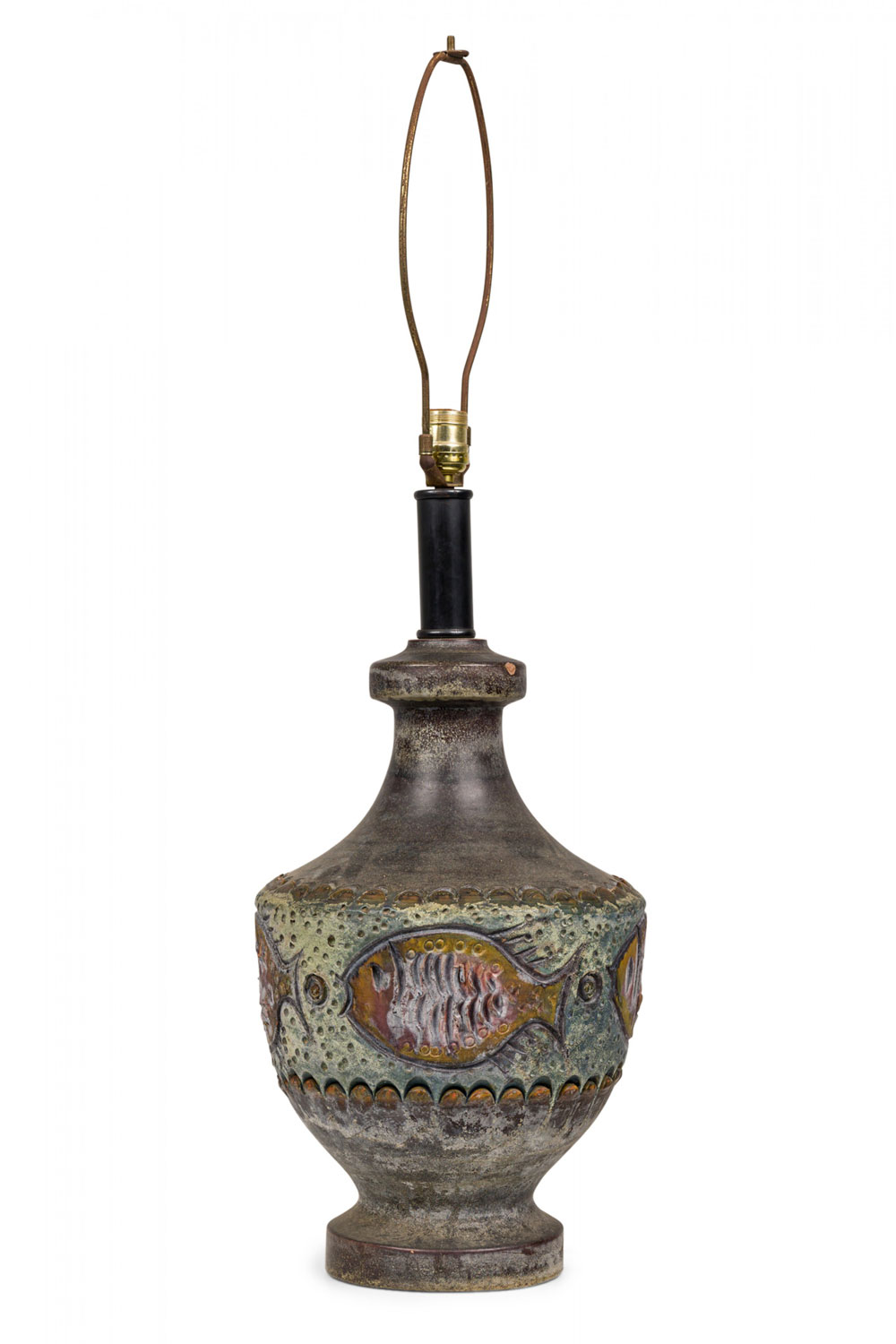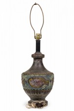 Style: Mid-Century Materials & Techniques: Brass, ceramic, incised, metal, sculpted Category: Lighting Condition: 34" height with harp. Some chip losses. Electric working. Ships without shade. Good; Minor losses
