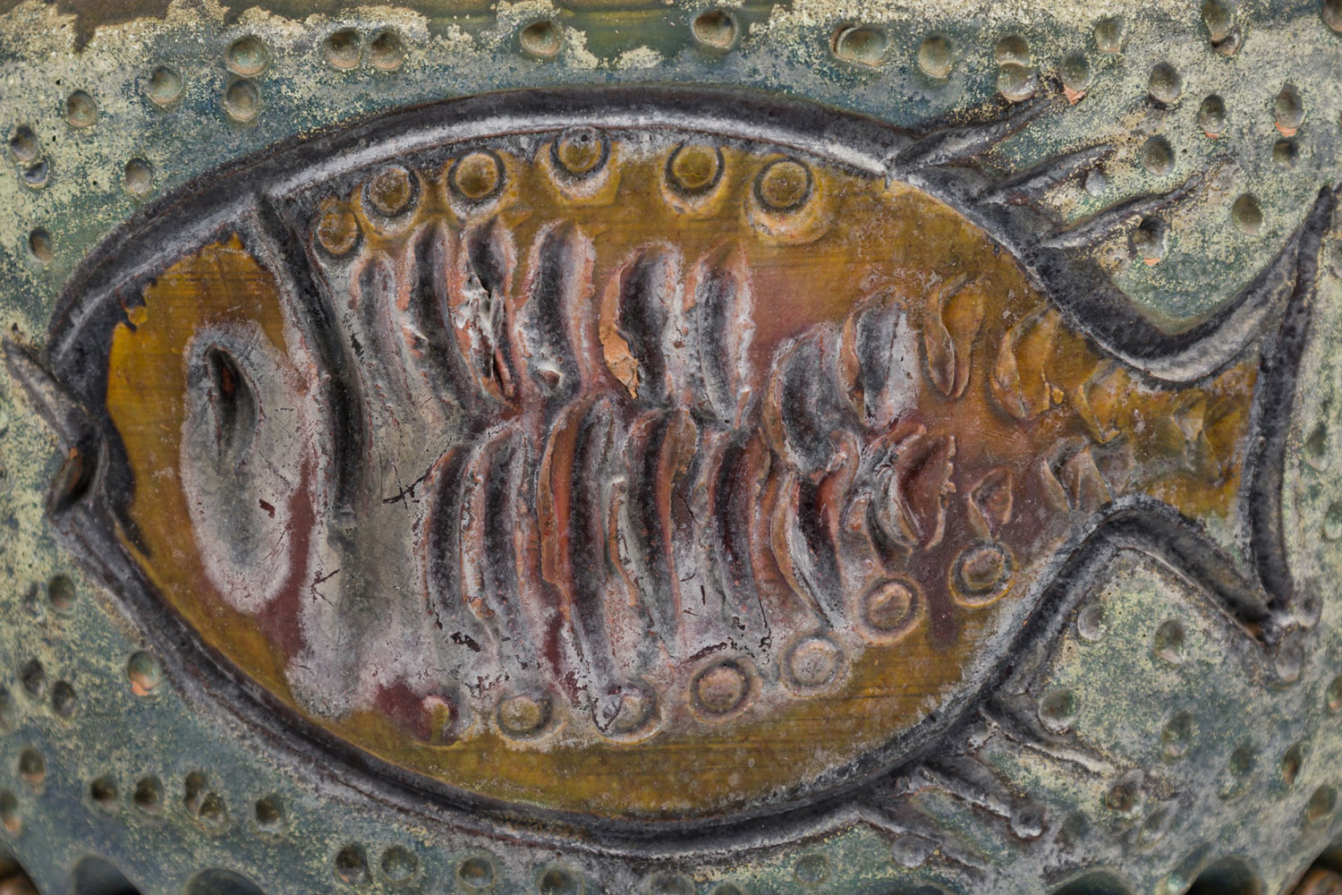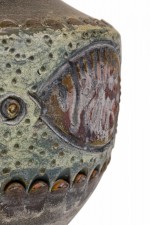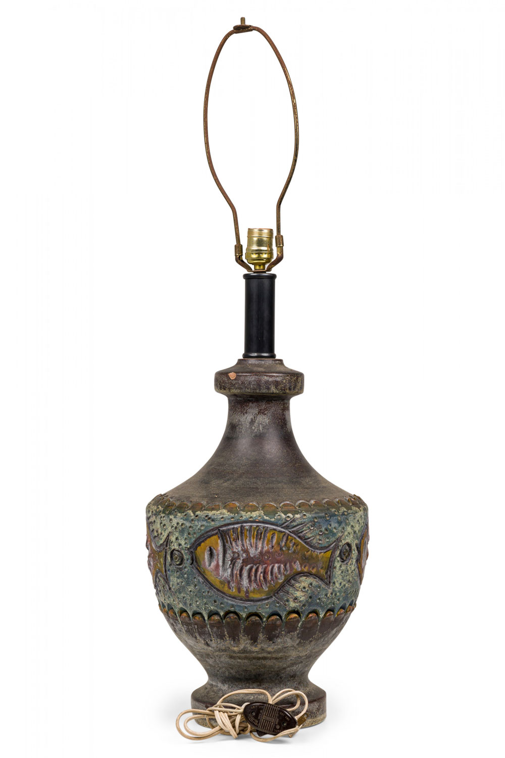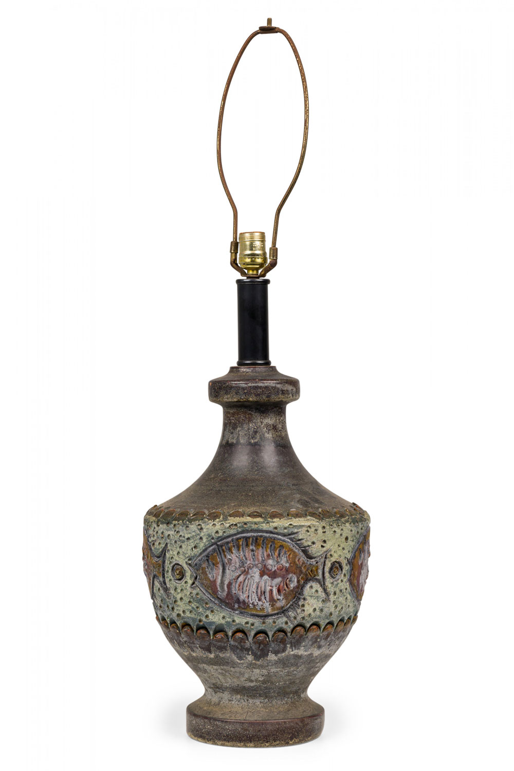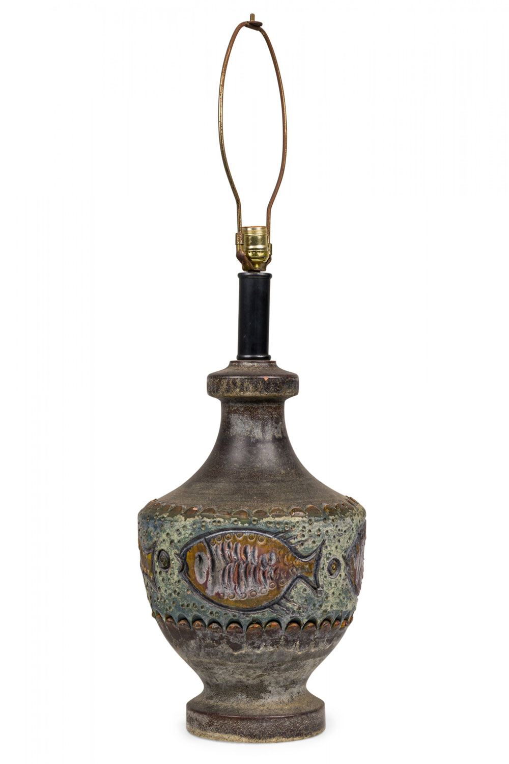 PAIR of Mid-Century Italian ceramic table lamps in footed ovoid form with waisted neck, housing a dark metal stem, both with functioning brass light switch sockets plus harps. The mottled taupe glazed body is surrounded by an incised marine-themed glazed stripe featuring stylized fish floating over a dotted beige ground between sculpted petal borders. (ALVINO BAGNI FOR BITOSSI) (PRICED AS PAIR)