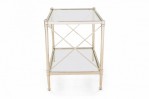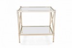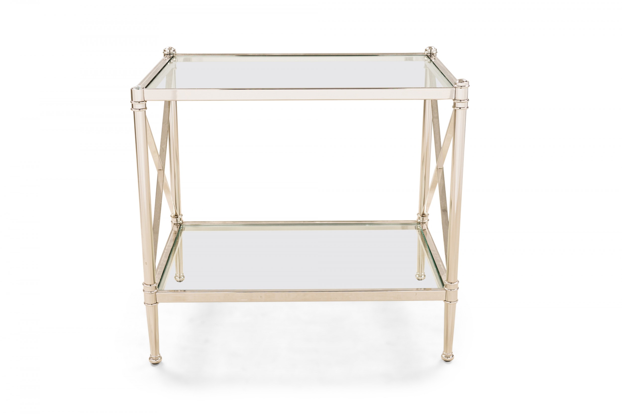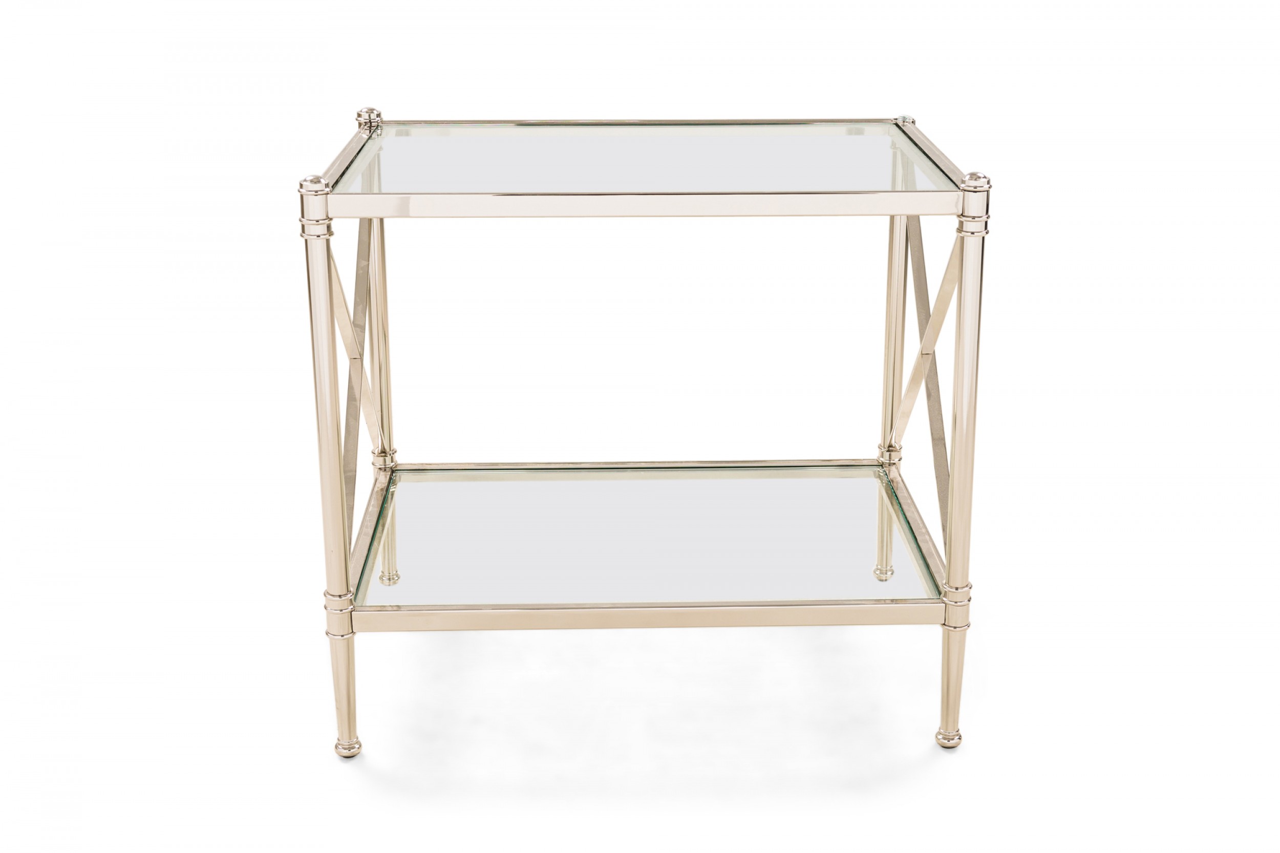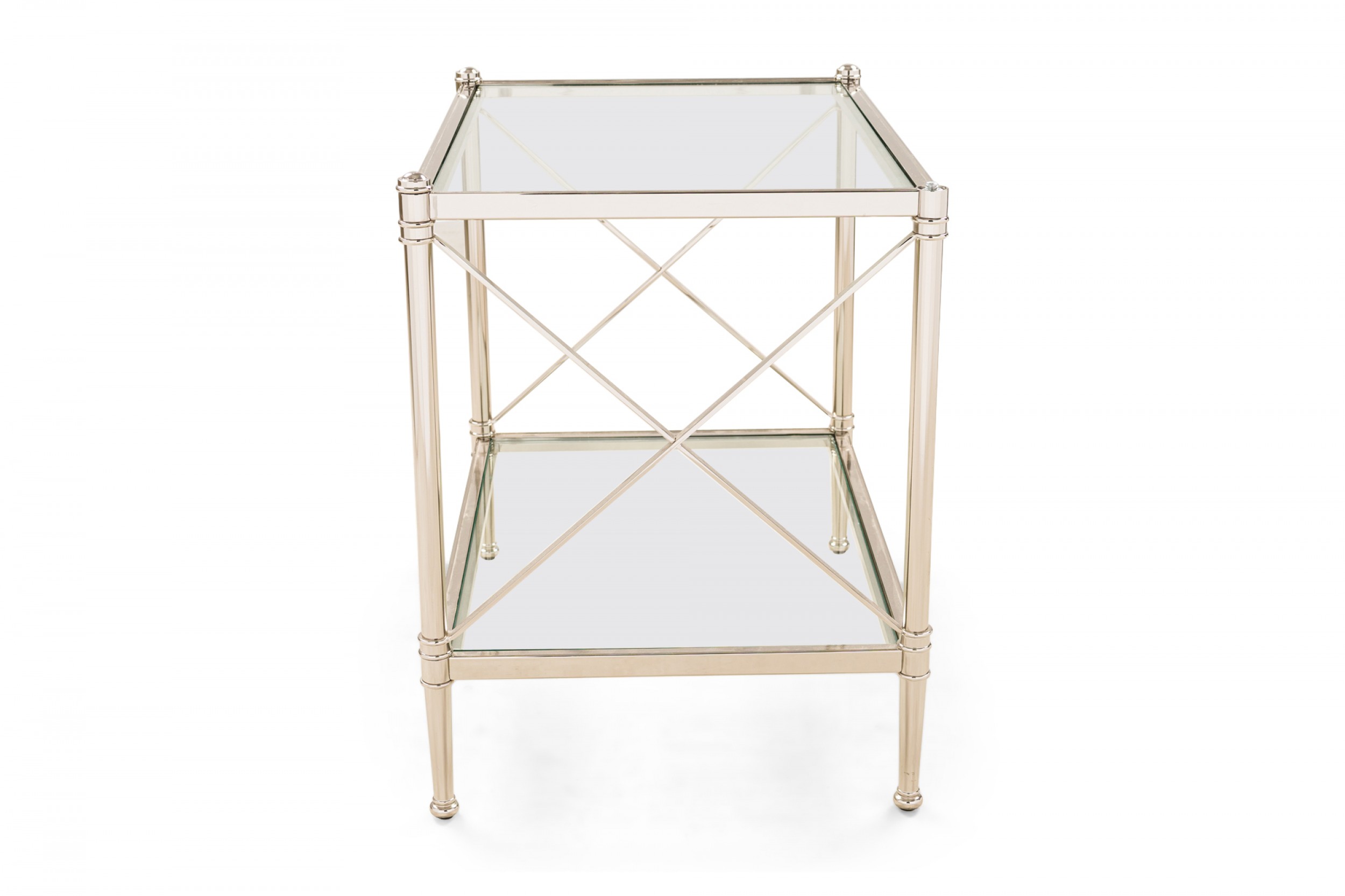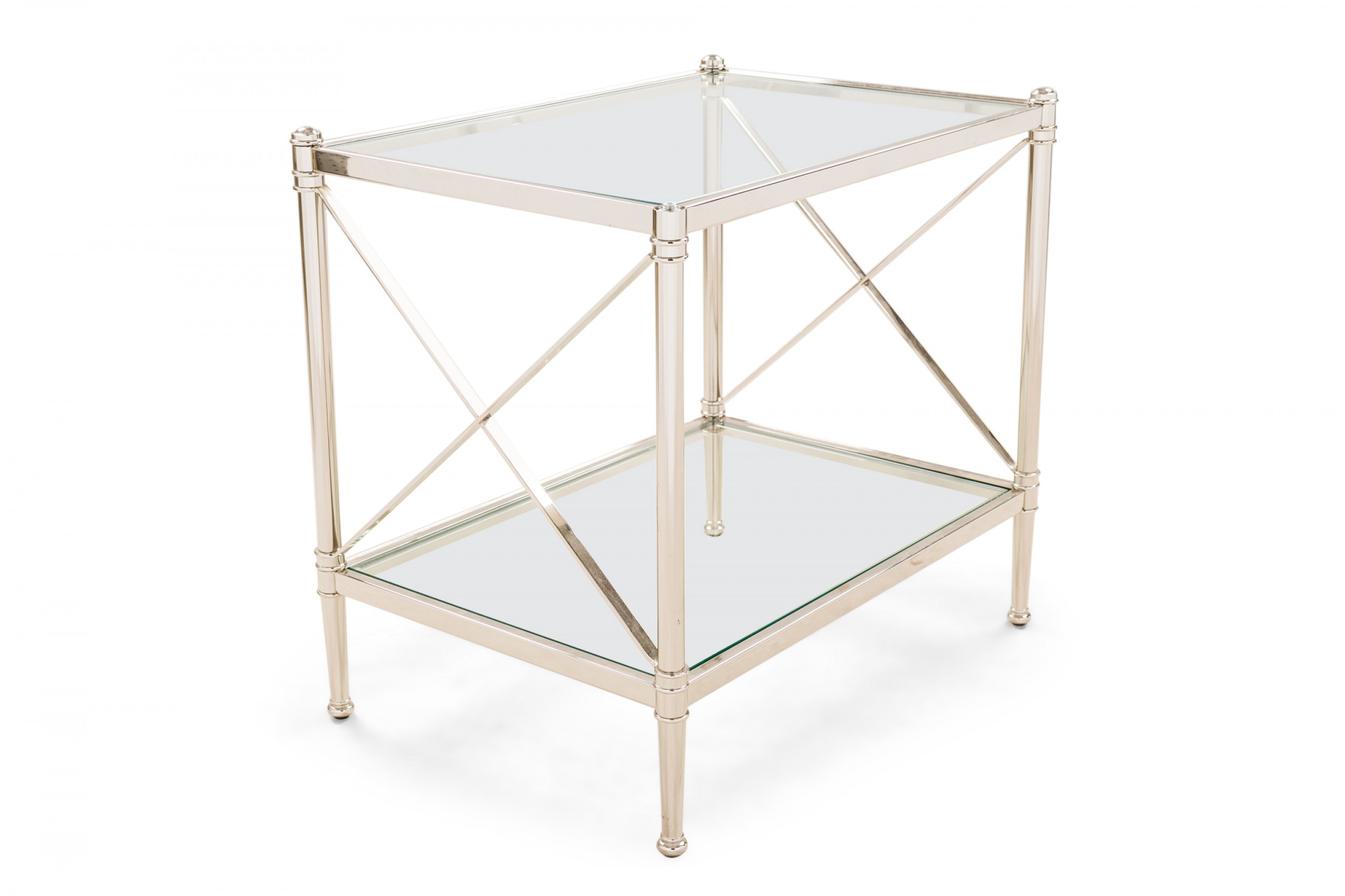PAIR of American Mid-Century Neo-classic style chrome-plated metal rectangular end / side tables with inset glass top and bottom shelf having an "X" design sides (PRICED AS PAIR)