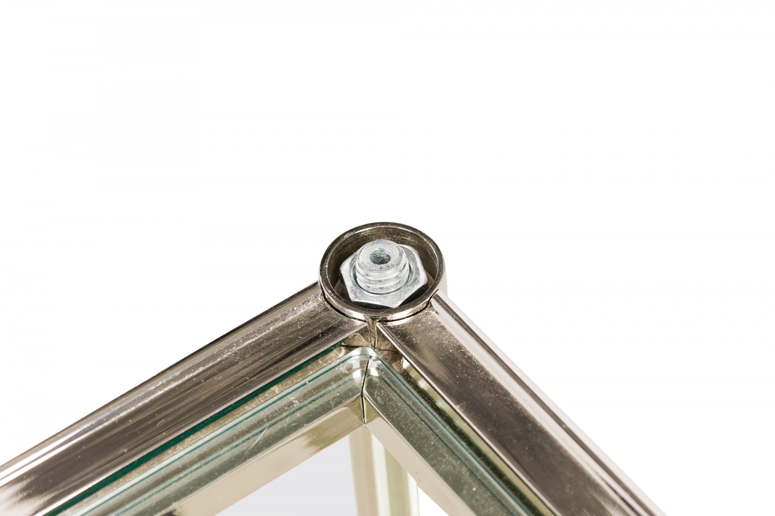 Style: Mid-Century Materials & Techniques: Chrome, glass, metal Category: Tables Condition: One circular cap missing. Good; Wear consistent with age and use