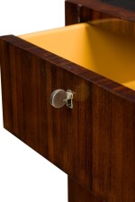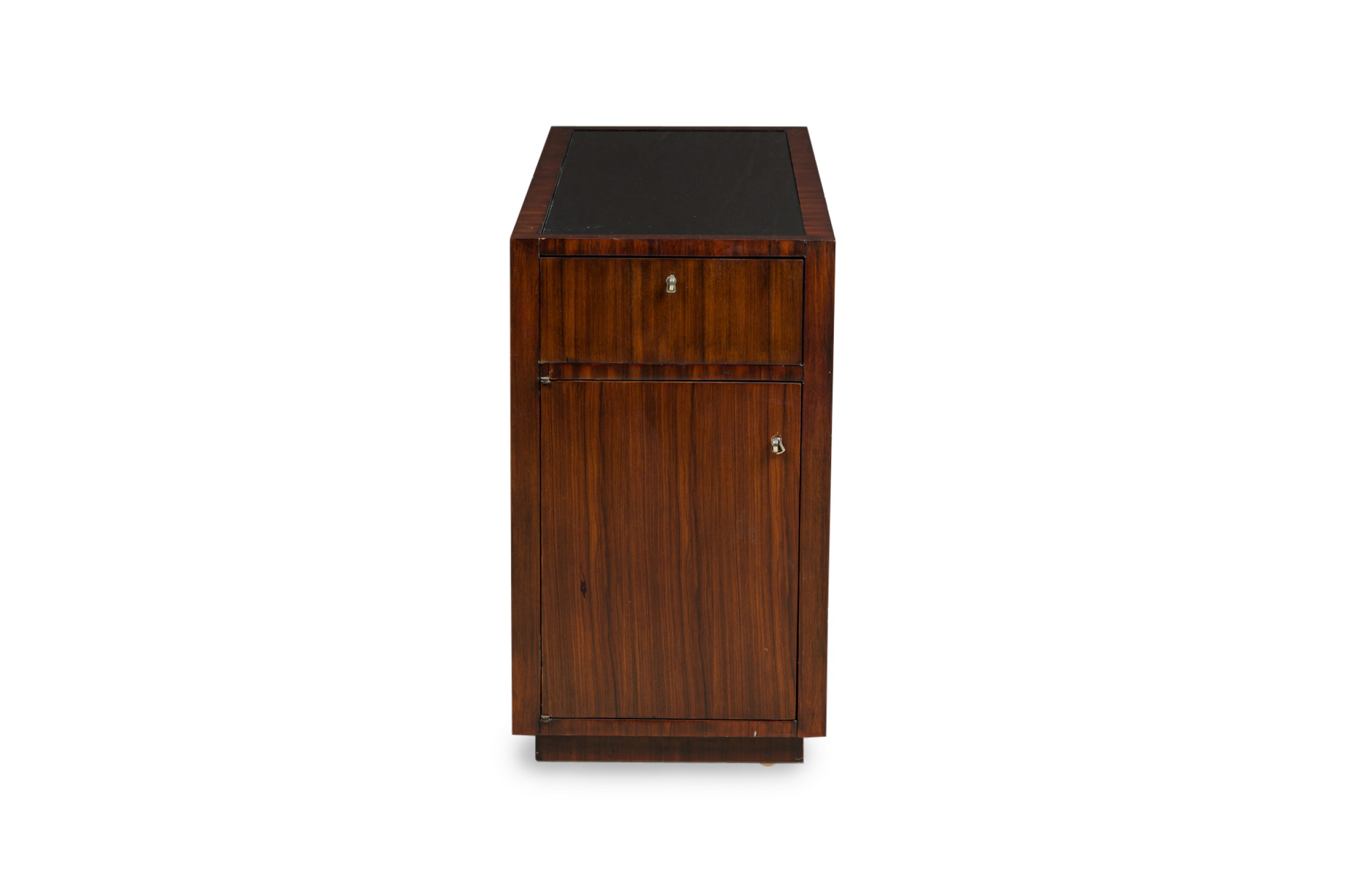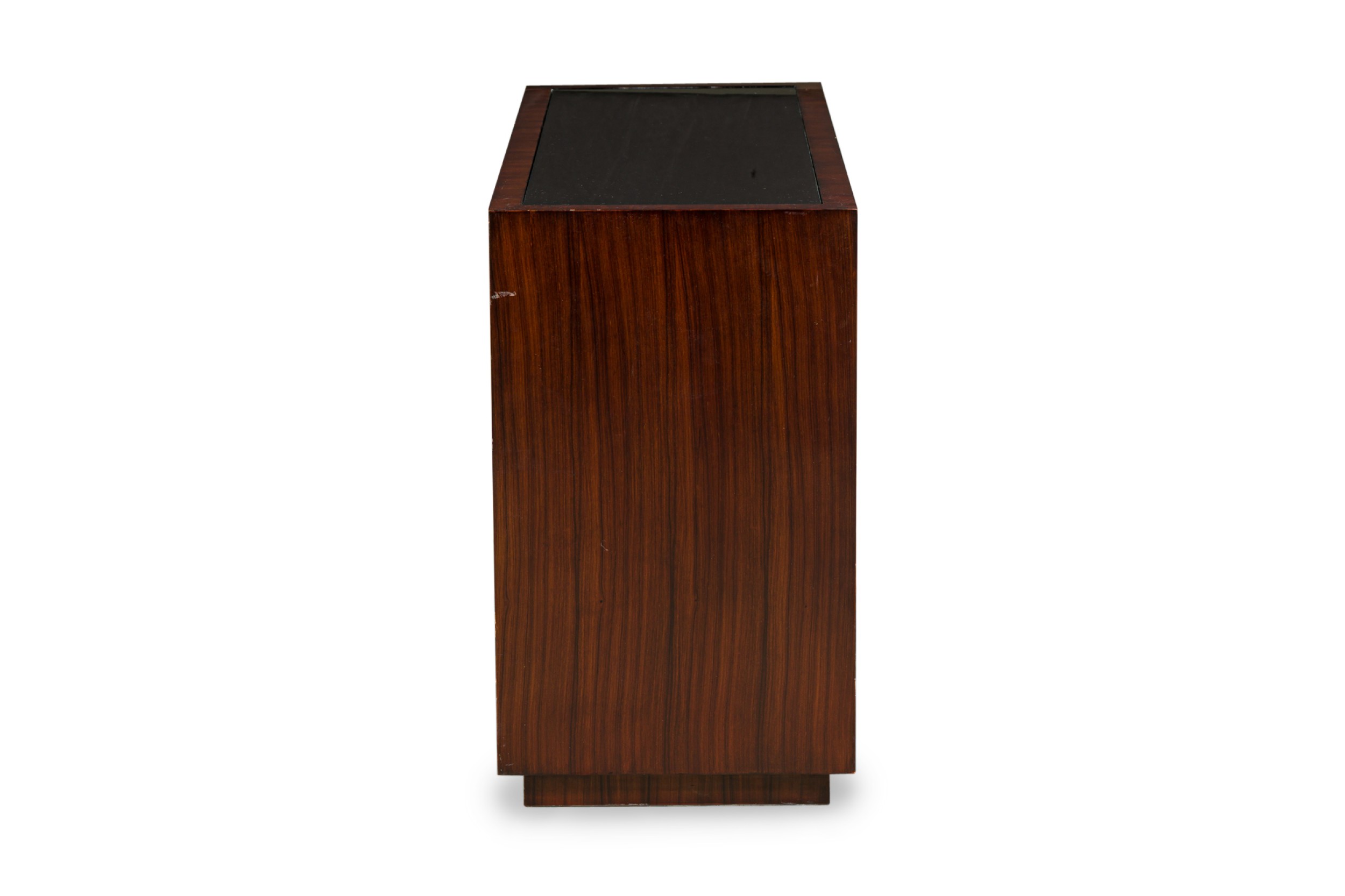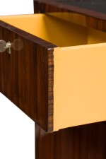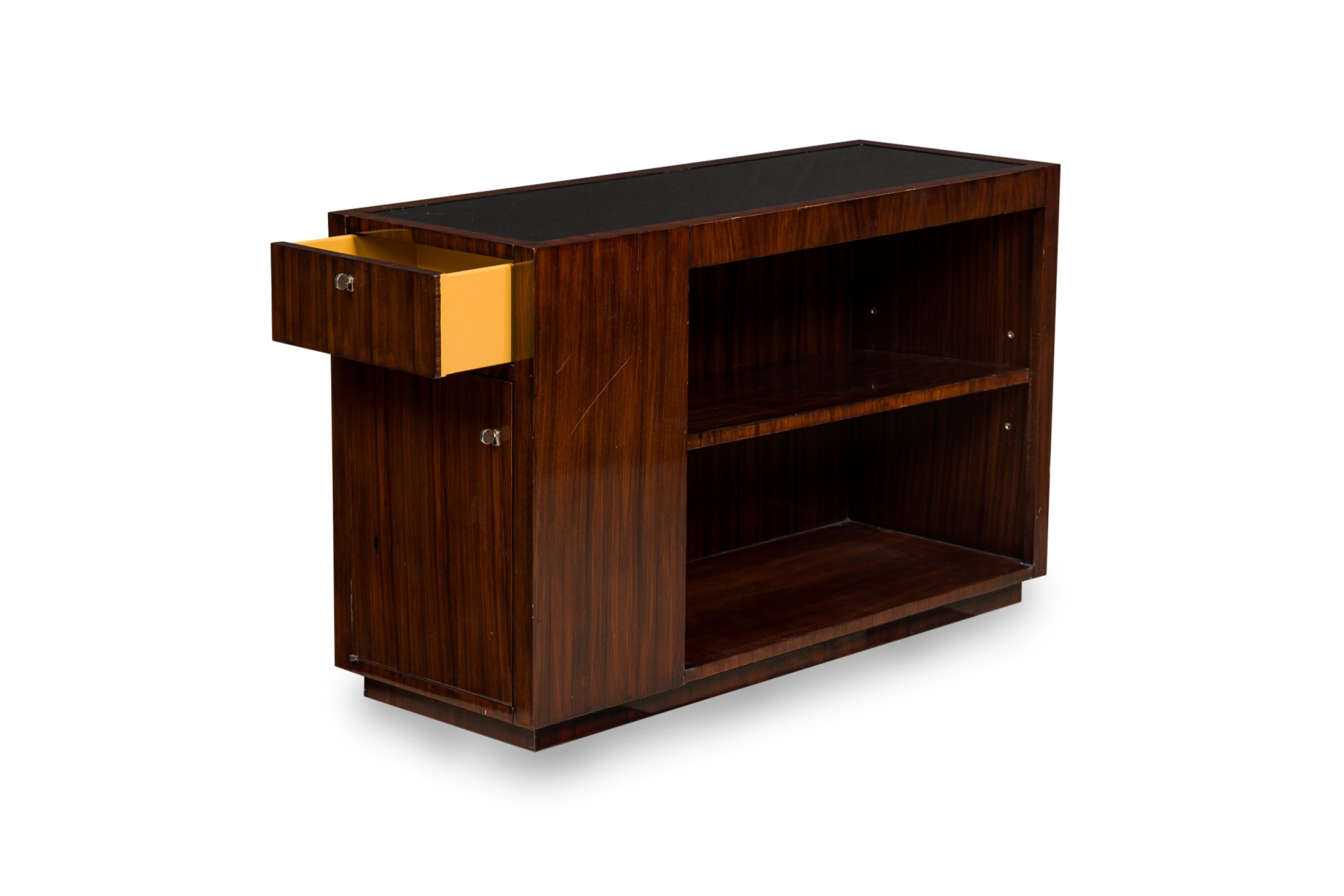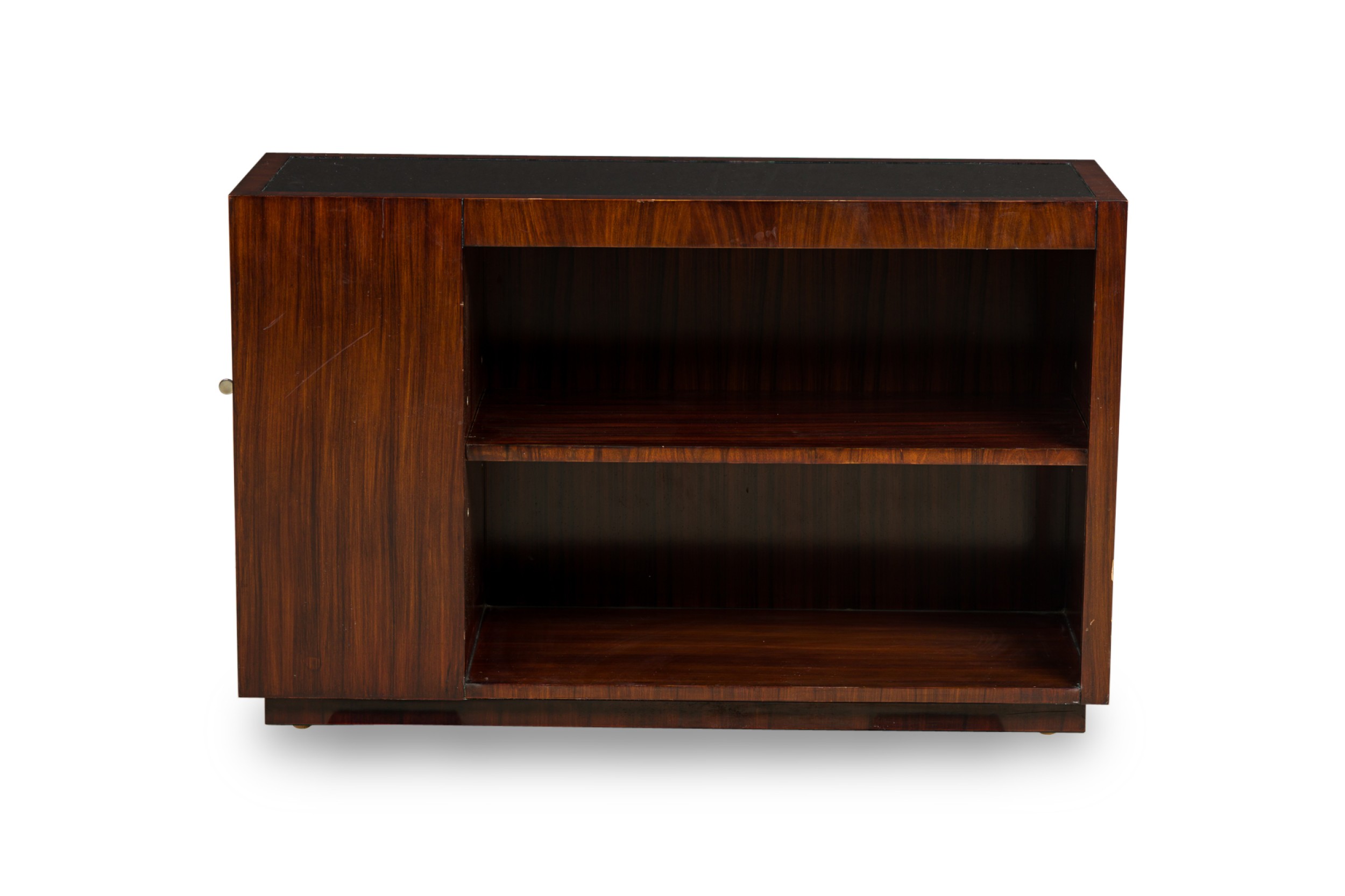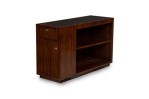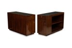 PAIR of Art Deco style Mid-Century American ebony de macassar cabinets featuring an open front storage area with one shelf plus a pullout drawer and compartment on the left side. One cabinet has an inlaid glass top. (PRICED AS PAIR).