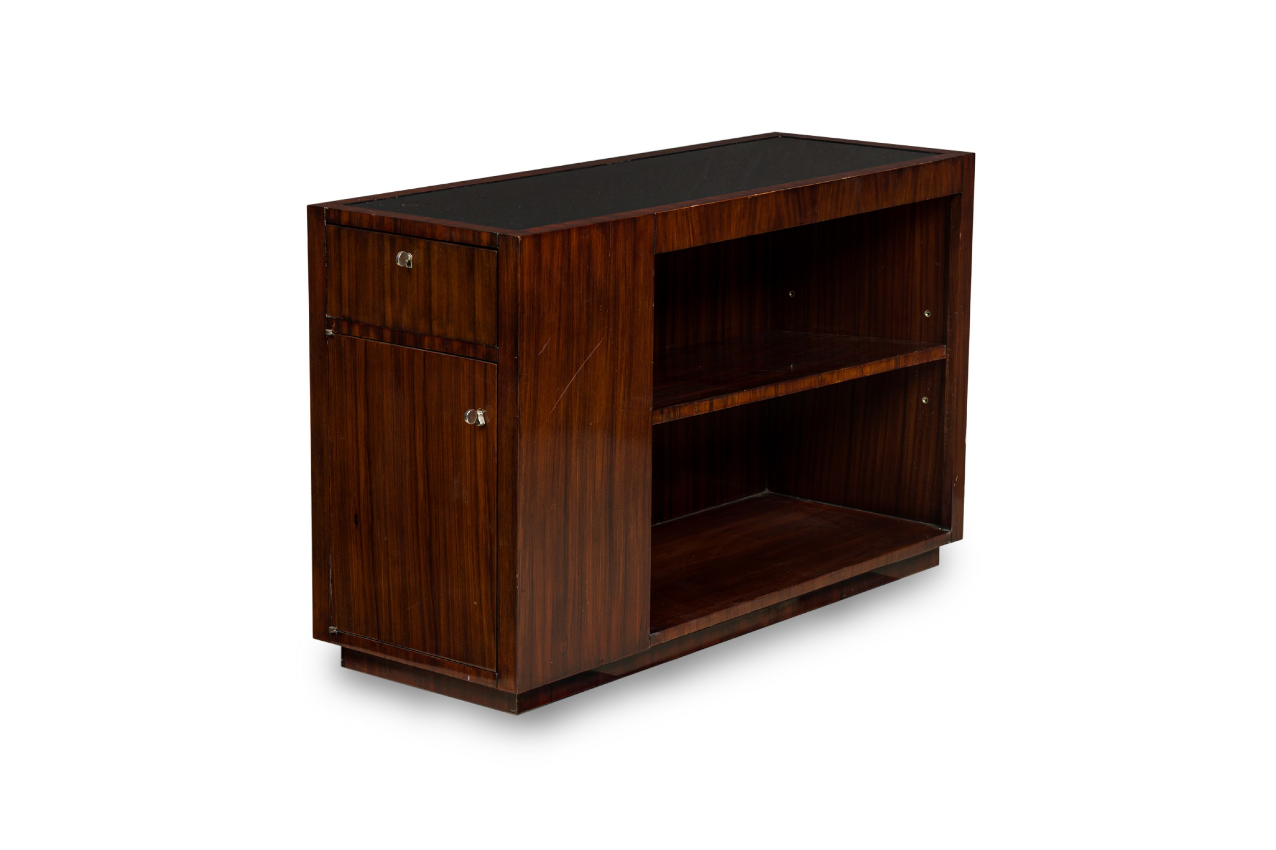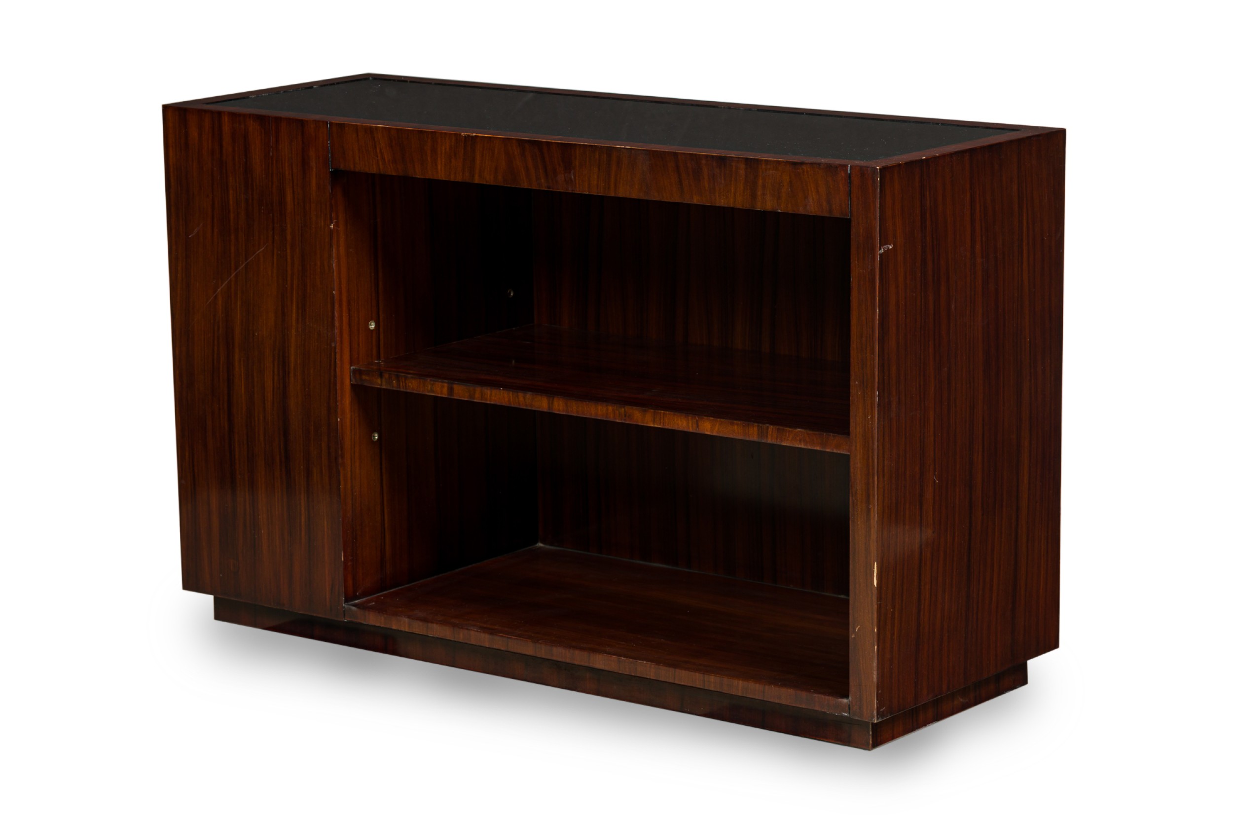 PAIR of Art Deco style Mid-Century American ebony de macassar cabinets featuring an open front storage area with one shelf plus a pullout drawer and compartment on the left side. One cabinet has an inlaid glass top. (PRICED AS PAIR)