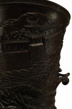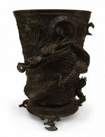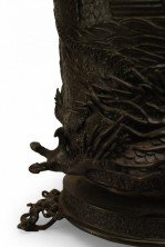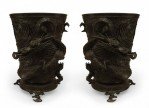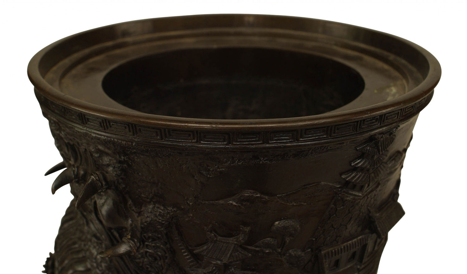 PAIR of Asian Chinese style bronze cylindrical shaped vases (jardinieres) with dragons in relief and resting on 3 stylized feet (19th Cent) (PRICED AS PAIR)