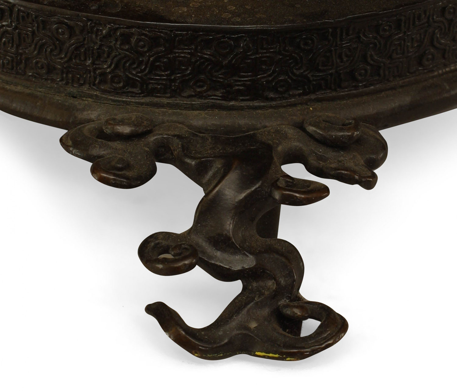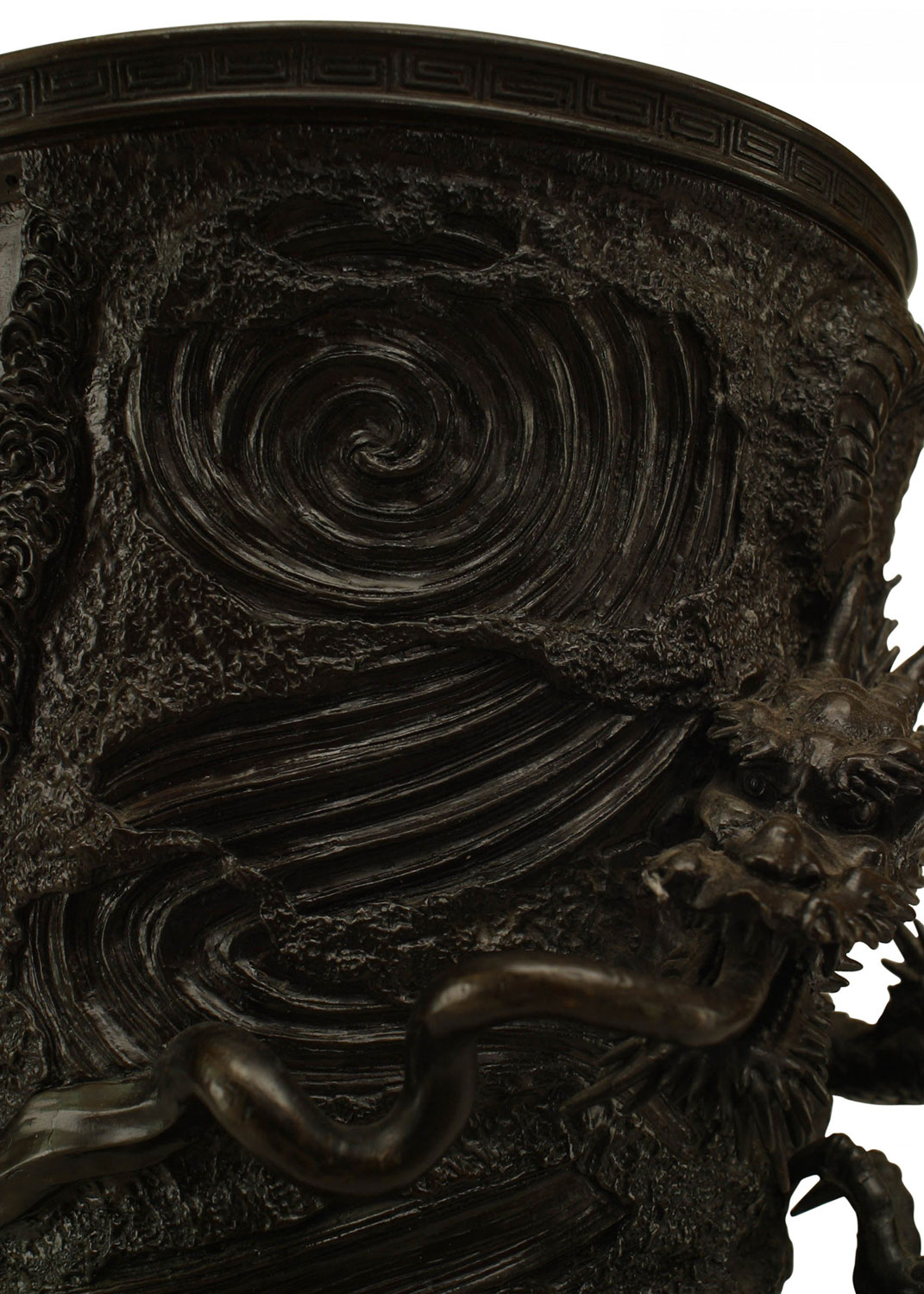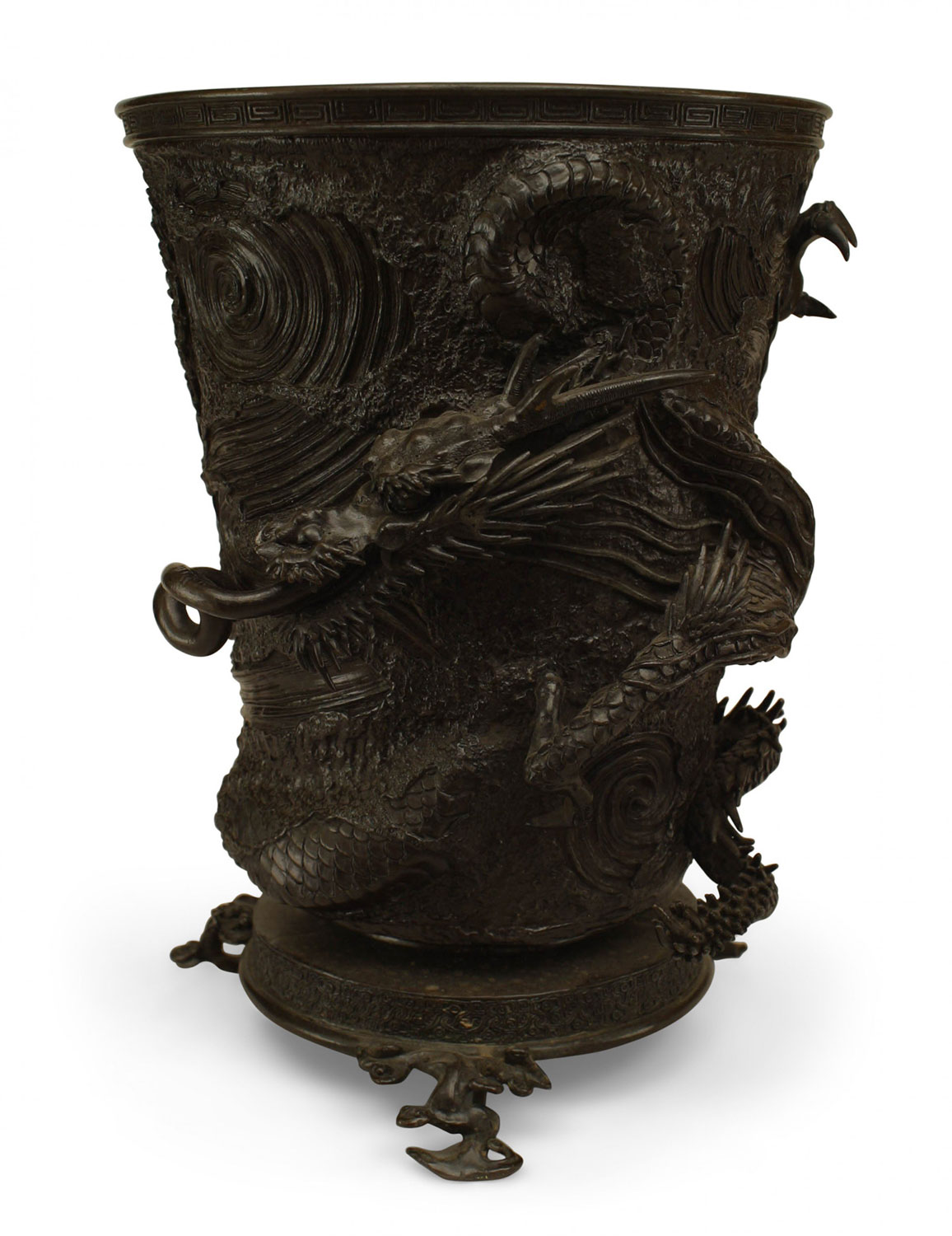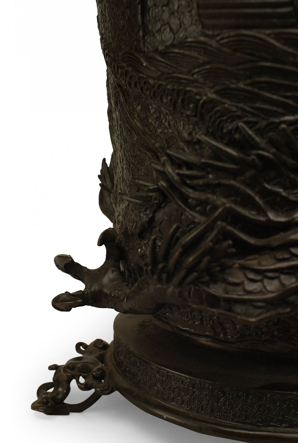 PAIR of Asian Chinese style bronze cylindrical shaped vases (jardinieres) with dragons in relief and resting on 3 stylized feet (19th Cent) (PRICED AS PAIR).
