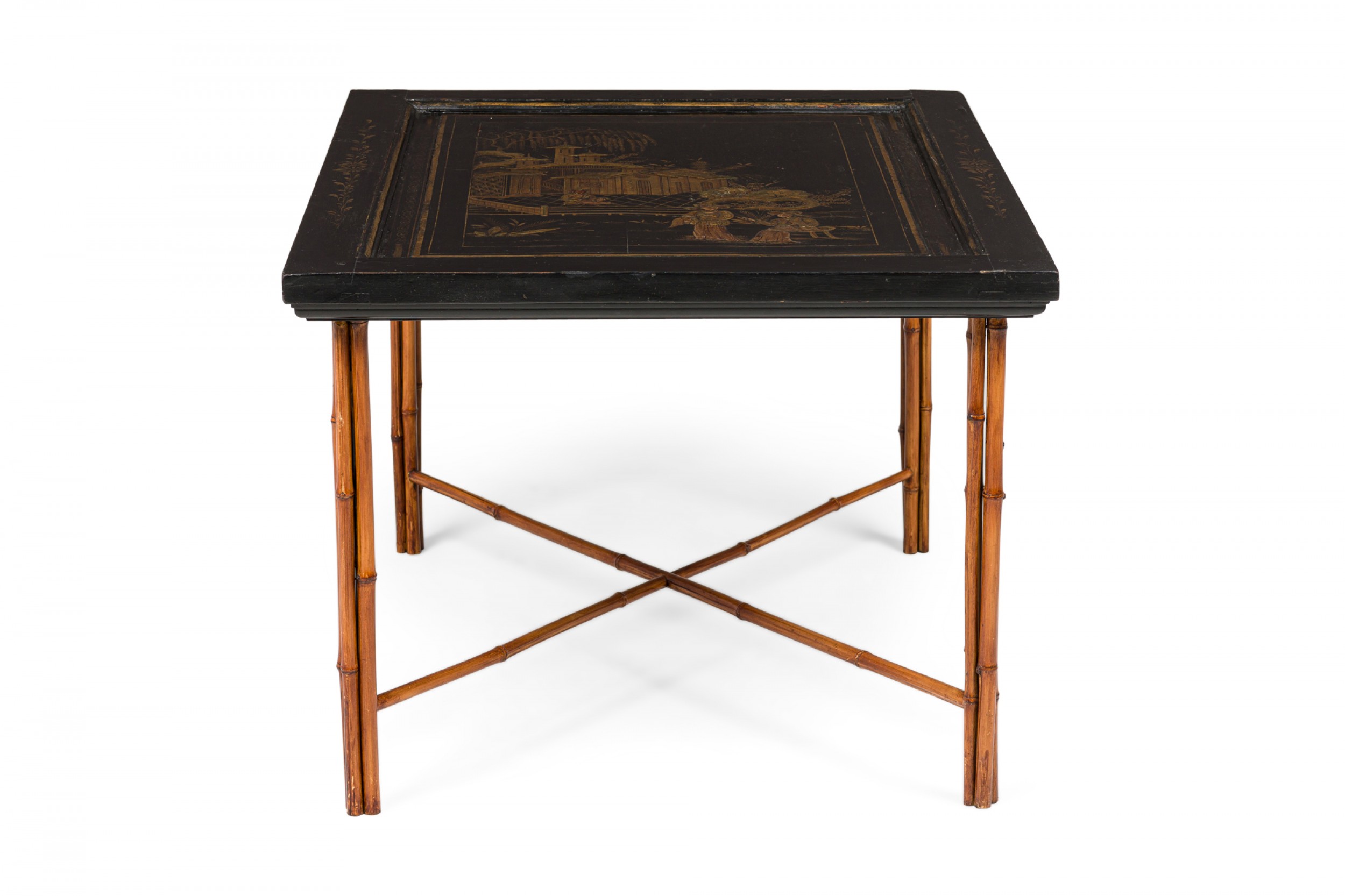 PAIR of similar Chinese end tables with black lacquered panel tops (19th Century) having figural and parcel gilt highlights within an inset painted floral border resting on bamboo cluster legs connectec by an X-stretcher. (PRICED AS PAIR) (Prov: Estate of Michael Taylor).