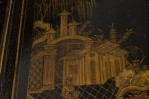 PAIR of similar Chinese end tables with black lacquered panel tops (19th Century) having figural and parcel gilt highlights within an inset painted floral border resting on bamboo cluster legs connectec by an X-stretcher. (PRICED AS PAIR) (Prov: Estate of Michael Taylor)