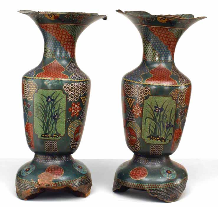 PAIR of Asian Chinese style green and decorated cloisonne and enamel vases with scalloped and flair top (as is) (19/20th Cent.) (PRICED AS PAIR). (AS IS condition)