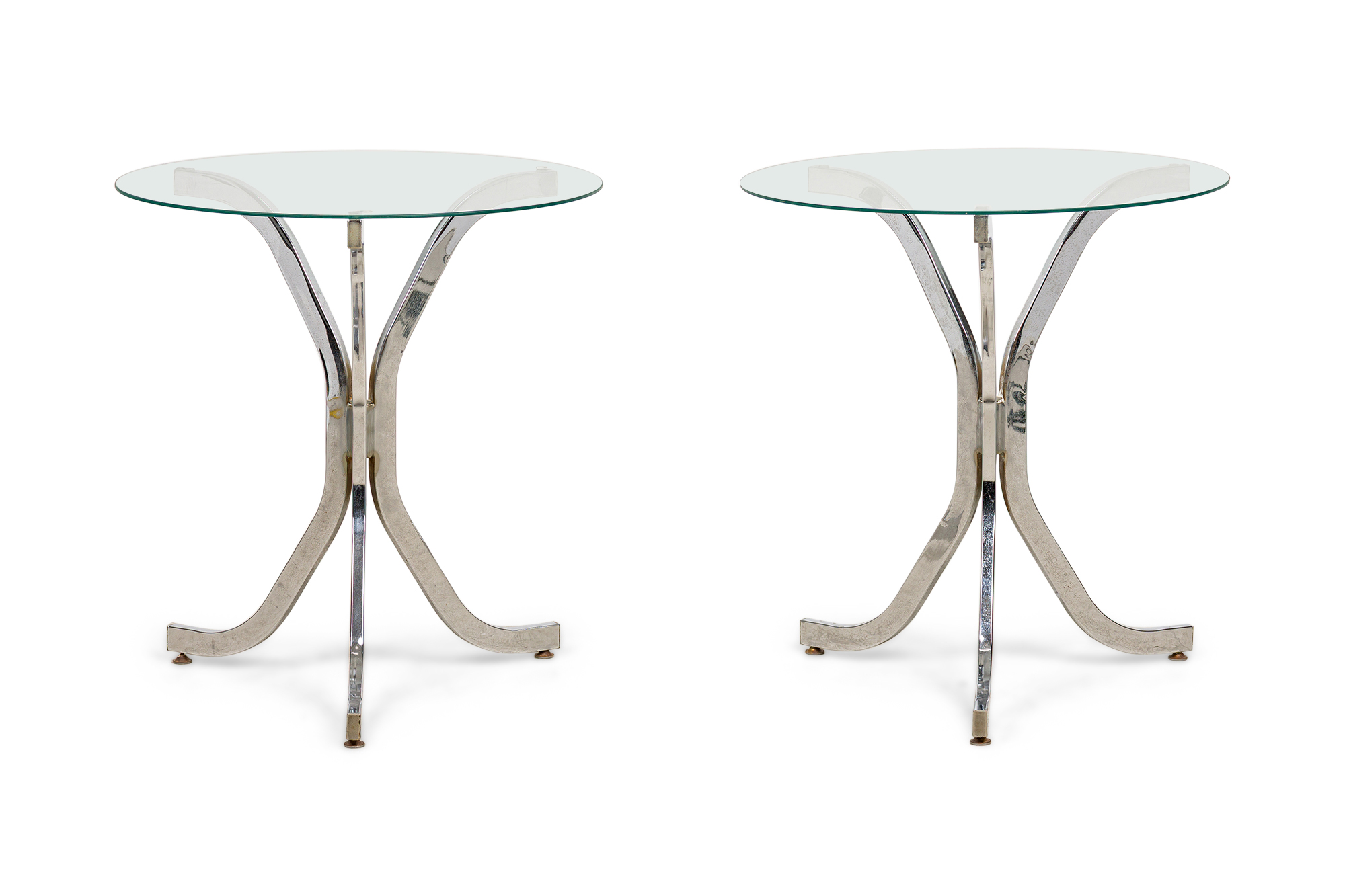 PAIR of Contemporary American chrome plated end / side tables in a 3-leg form connected in the center supporting a round glass tops. (PRICED AS PAIR)