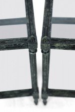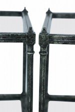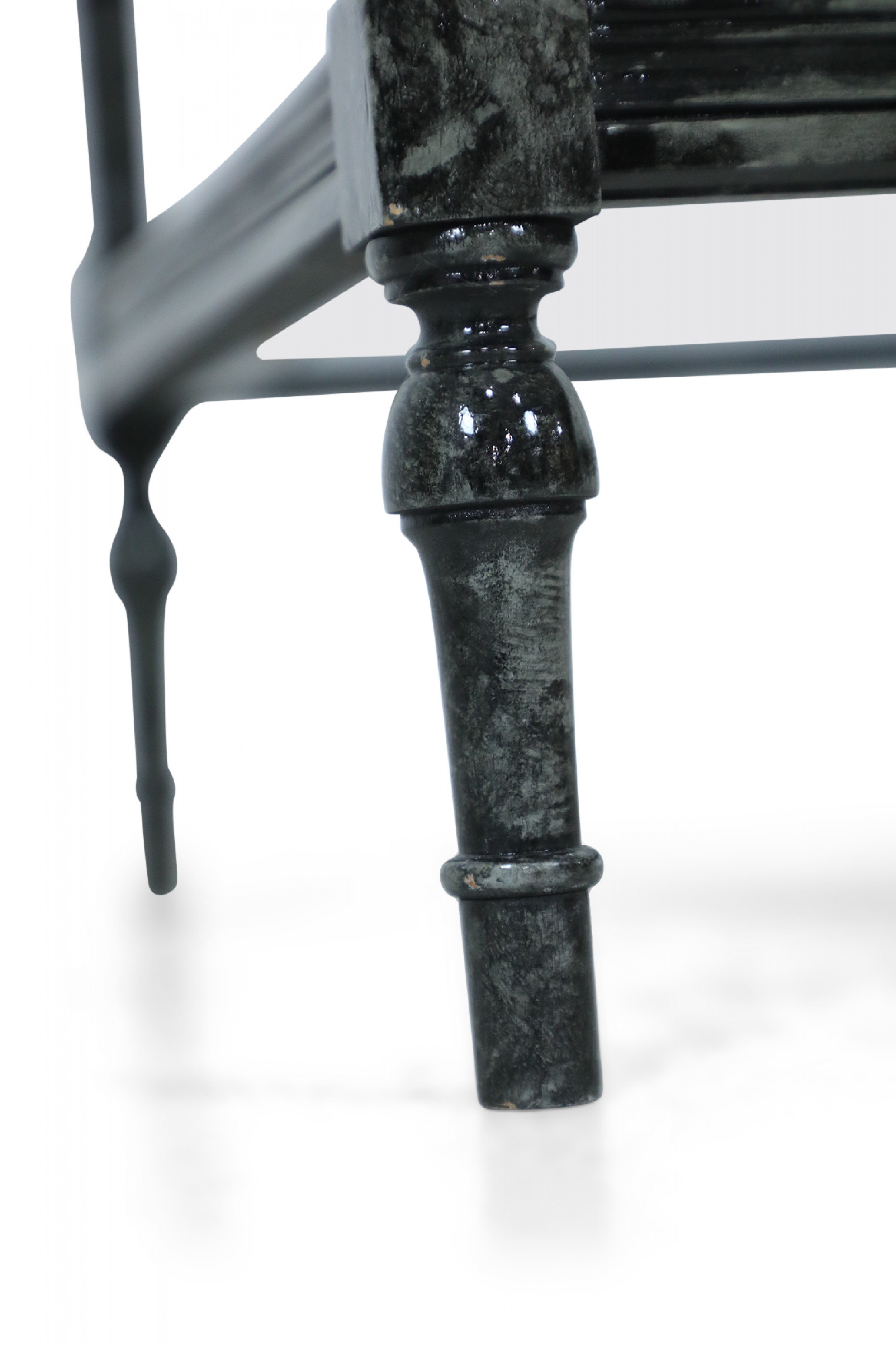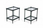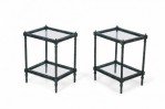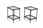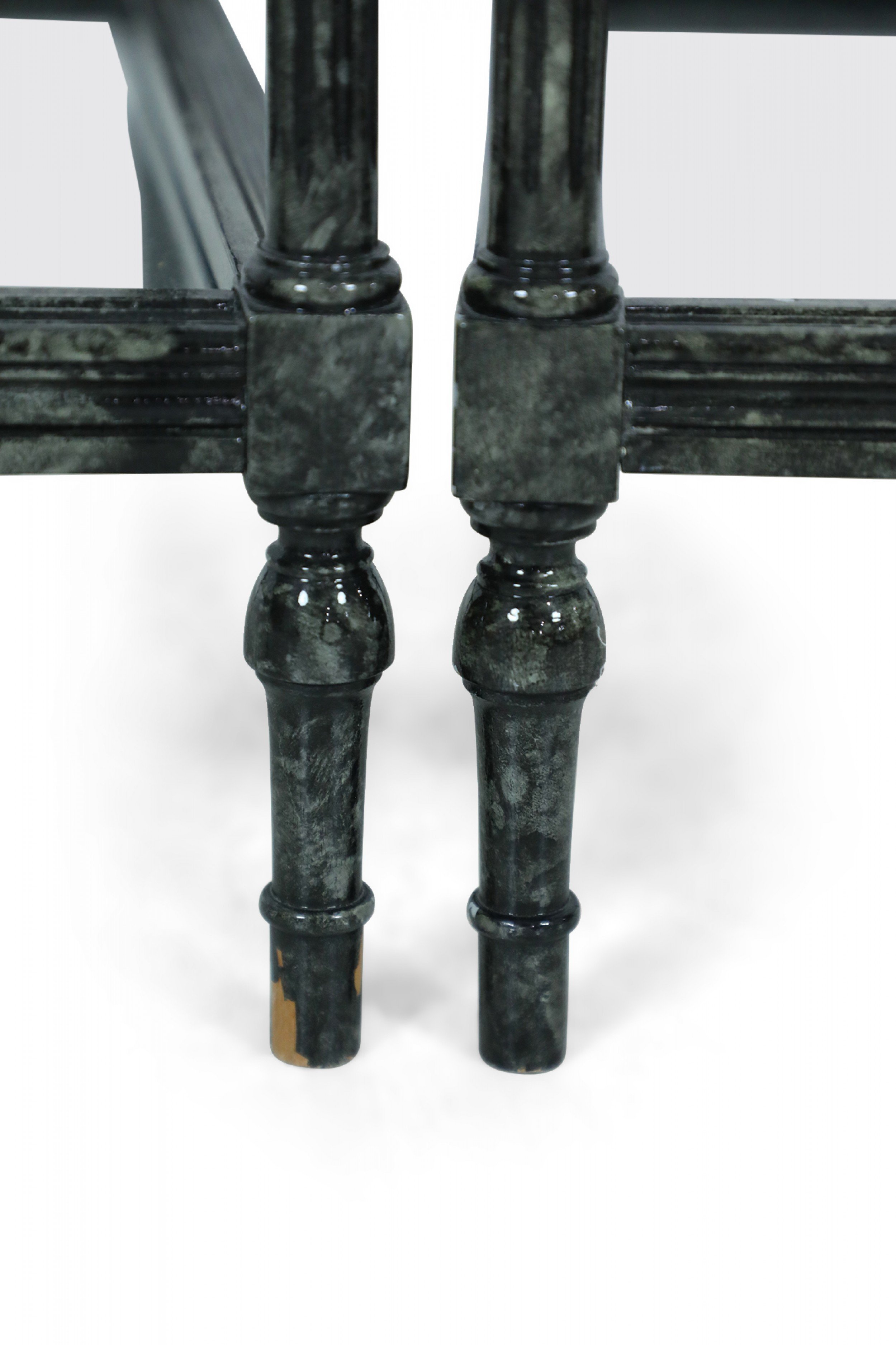 PAIR of Contemporary faux metallic painted wooden end tables with glass tops and a lower glass shelf supported with fluted column legs topped with small finials. (PRICED AS PAIR).
