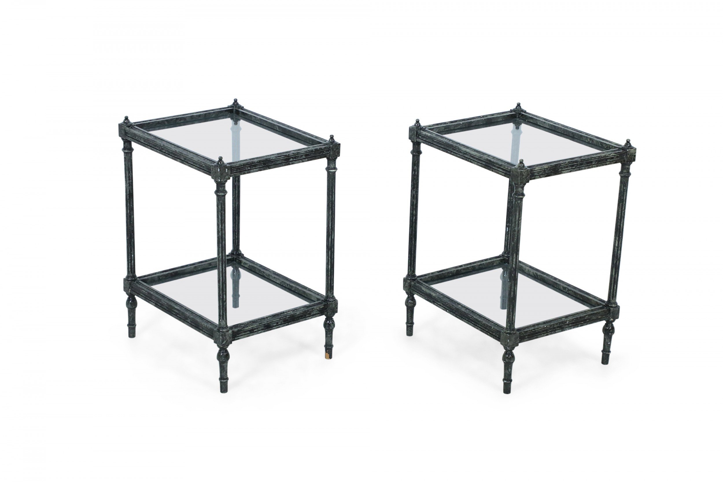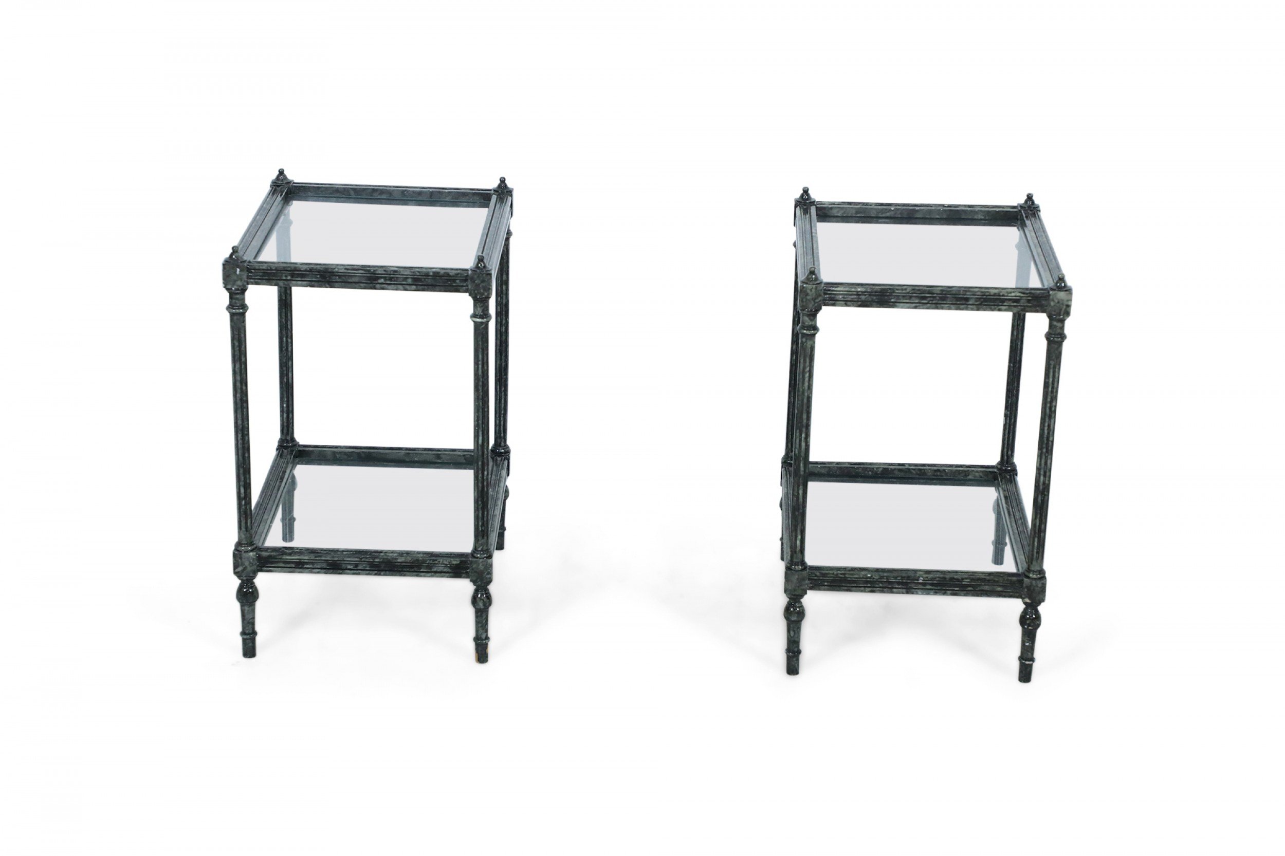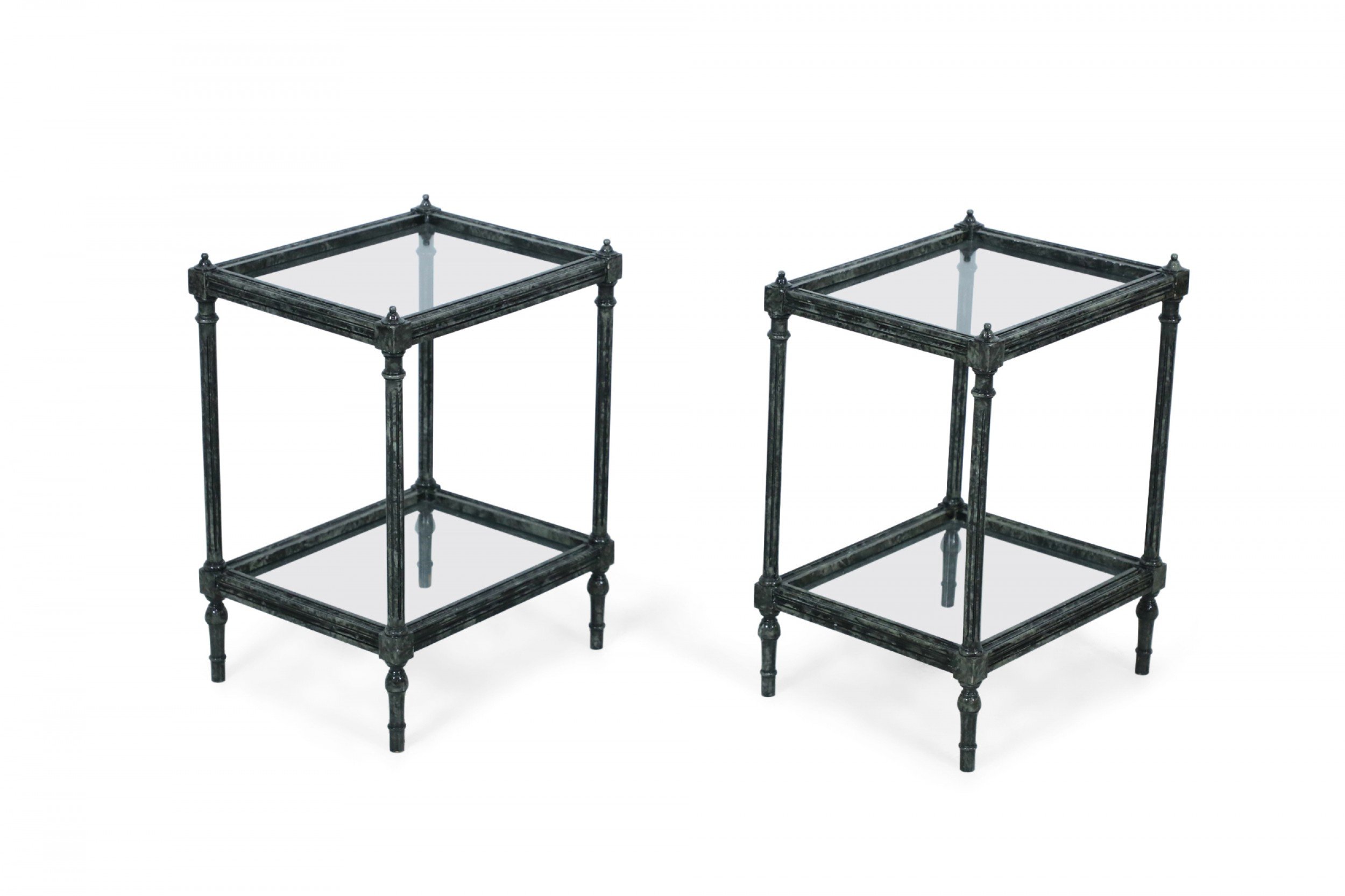 PAIR of Contemporary faux metallic painted wooden end tables with glass tops and a lower glass shelf supported with fluted column legs topped with small finials. (PRICED AS PAIR)