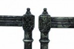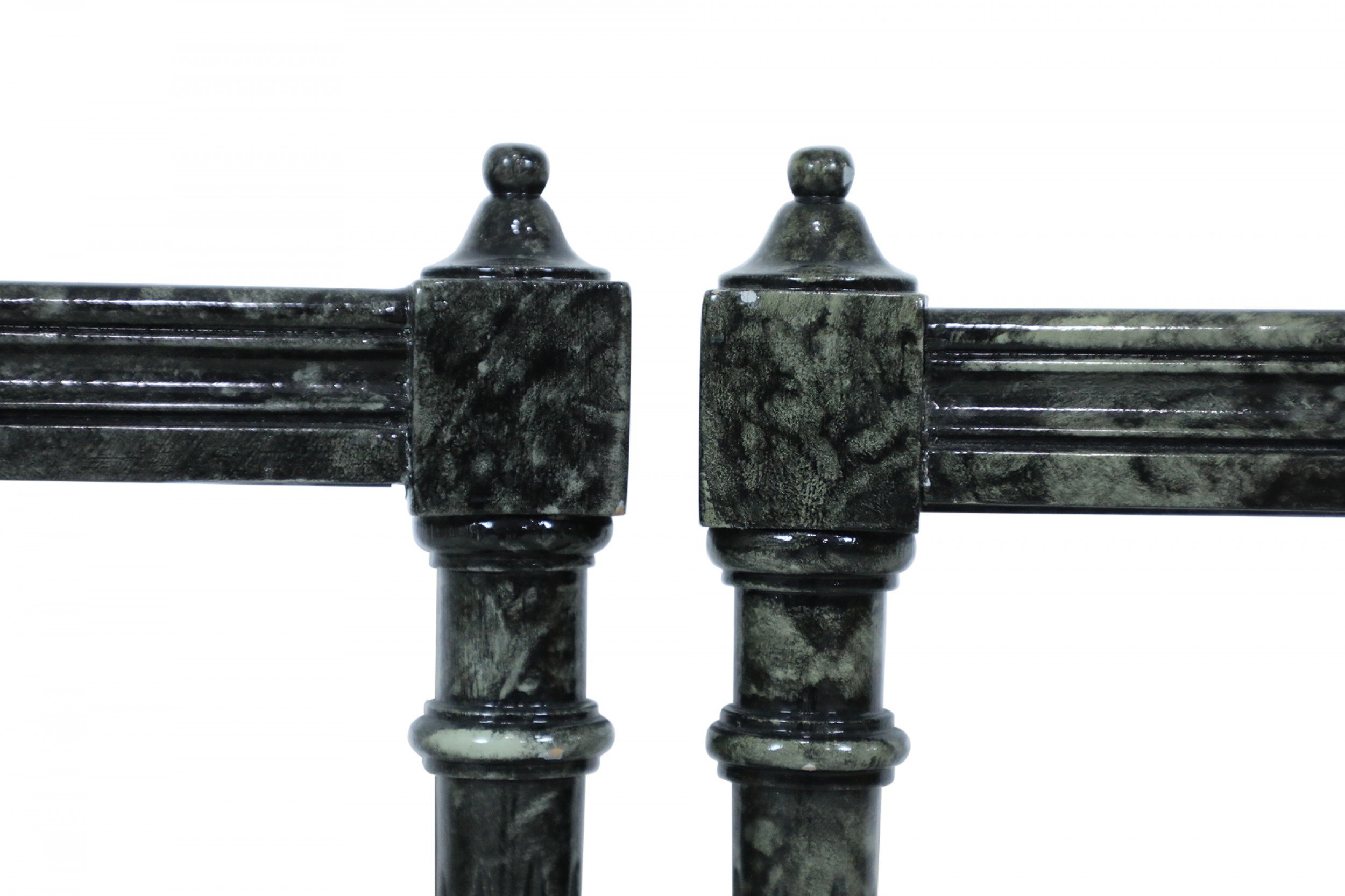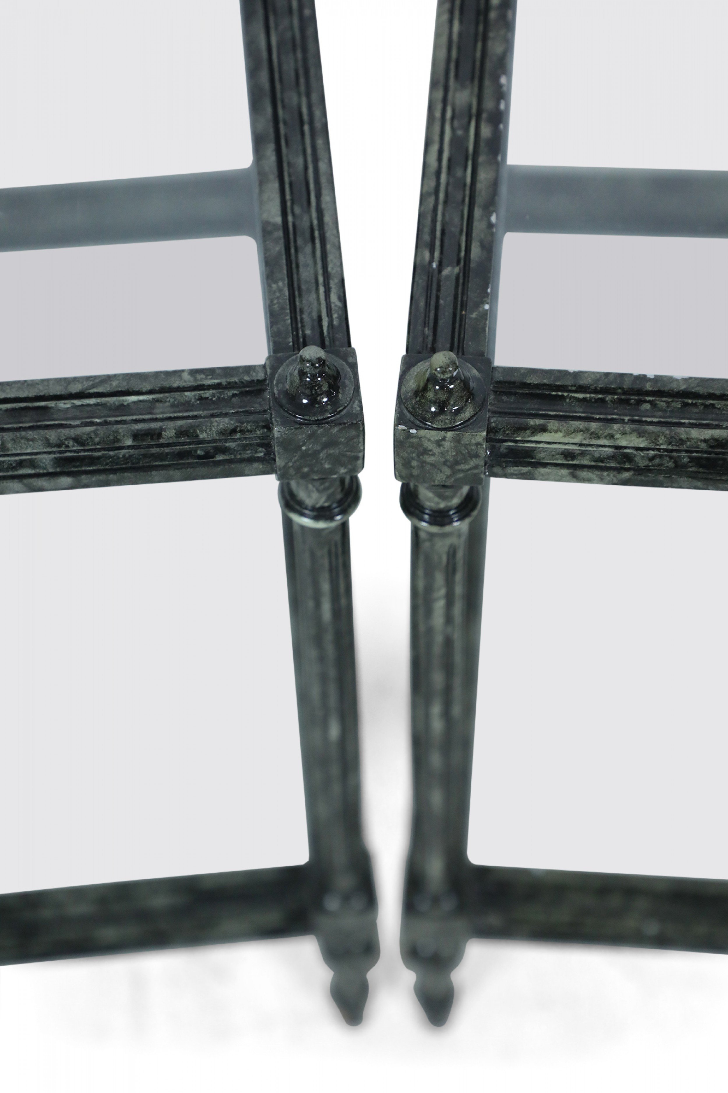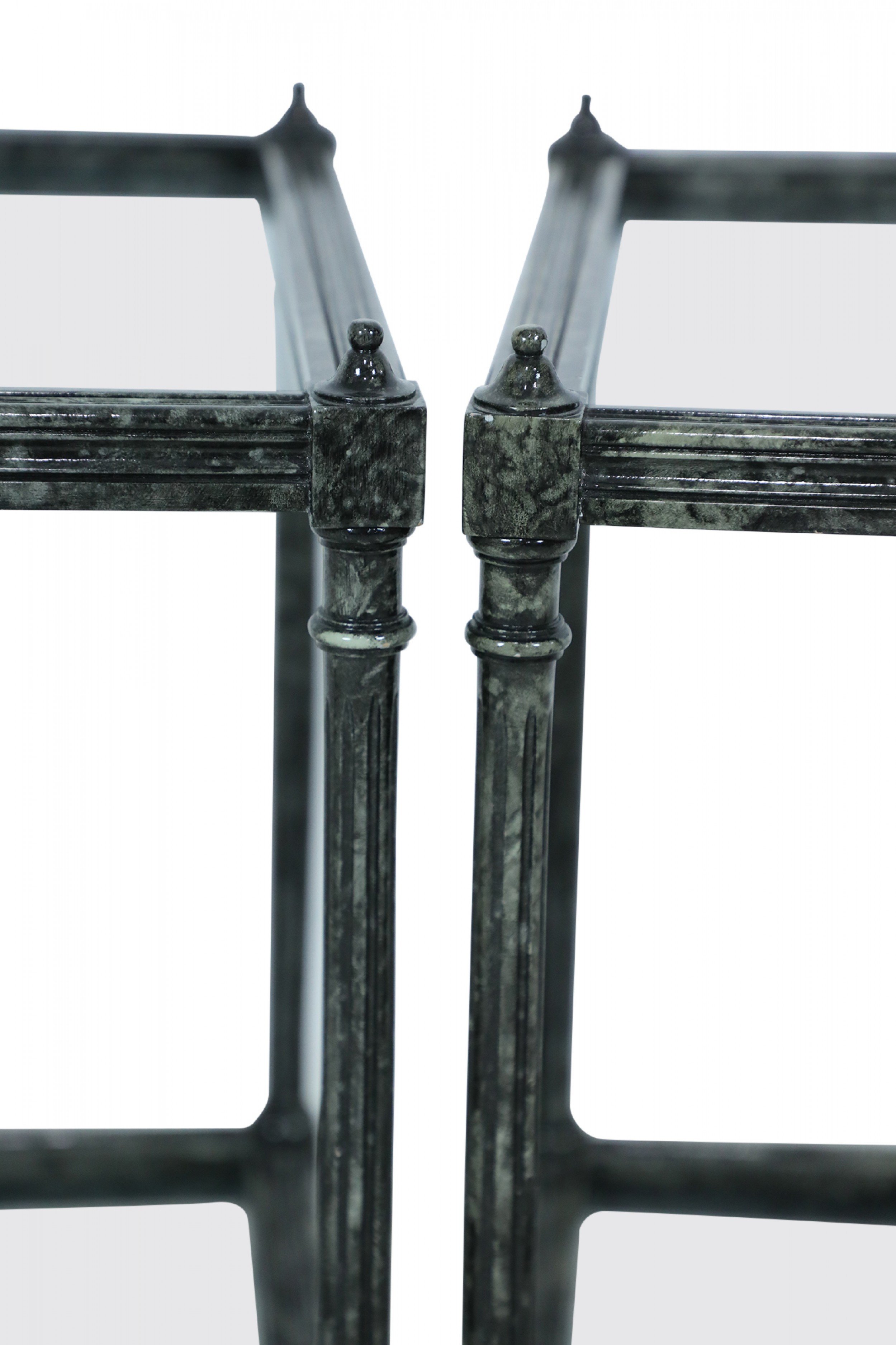 PAIR of Contemporary faux metallic painted wooden end tables with glass tops and a lower glass shelf supported with fluted column legs topped with small finials. (PRICED AS PAIR)