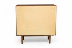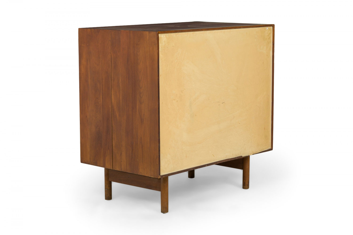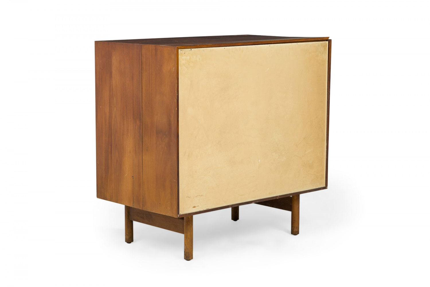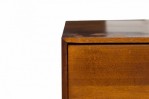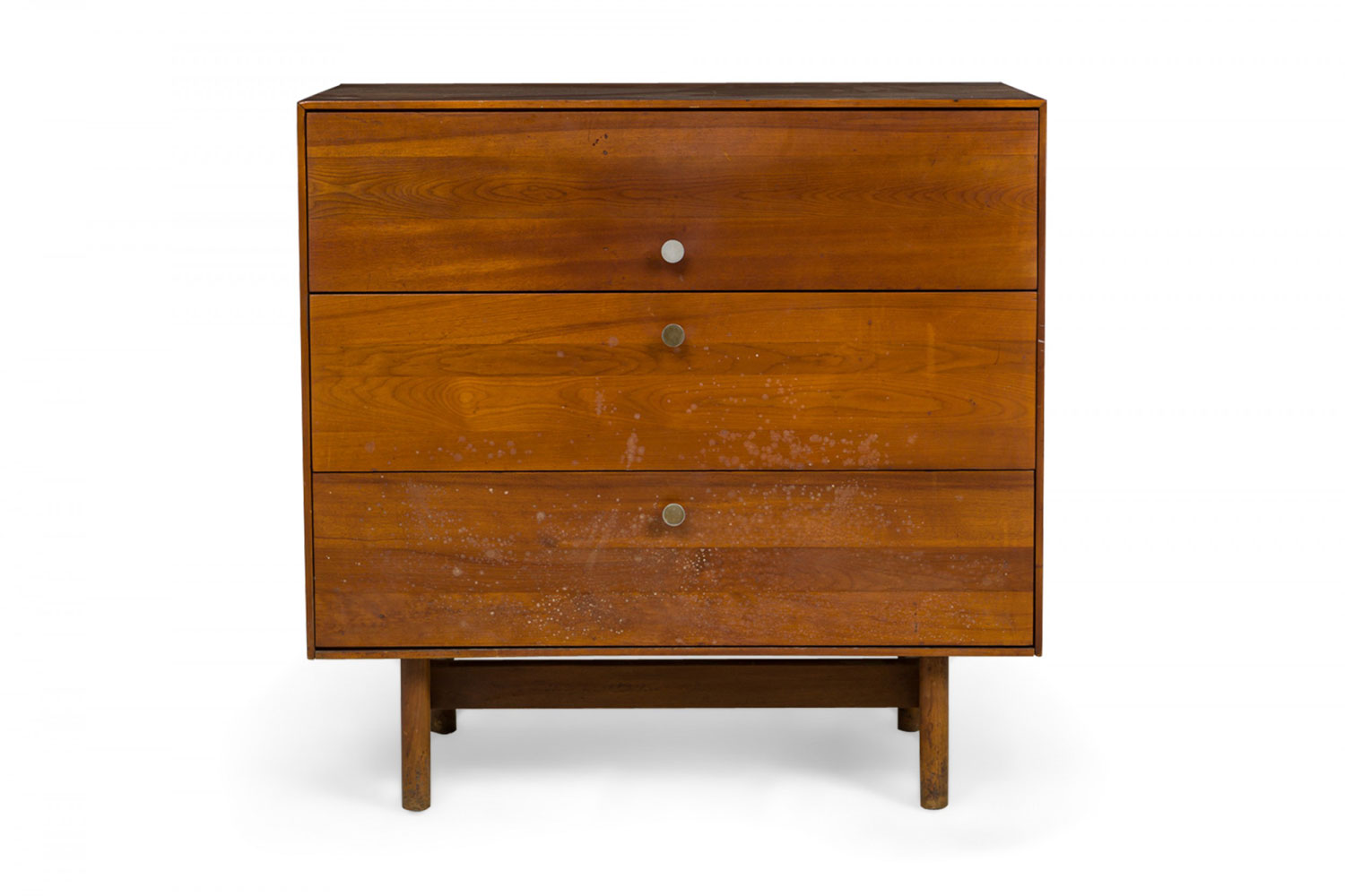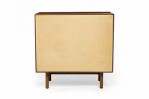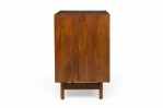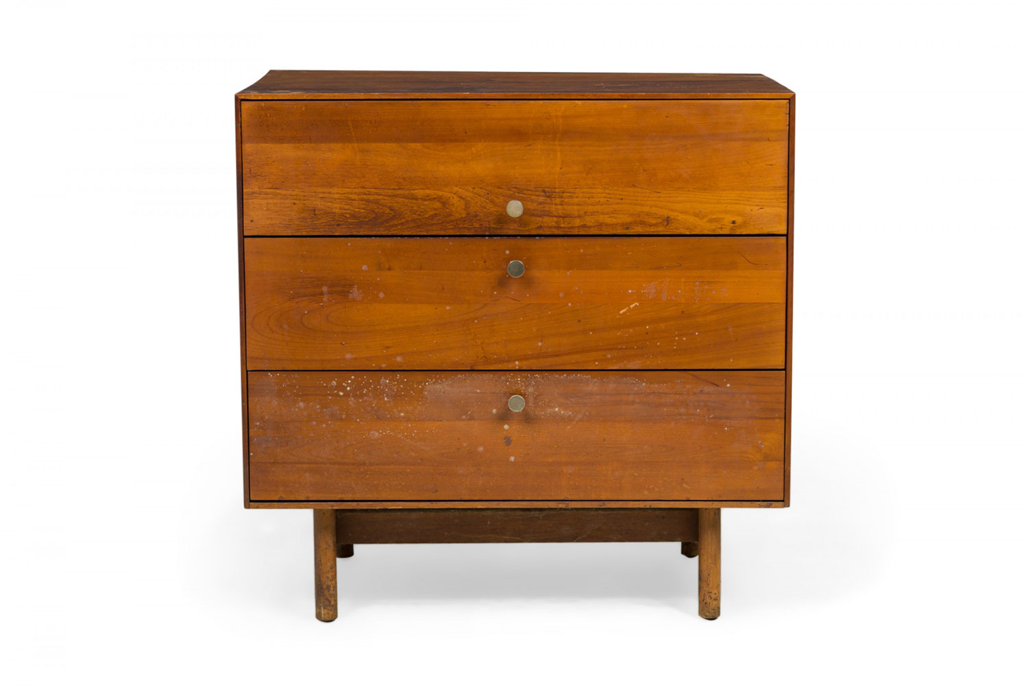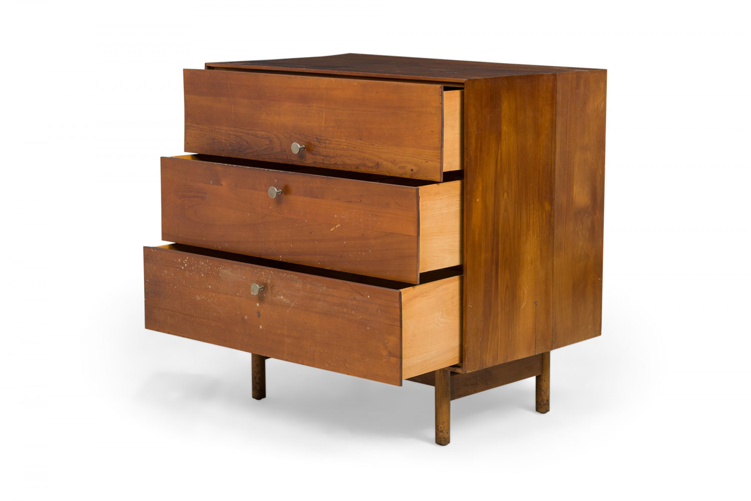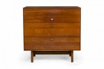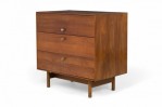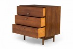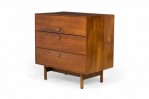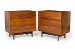PAIR of American Mid-Century 3-drawer rectangular walnut chests with circular brushed chrome drawer pulls, resting on four dowel legs. (EDMOND SPENCE FOR WHITNEY FURNITURE CO.)(PRICED AS PAIR)