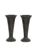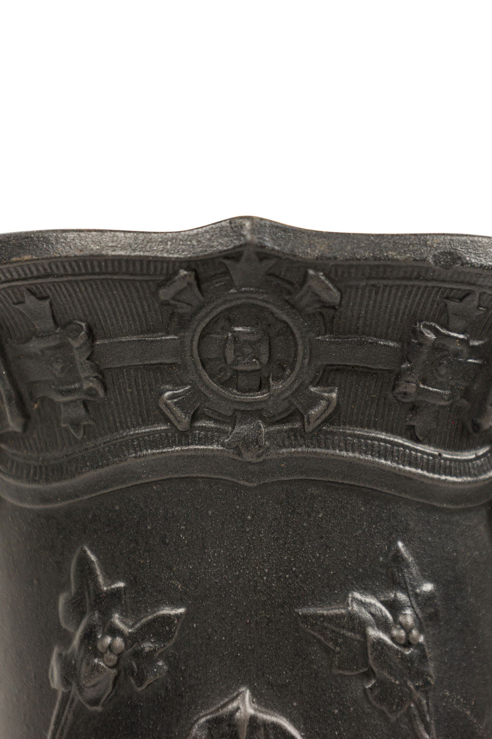 PAIR of English (19th Cent) black basalt earthenware trumpet shaped vases with floral relief (minor chip to 1 rim) (PRICED AS PAIR).