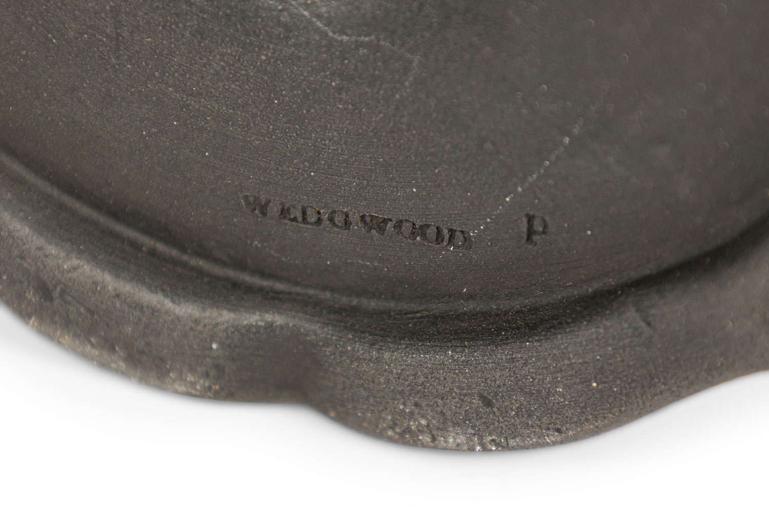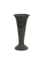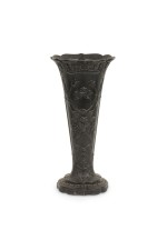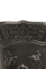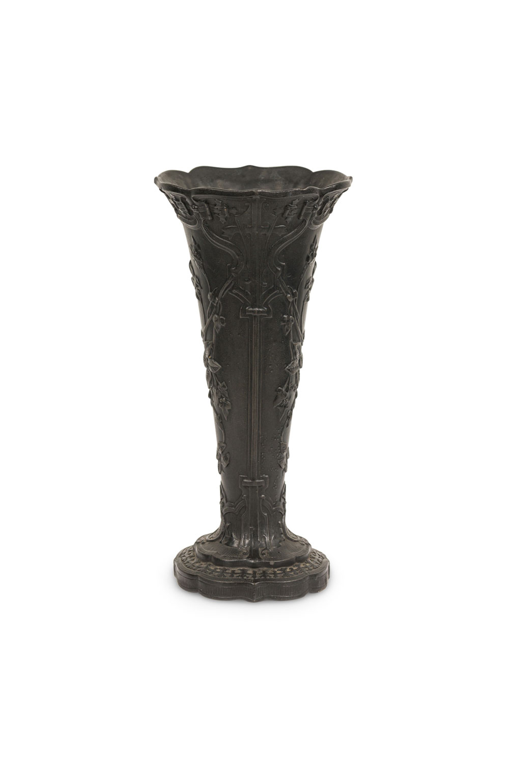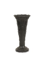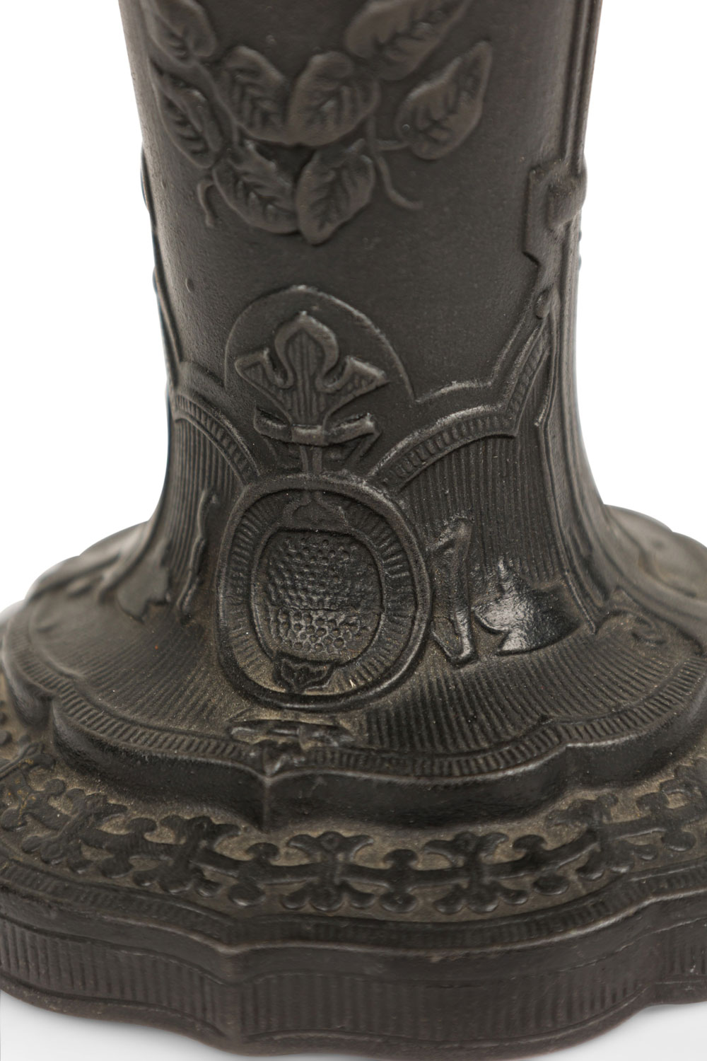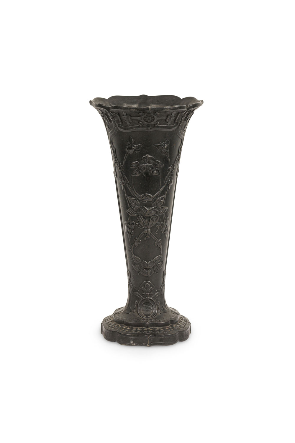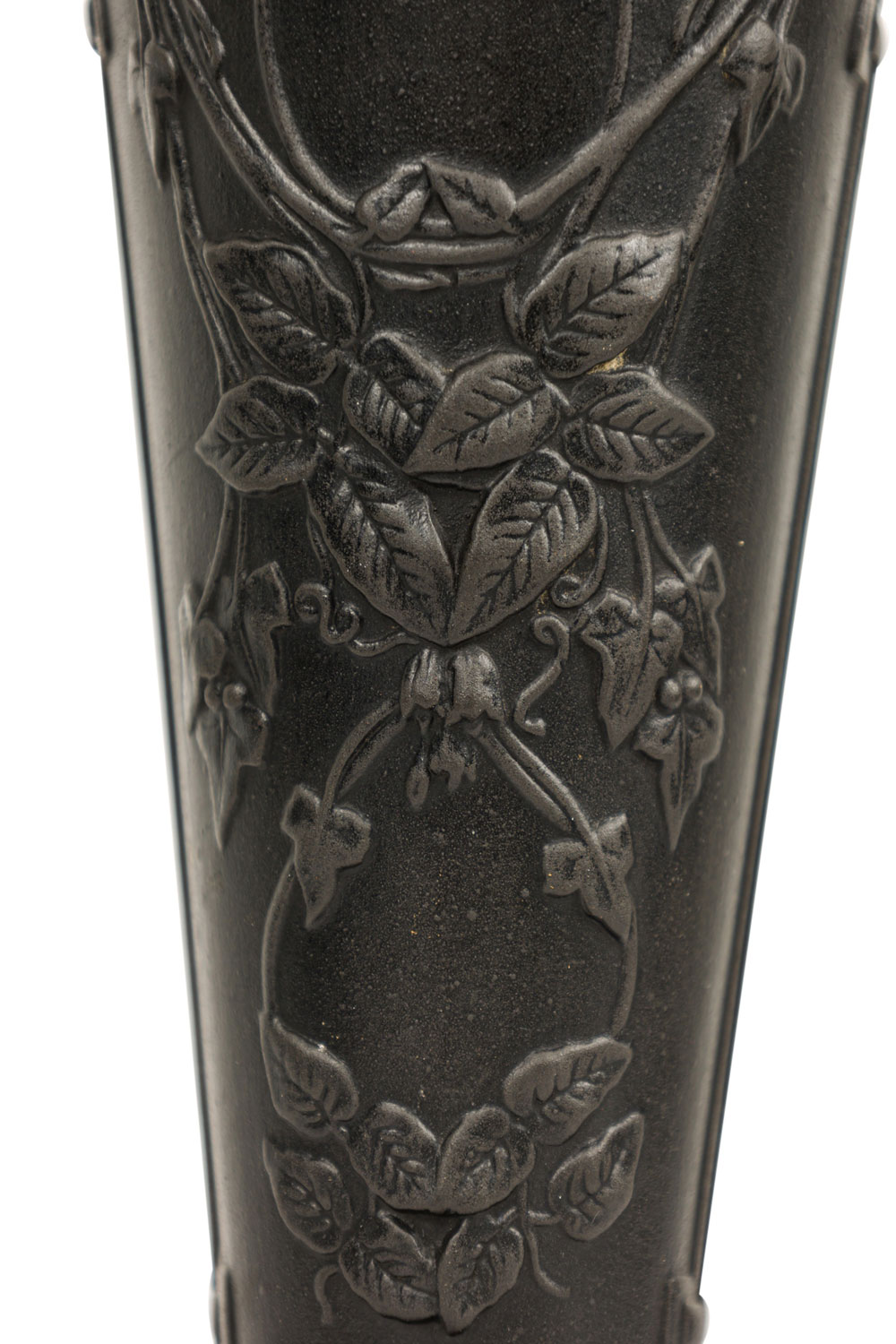 PAIR of English (19th Cent) black basalt earthenware trumpet shaped vases with floral relief (minor chip to 1 rim) (PRICED AS PAIR)