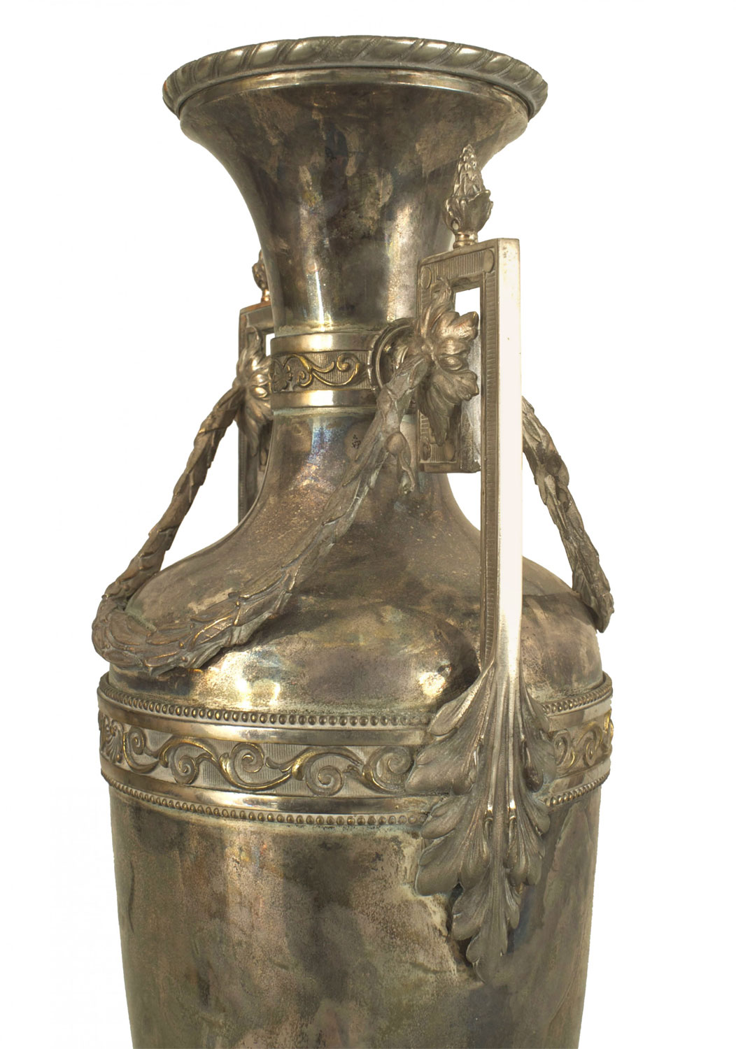 PAIR of English Georgian style tall silver plated vases with handles and festoon design and wreath base (19/20th Cent.) (PRICED AS PAIR)