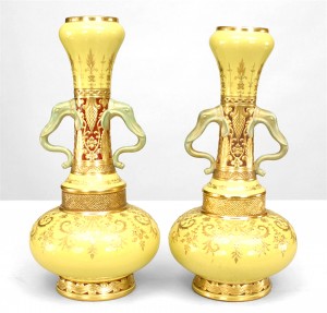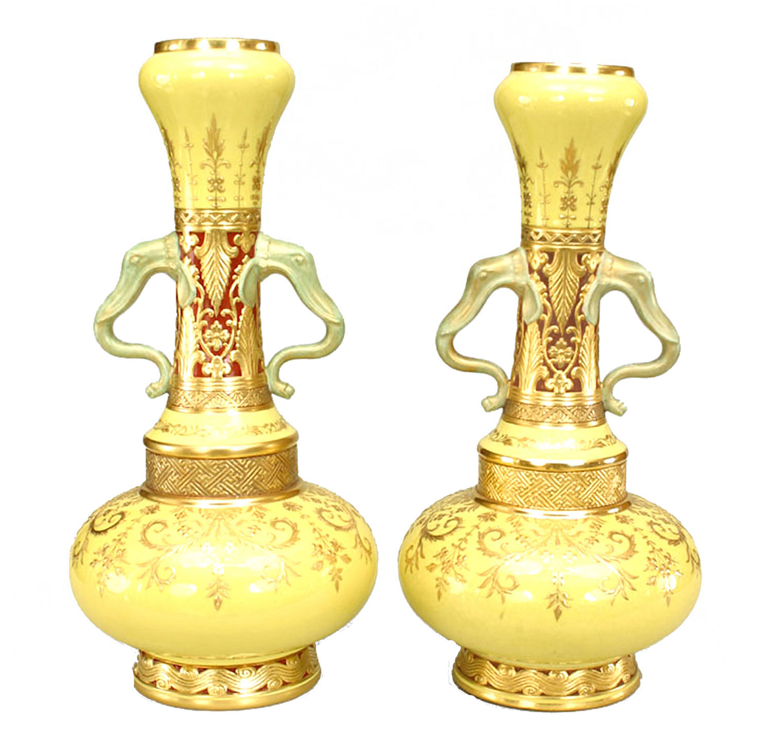 PAIR OF Similar English Victorian (Minton) yellow ground bottle form vases with gilt accents and stylistic elephant head handles. (PRICED AS PAIR).