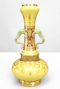 PAIR OF Similar English Victorian (Minton) yellow ground bottle form vases with gilt accents and stylistic elephant head handles. (PRICED AS PAIR)