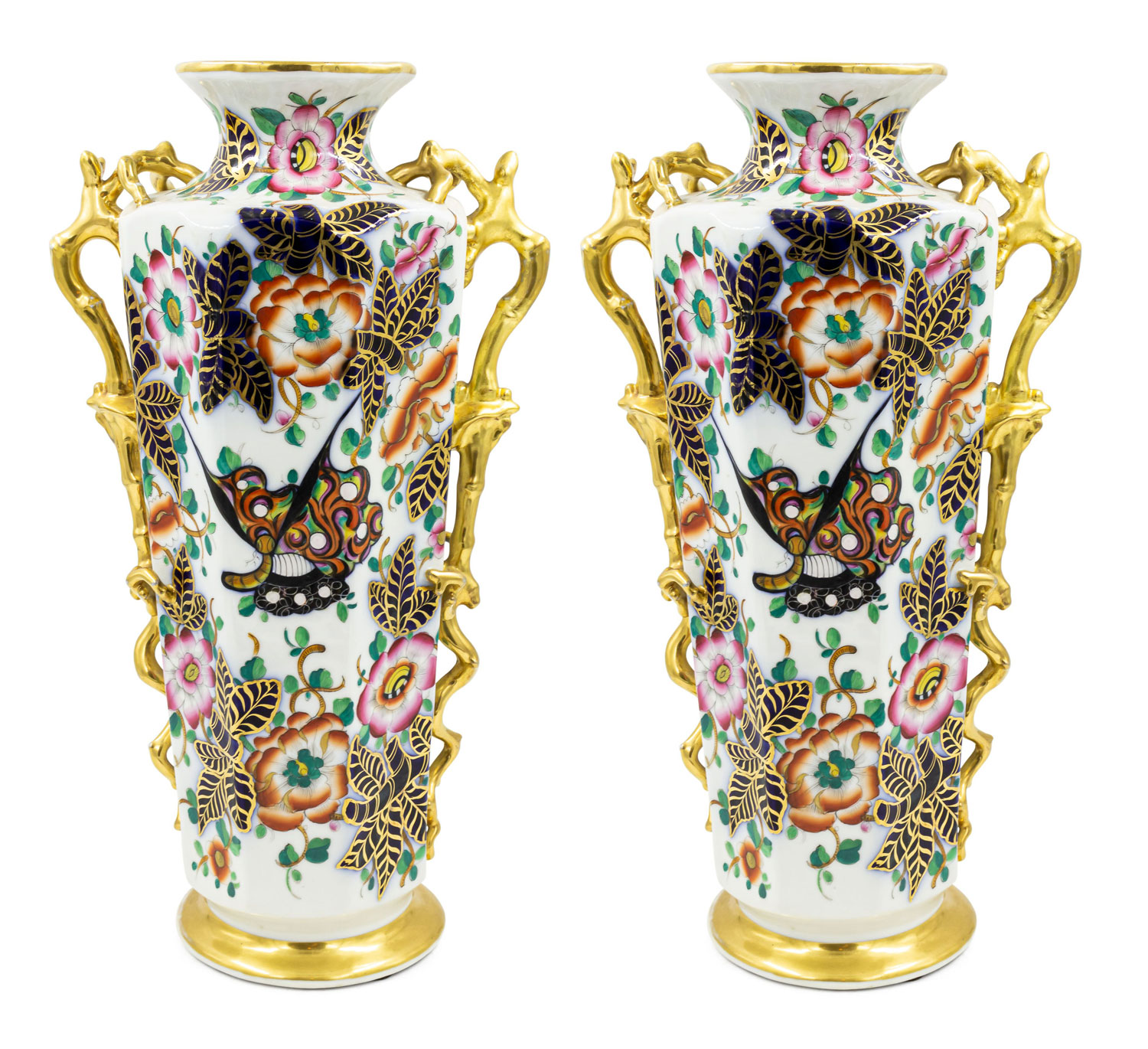 PAIR of English Victorian (possibly Chelsea) porcelain cobalt blue & white octagonal vases with painted Chinese style figures and trimmed with gilt faux twig handles. (PRICED AS PAIR).