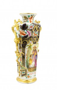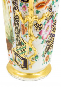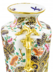PAIR of English Victorian (possibly Chelsea) porcelain cobalt blue & white octagonal vases with painted Chinese style figures and trimmed with gilt faux twig handles. (PRICED AS PAIR)