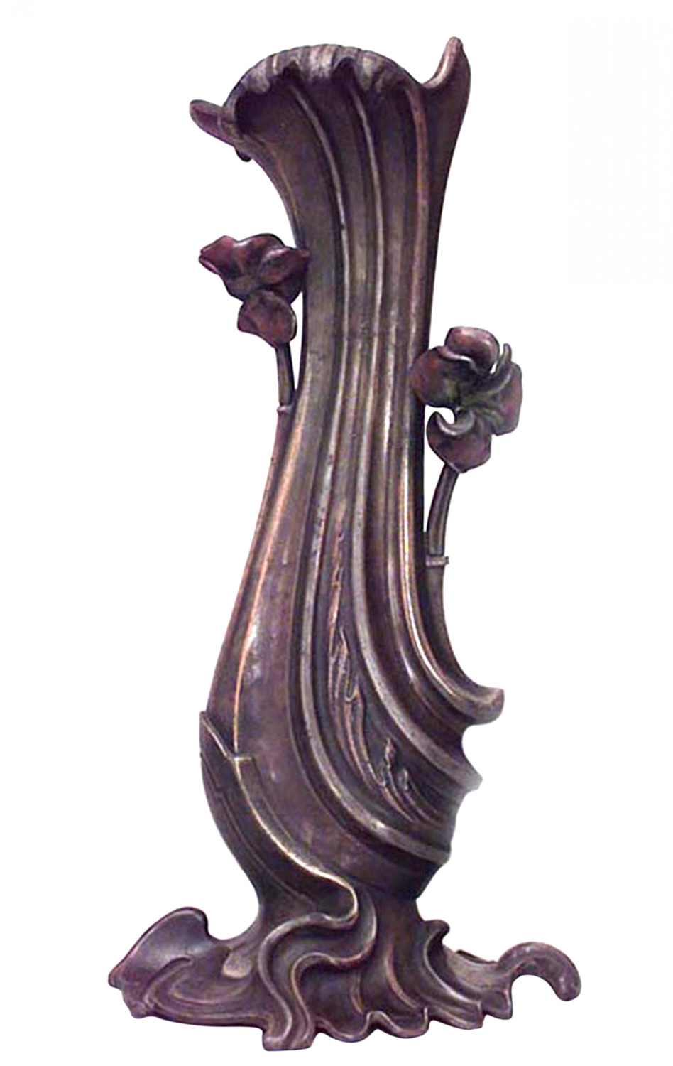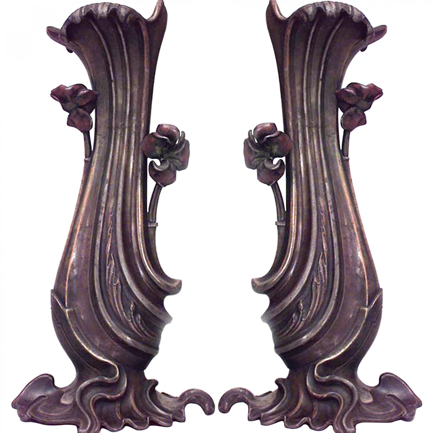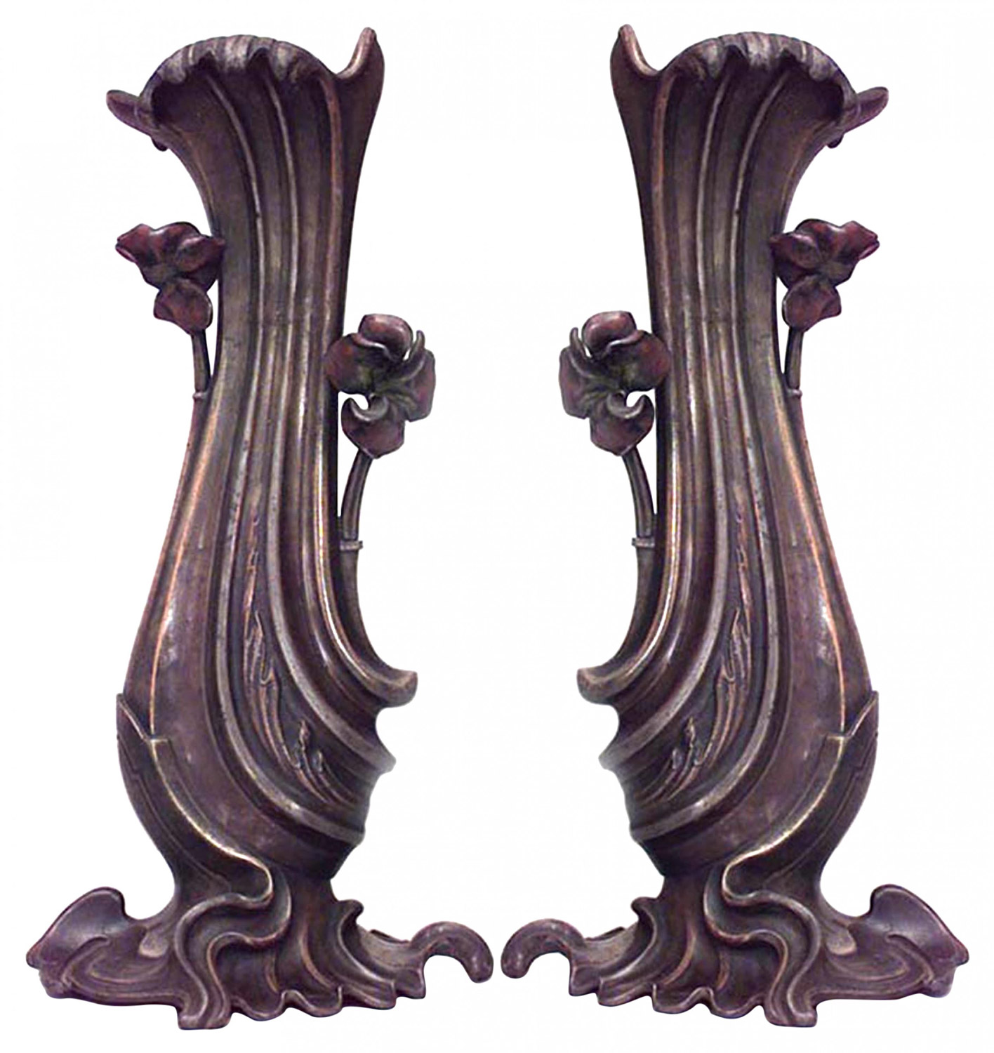 PAIR of French Art Nouveau patinaed metal scroll shaped vases with red flowers (signed) (PRICED AS PAIR).