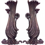 PAIR of French Art Nouveau patinaed metal scroll shaped vases with red flowers (signed) (PRICED AS PAIR)