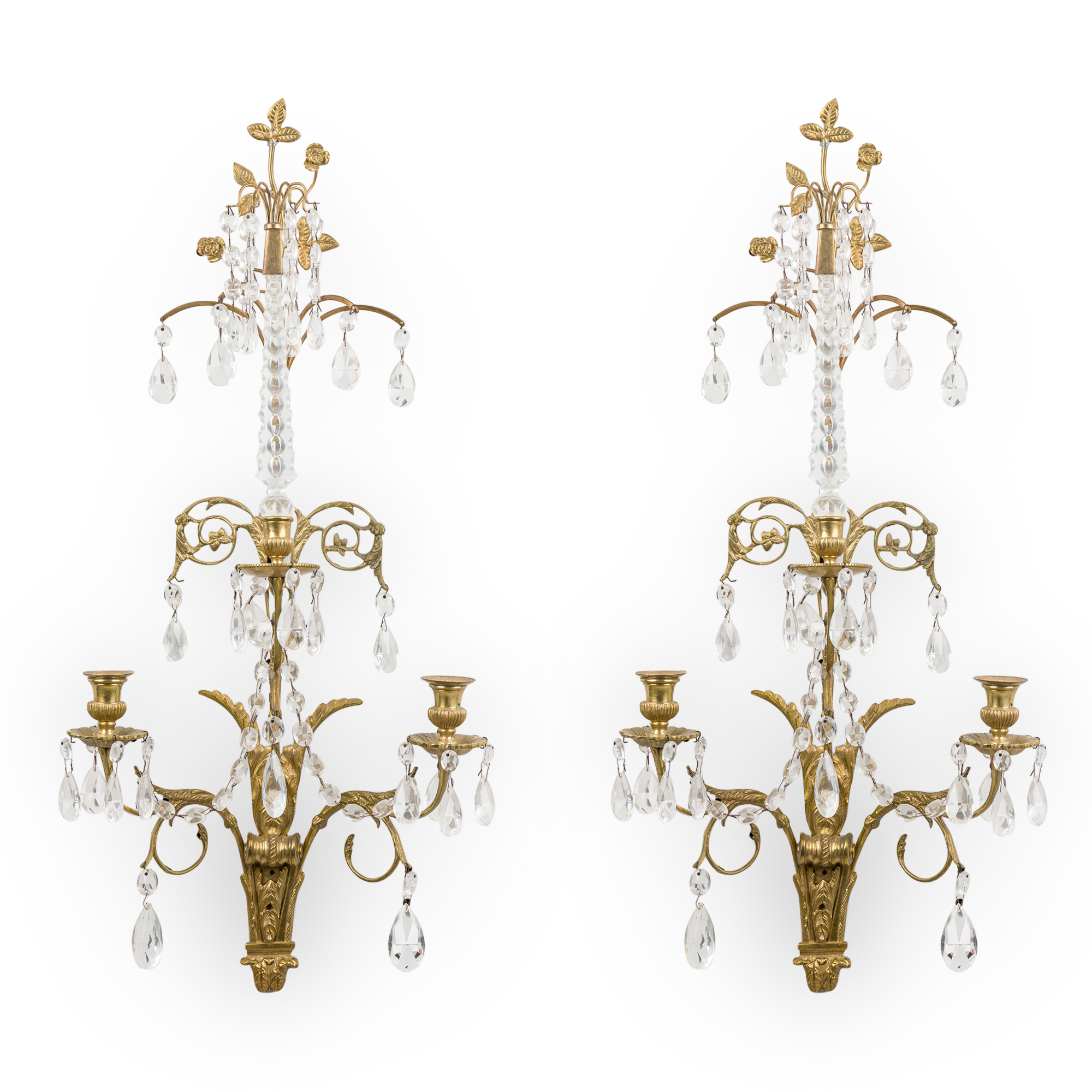 PAIR of French Charles X style (19/20th Century) gilt bronze wall sconces with two candle holder arms a central pyramidal crystal, and dangling faceted teardrop crystals throughout. (PRICED AS PAIR)