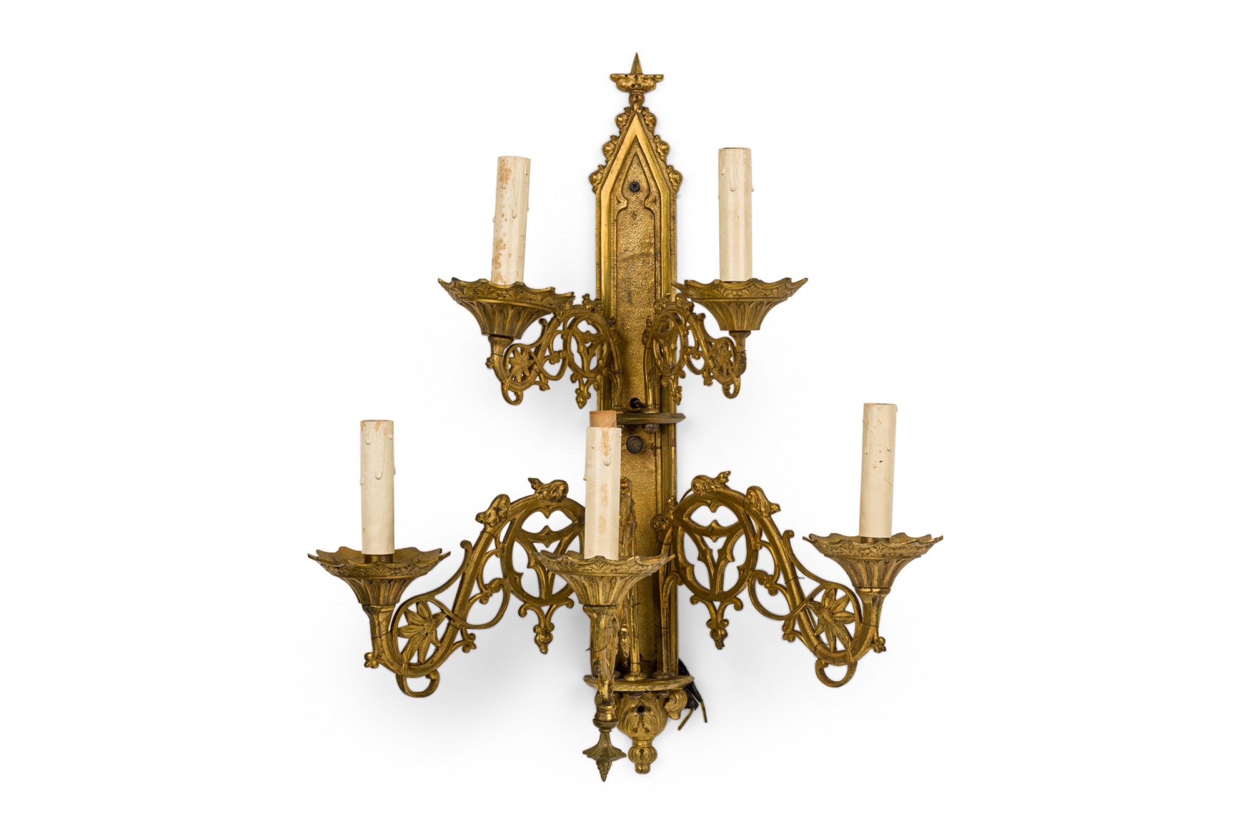 PAIR of French Gothic stye gilt bronze 2-tier 5 arm wall sconces featuring floral and foliage motifs.