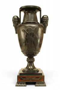 PAIR of French Victorian black marble and bronze urns with male mask handles and Egyptian motif relief and resting on a square base with square lattice design feet. (PRICED AS PAIR)