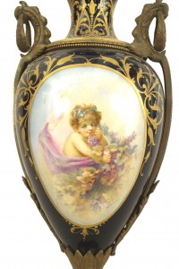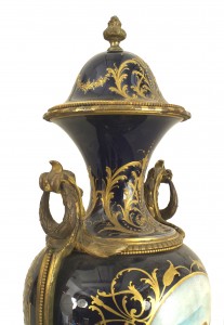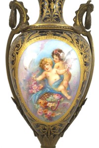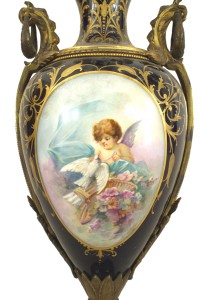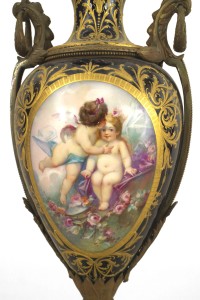 PAIR of French Victorian blue Sevres porcelain vases with bronze trim handles and cover and painting of two cupids. (PRICED AS PAIR)