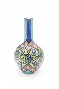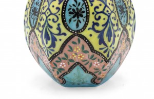 PAIR of French Victorian style (19/20th Cent) blue, pink & yellow enamel decorated vases with narrow neck on Moorish design hexagonal base. (PRICED AS PAIR)