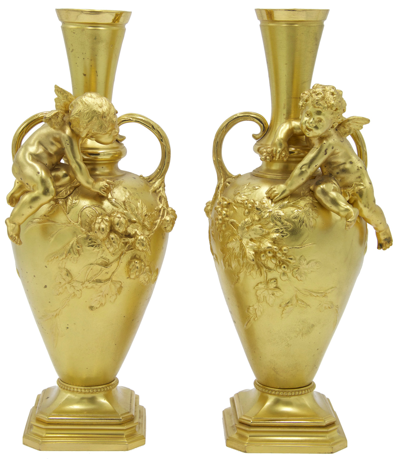 PAIR of French Victorian bronze dore vases with floral relief and seated cupid with small handles (signed A. MOREAU) (PRICED AS PAIR).