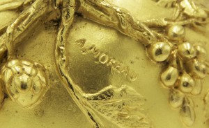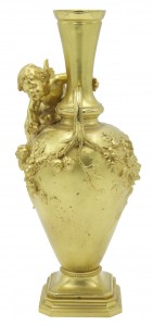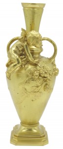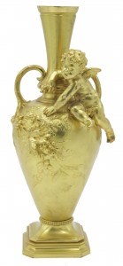 PAIR of French Victorian bronze dore vases with floral relief and seated cupid with small handles (signed A. MOREAU) (PRICED AS PAIR)