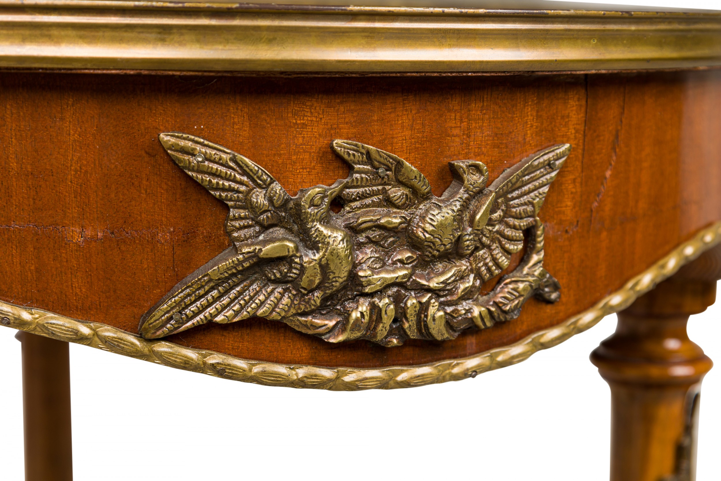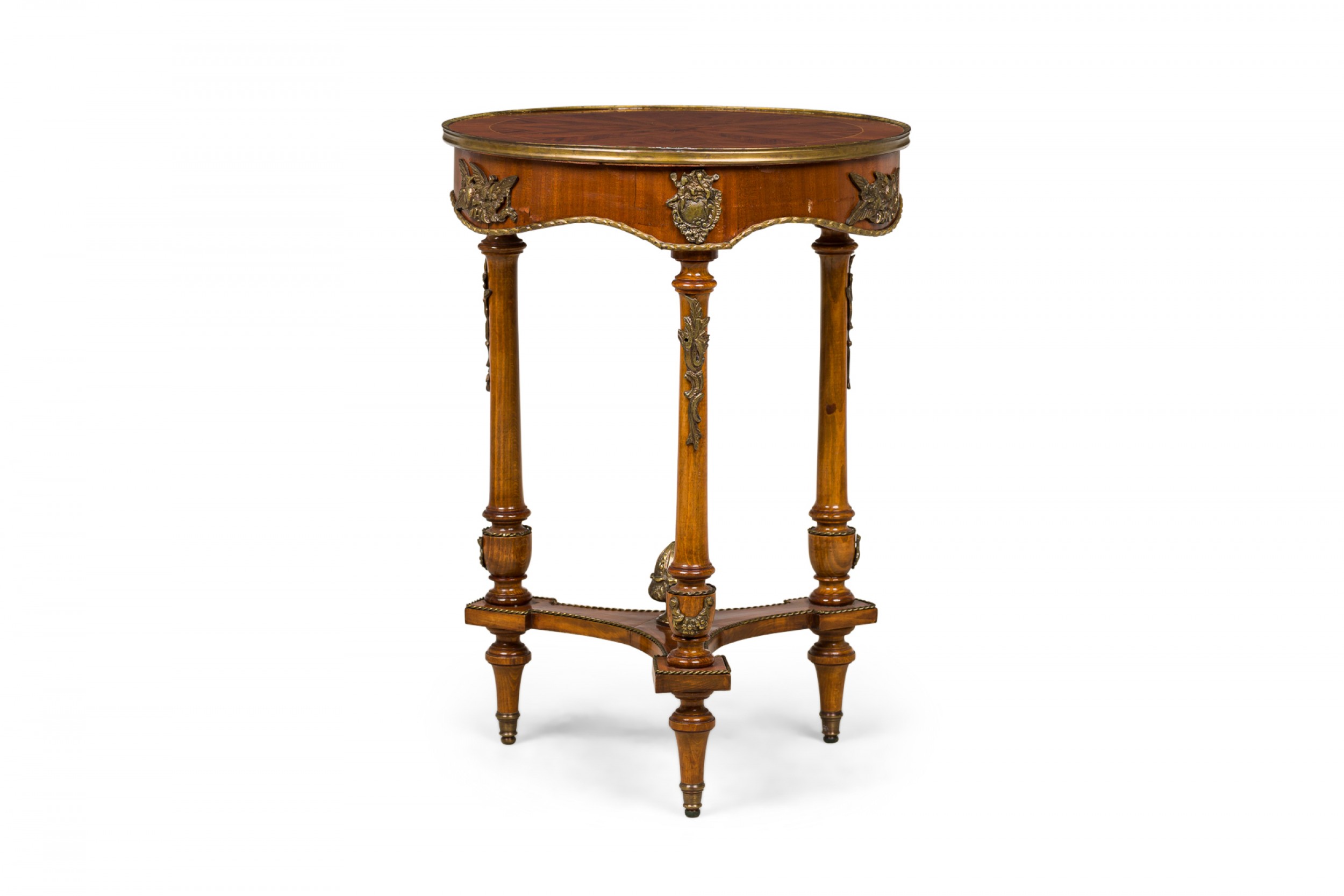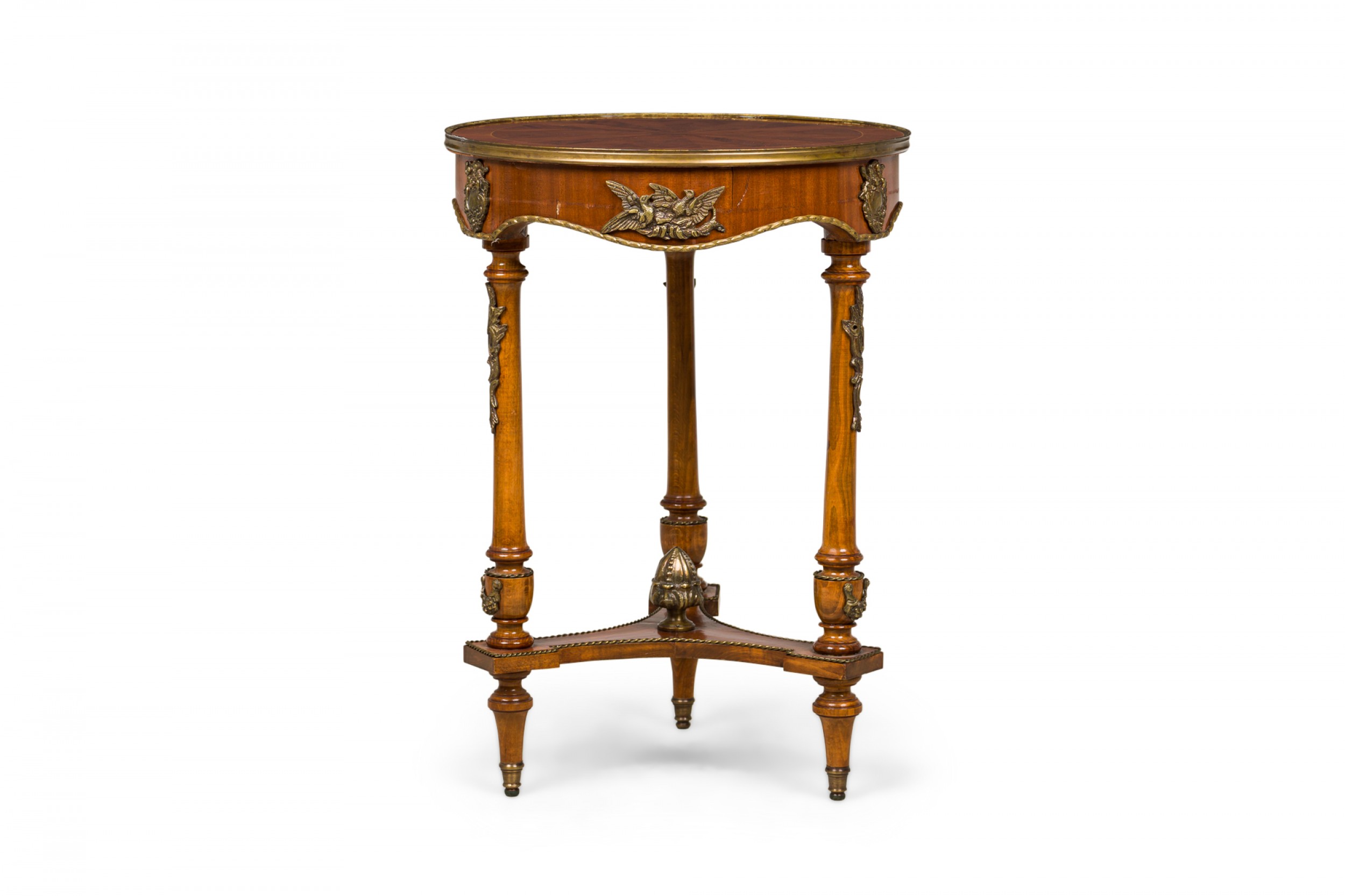 PAIR of French Victorian-style (20th Century) circular end / side tables featuring a starburst inlaid tops with applied faux rope brass trim border, eagle emblems and putti crests surrounding the shaped aprons, resting on 3 legs connected by a stretcher with pinecone finials with applied brass scroll & foliate embellishments. (PRICED AS PAIR)