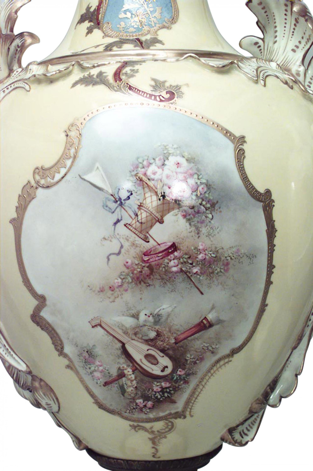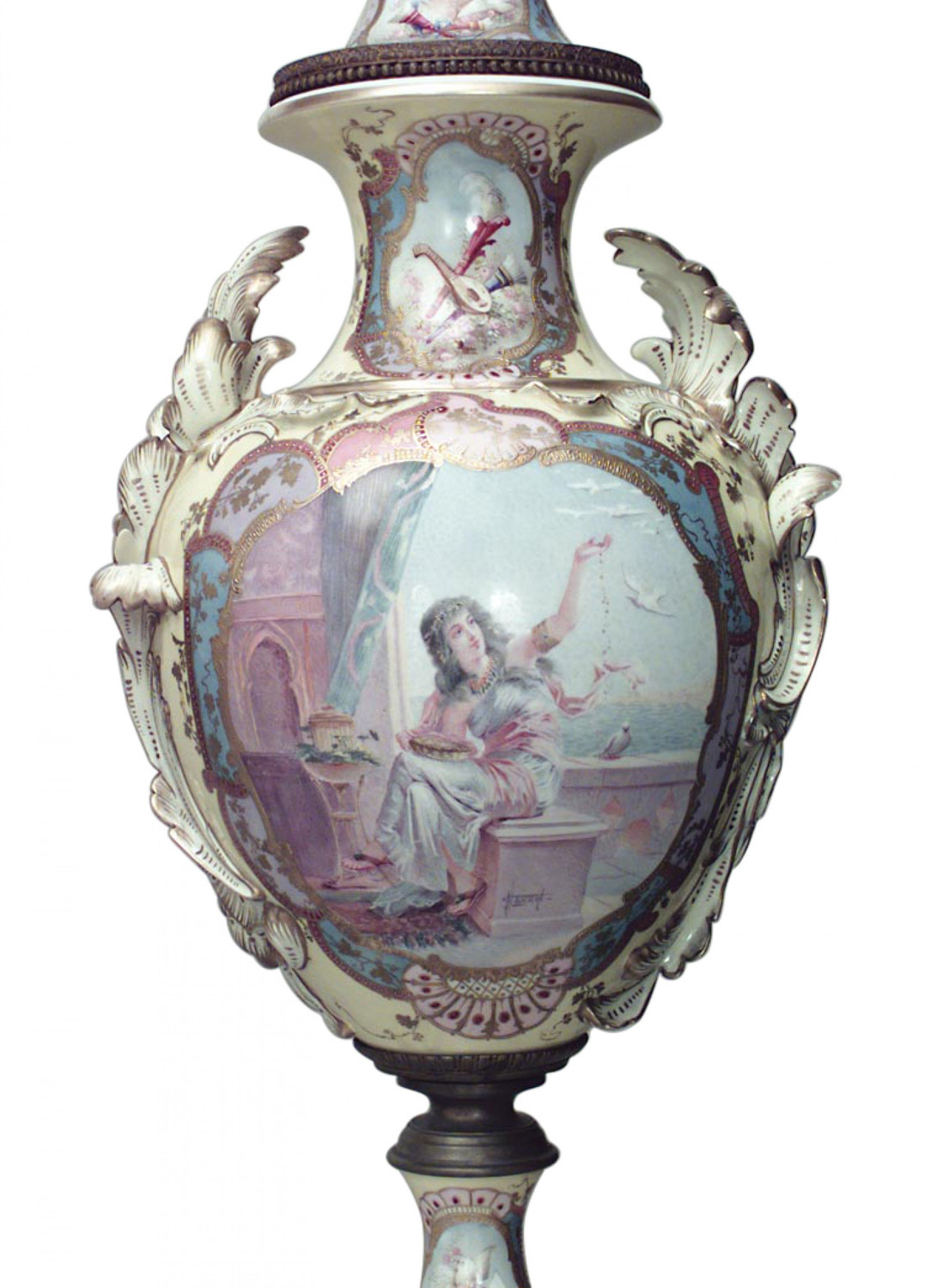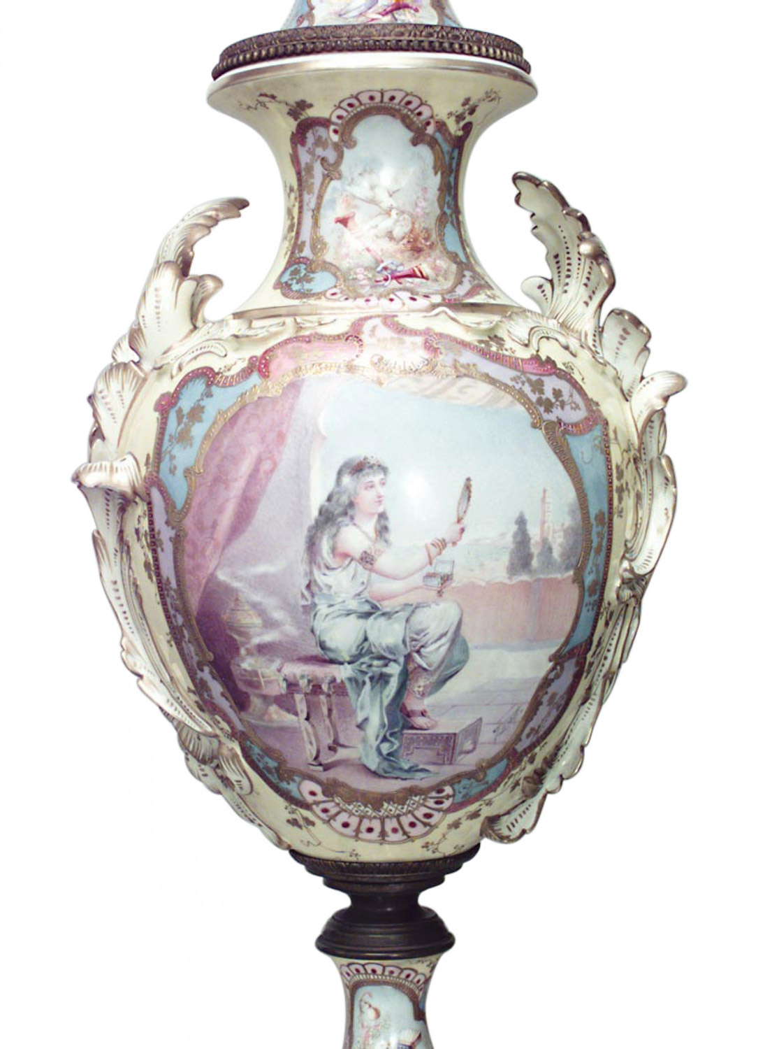PAIR of French Victorian monumental yellow Sevres porcelain vases with bronze base and acorn finial on cover with scenes of seated classical Greek lady. (PRICED AS PAIR)