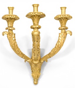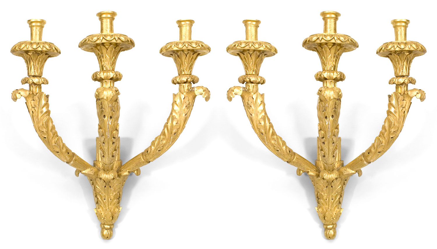 PAIR of Italian Neo-classic (19th Century) gilt wood floral carved wall sconces with 3 arms emanating from a floral carved base. (PRICED AS PAIR).