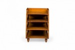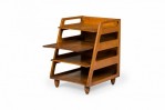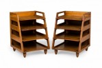 PAIR of American Mid-Century wooden magazine tables with square top surrounded on three sides with shallow galleries open on two sides above three lower compartments with curved shelf fronts. (KITTINGER FURNITURE COMPANY)(PRICED AS PAIR)
