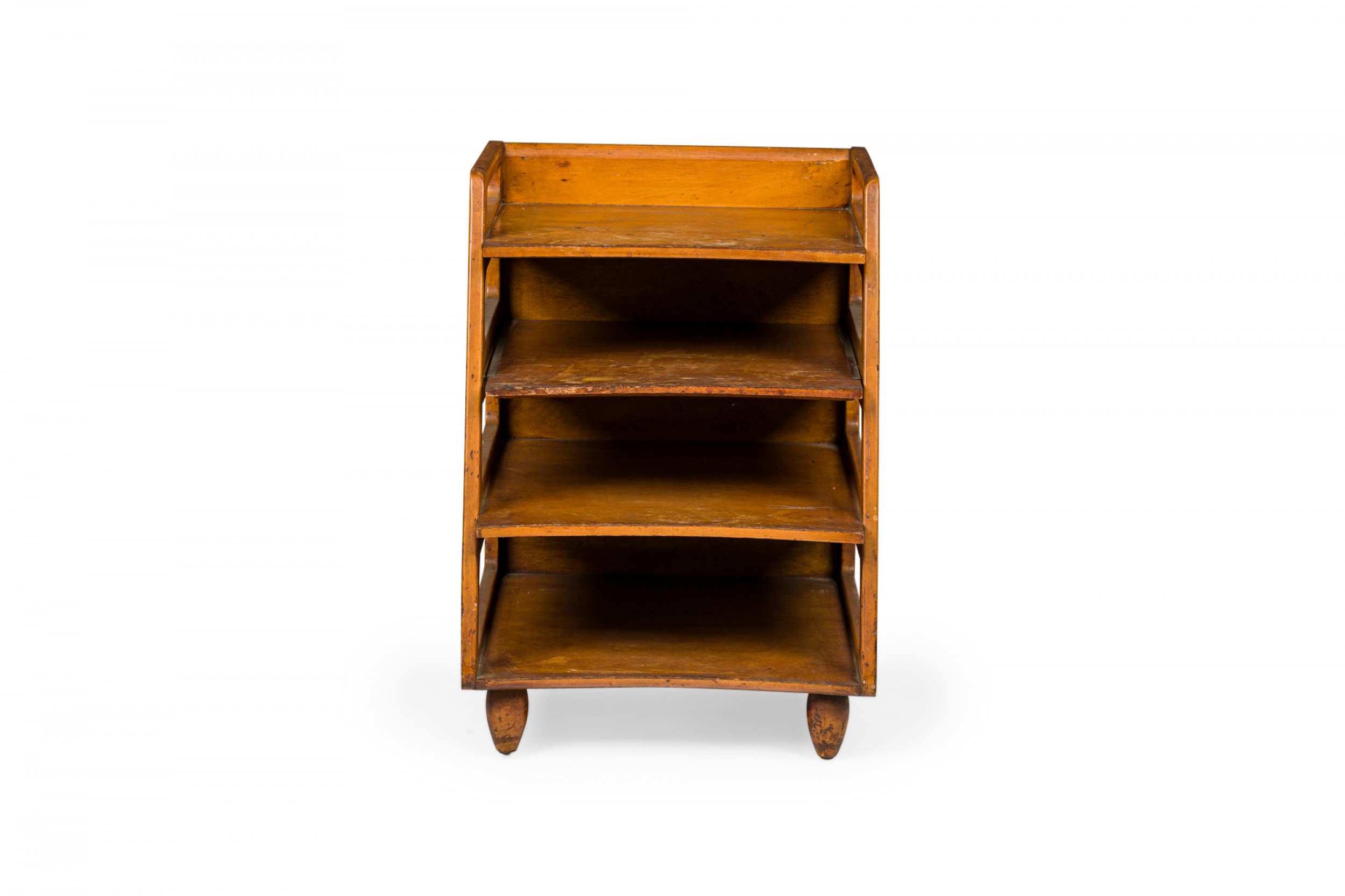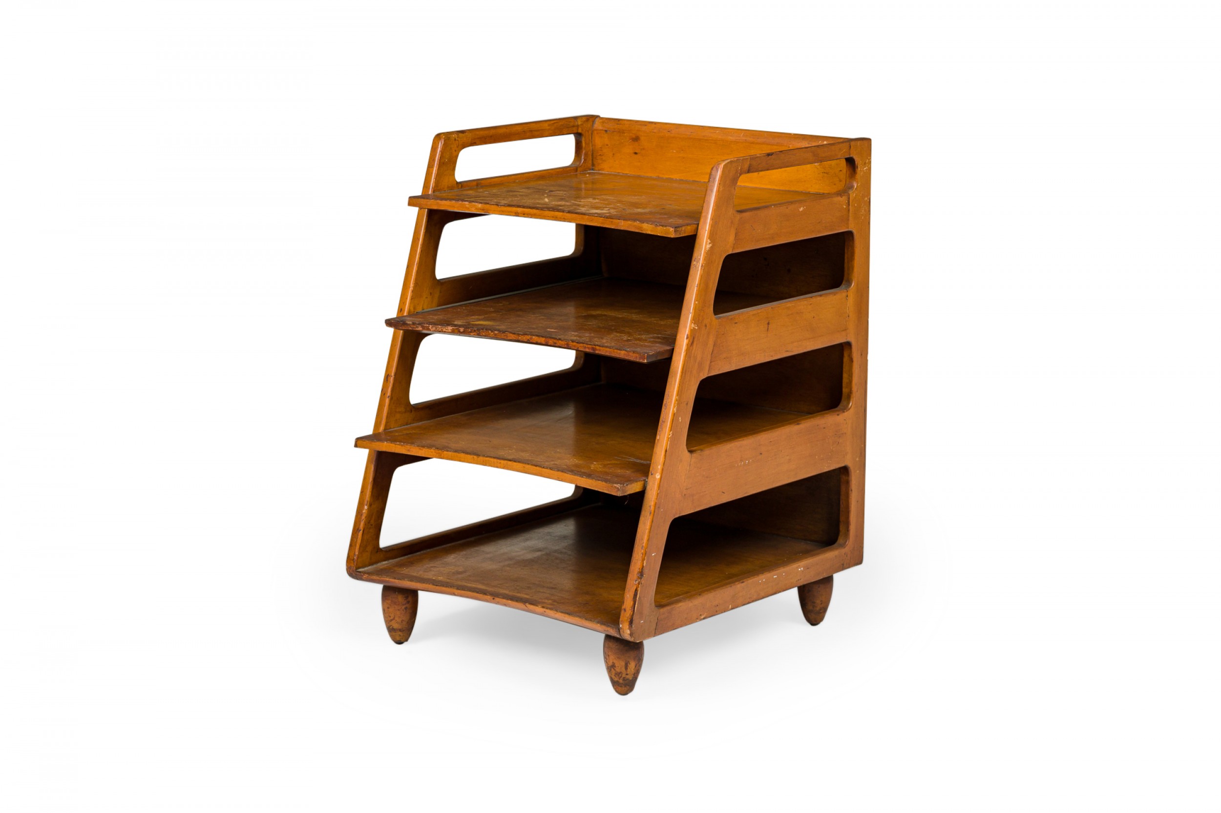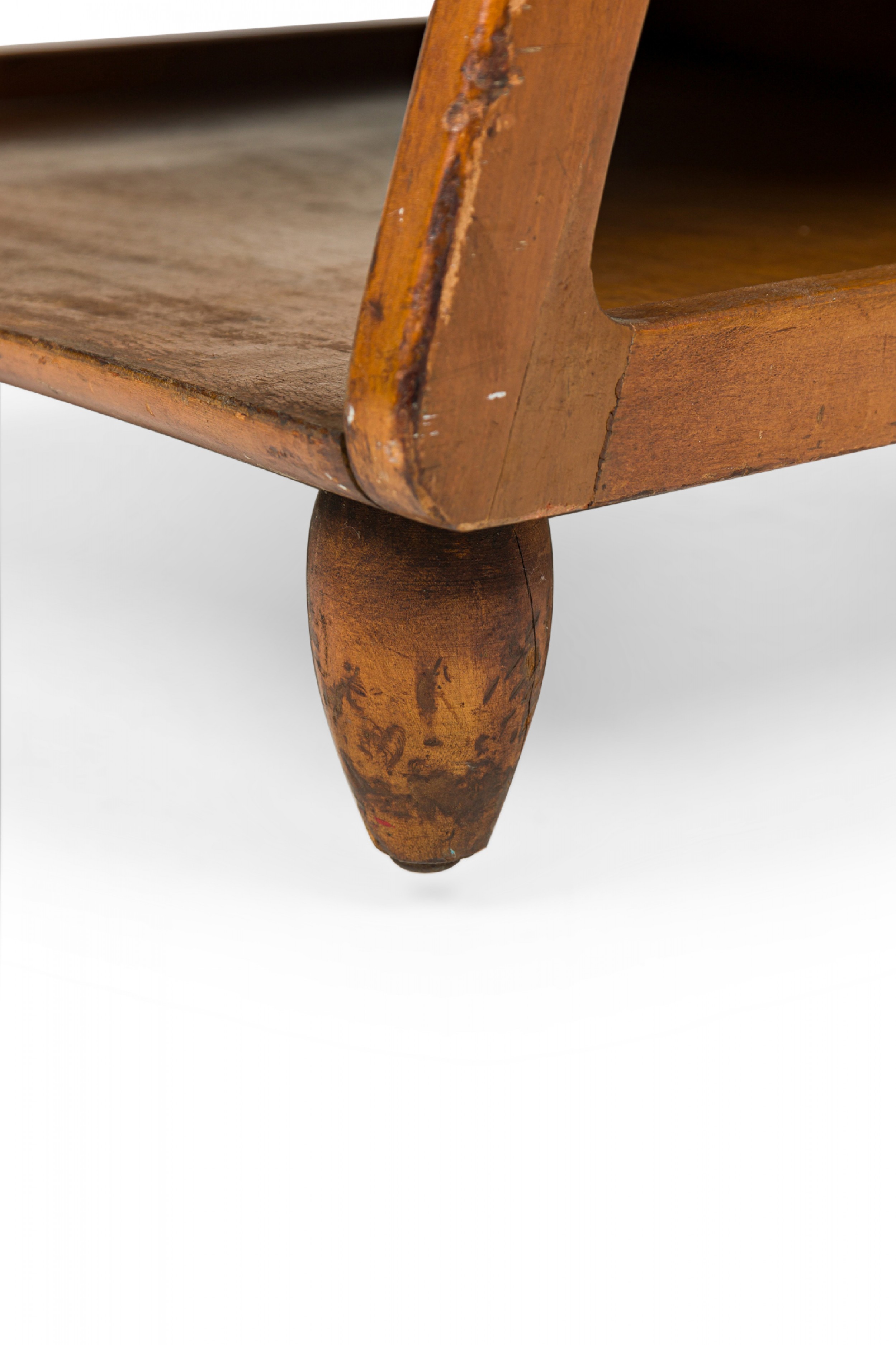 PAIR of American Mid-Century wooden magazine tables with square top surrounded on three sides with shallow galleries open on two sides above three lower compartments with curved shelf fronts. (KITTINGER FURNITURE COMPANY)(PRICED AS PAIR).