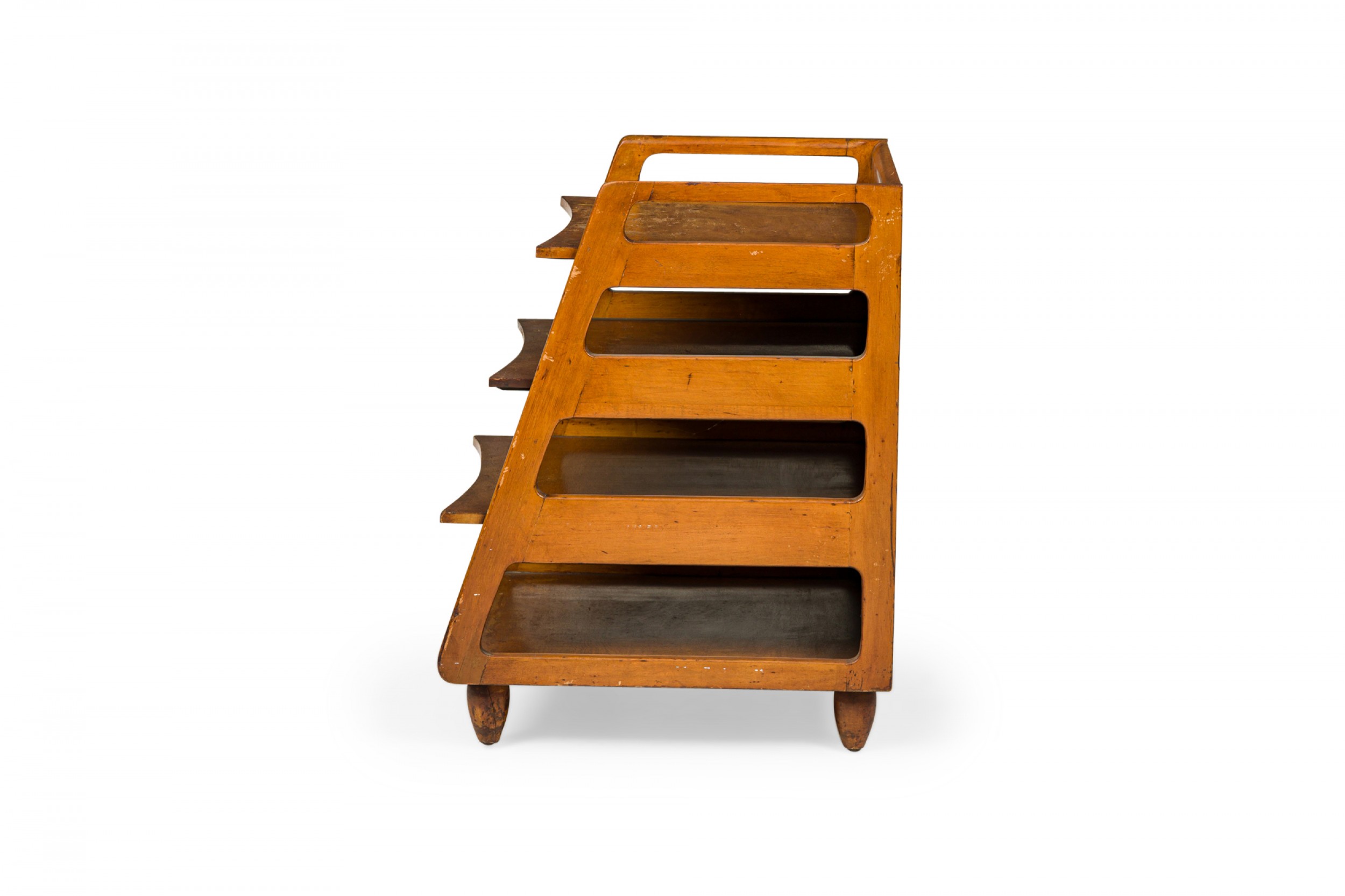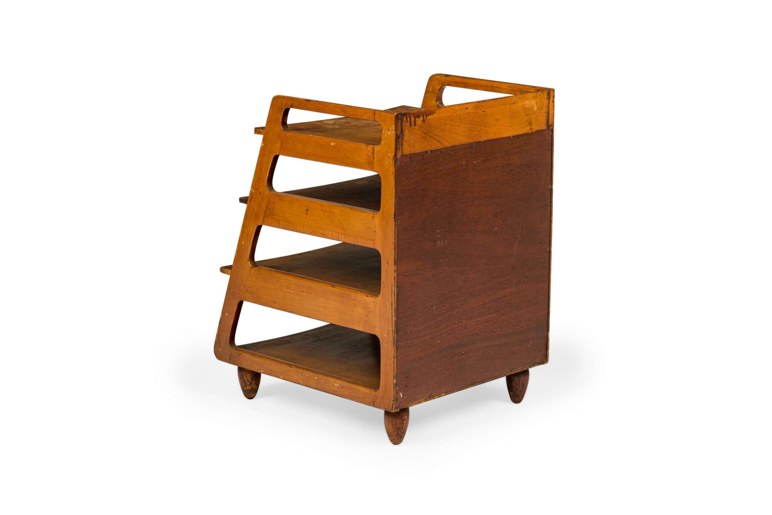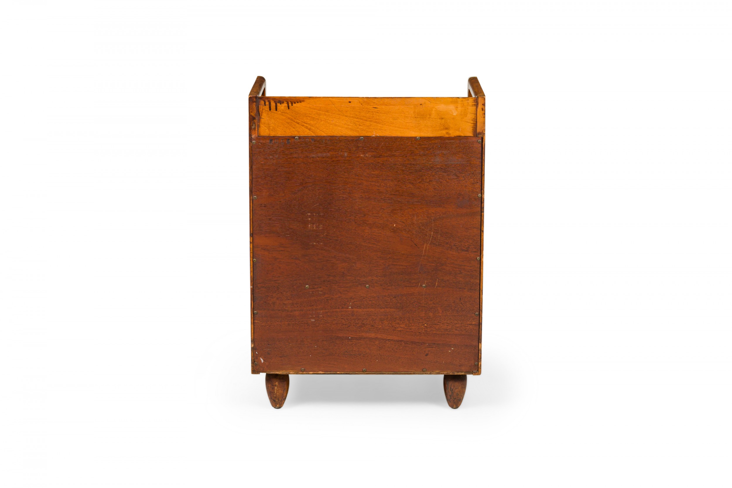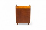 PAIR of American Mid-Century wooden magazine tables with square top surrounded on three sides with shallow galleries open on two sides above three lower compartments with curved shelf fronts. (KITTINGER FURNITURE COMPANY)(PRICED AS PAIR).