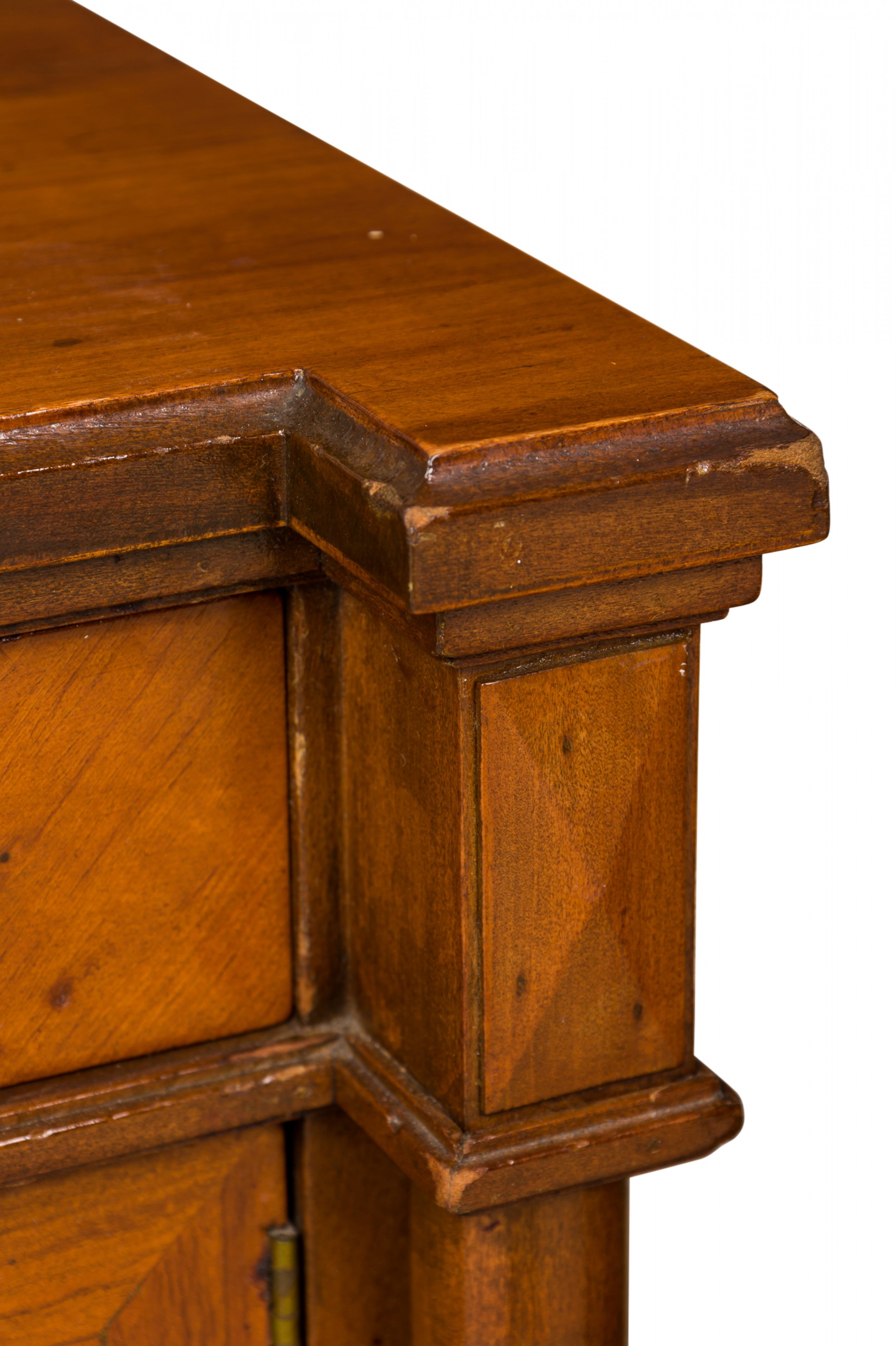 PAIR of French Louis XVI-style (1st half 20th Century) bedside table / commodes with striped parquetry veneer in a diamond pattern, a shallow upper drawer above a compartment with a hinged door, above an open lower compartment, with bronze floral patterned drawer pulls, resting on curved cylindrical legs. (PRICED AS PAIR)