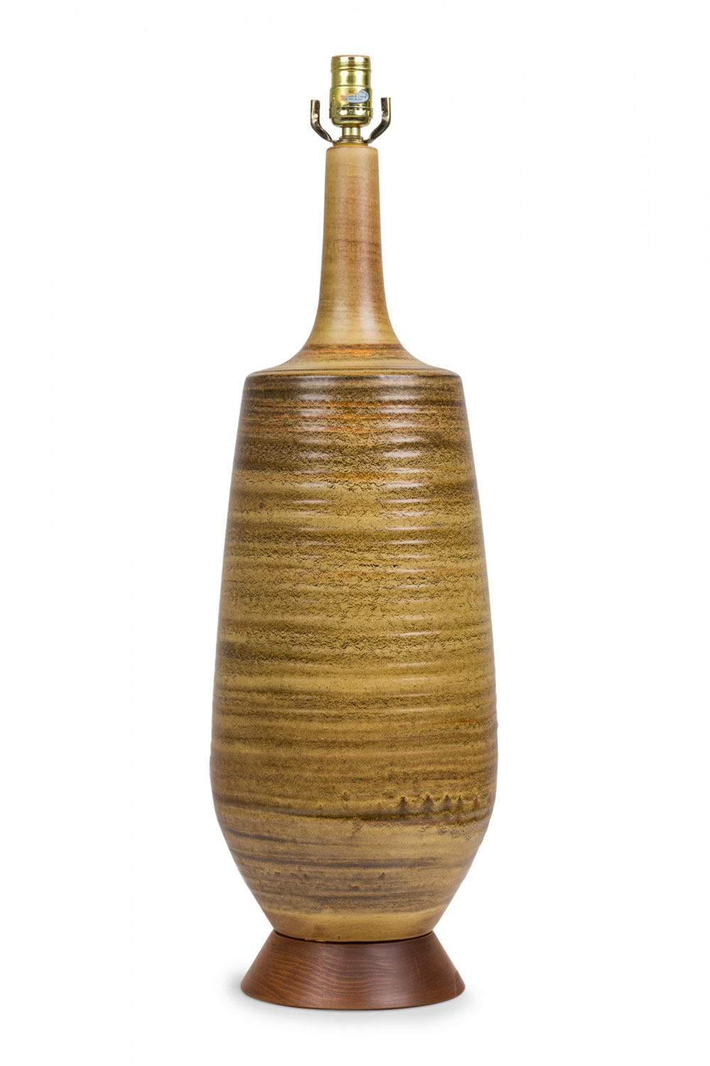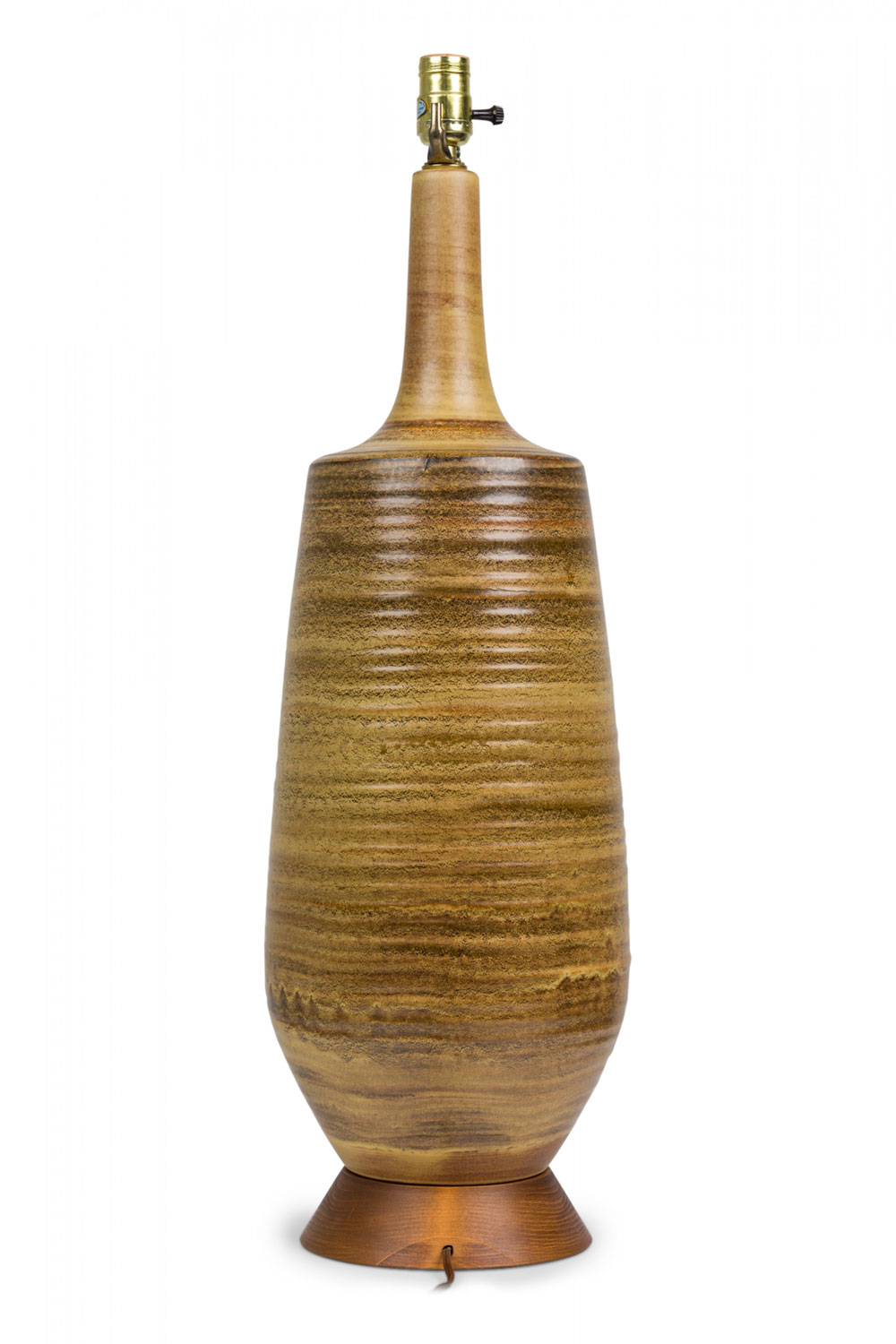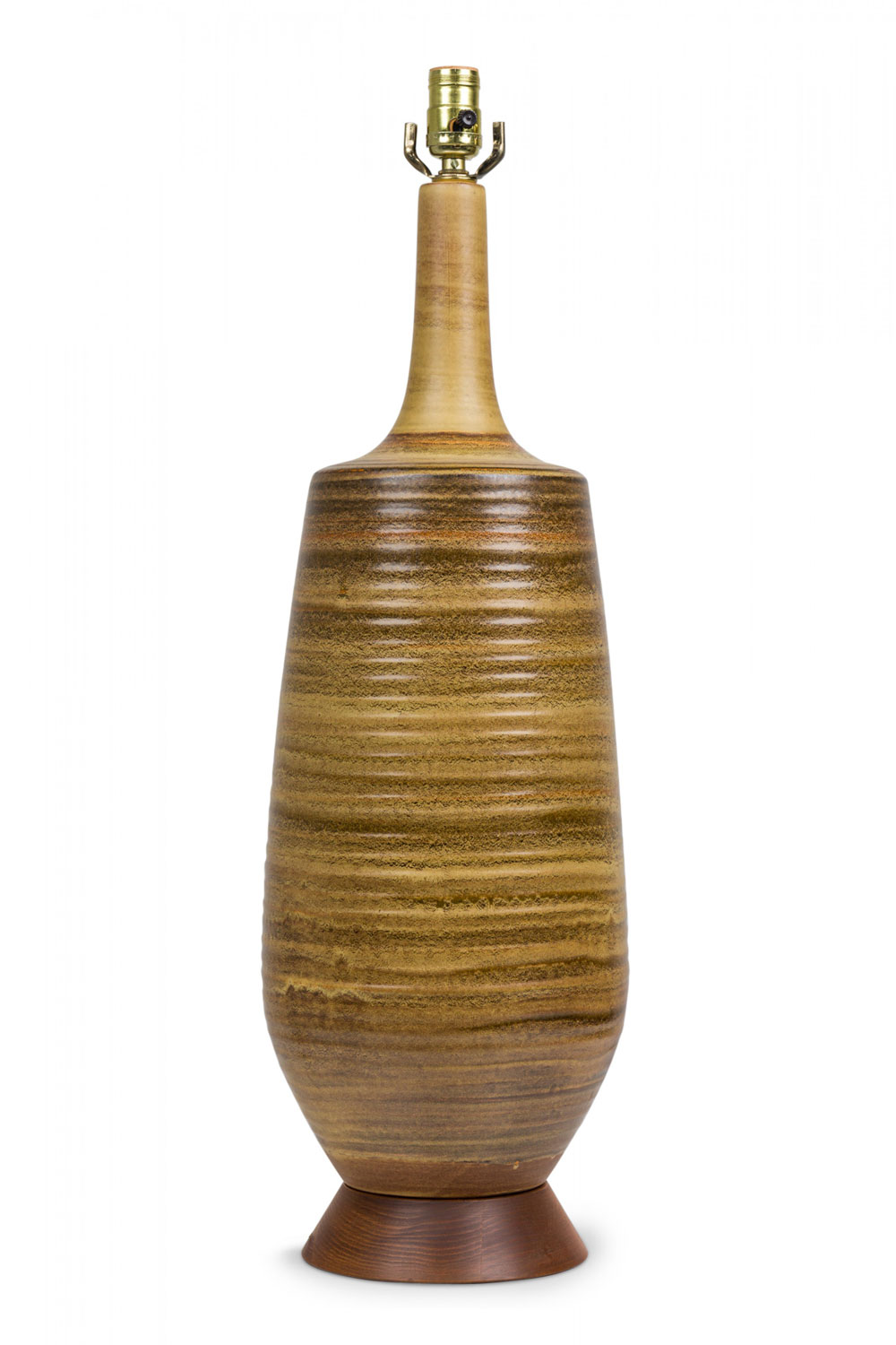 PAIR of Mid-Century American ceramic table lamps in tapered ovoid ribbed form with flattened shoulders which narrow at the neck, both housing functioning light switch sockets. An earthy brown-toned stippled "Earth Glaze" envelops the body in descending horizontal wave patterns, both mounted on tapered, molded wood bases. (PRICED AS PAIR).